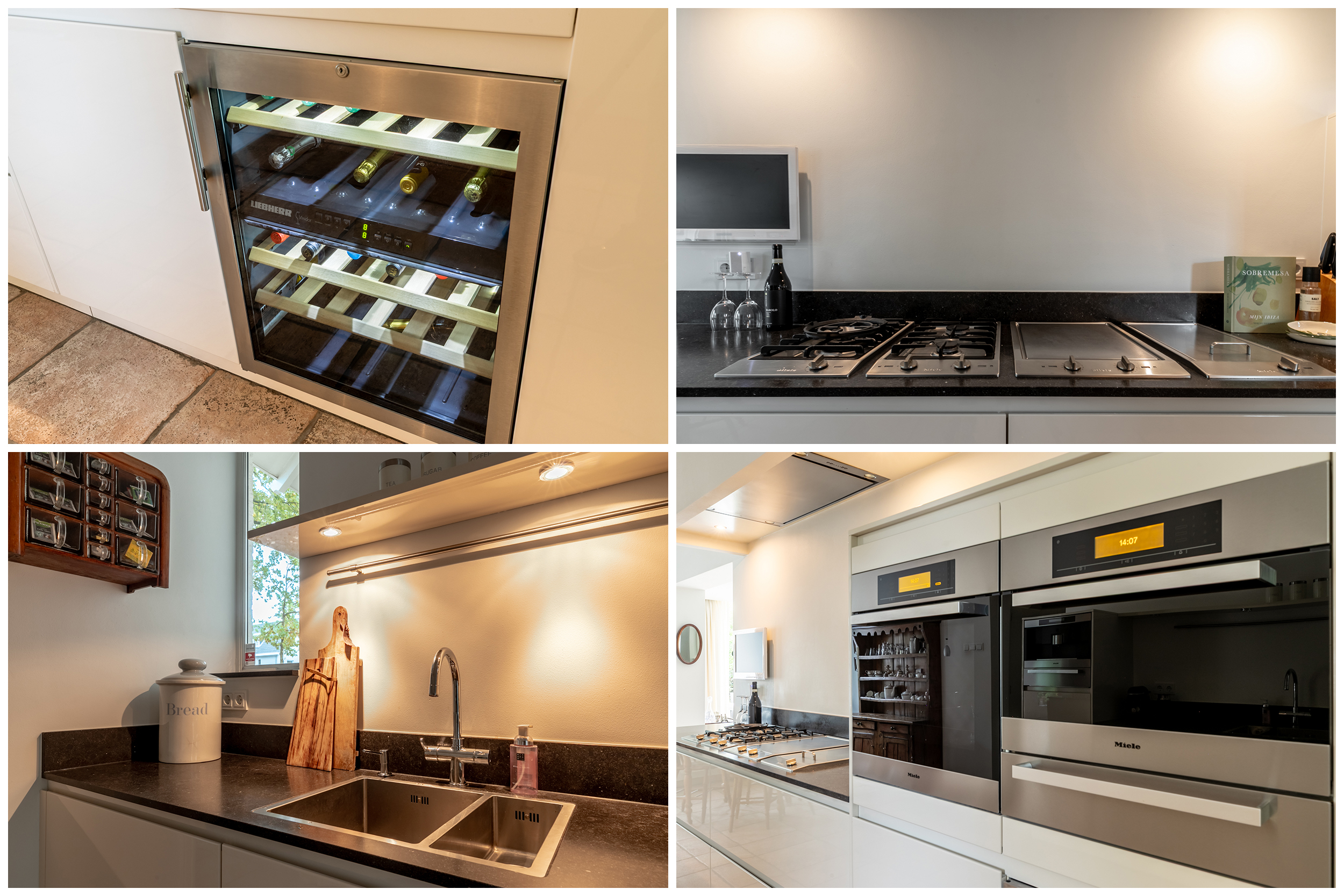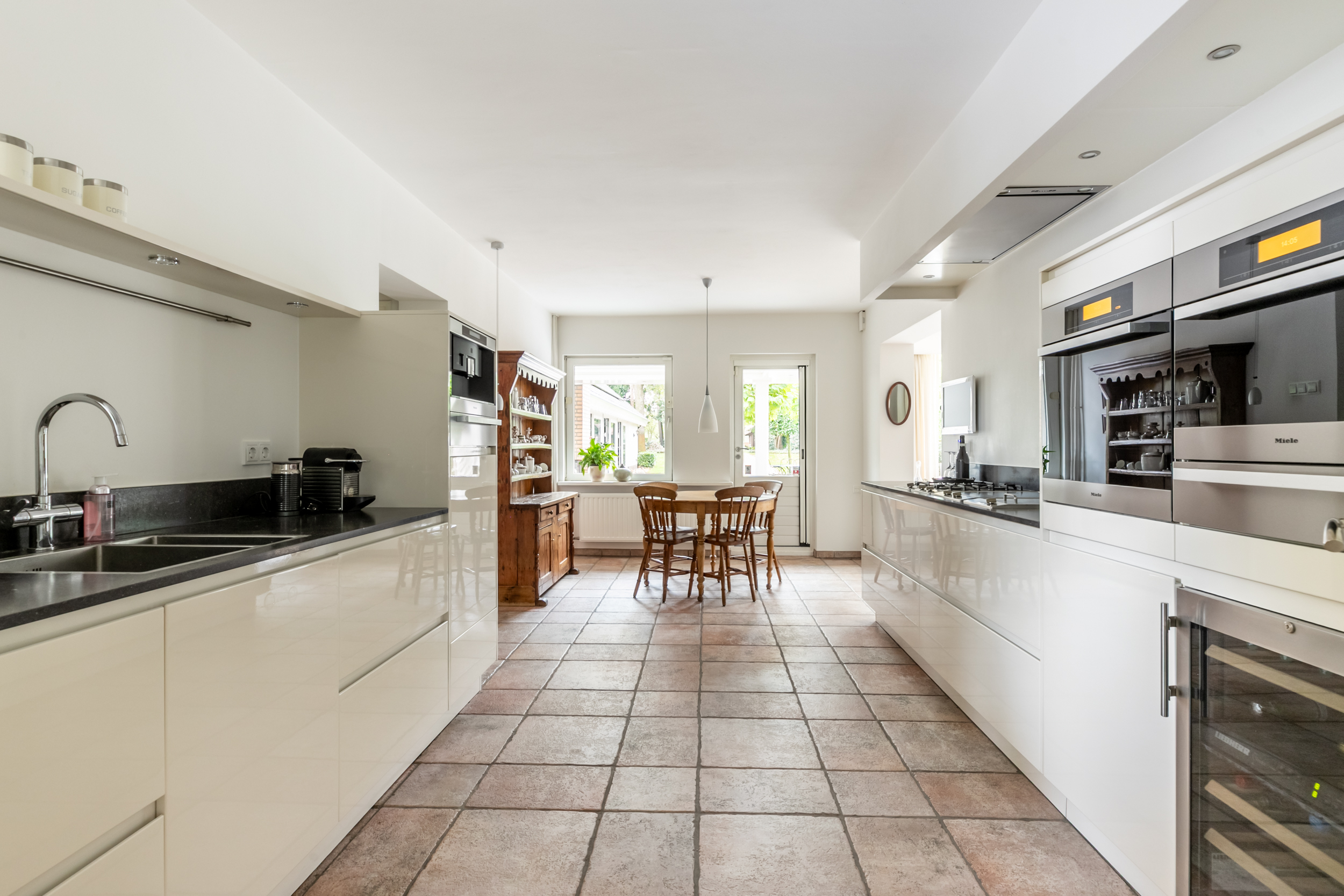 Zeer complete luxueuze woonkeuken met hoogwaardig A-merk inbouwapparatuur, royaal werkblad en praktische opbergmogelijkheden grenzend aan een praktische bijkeuken.