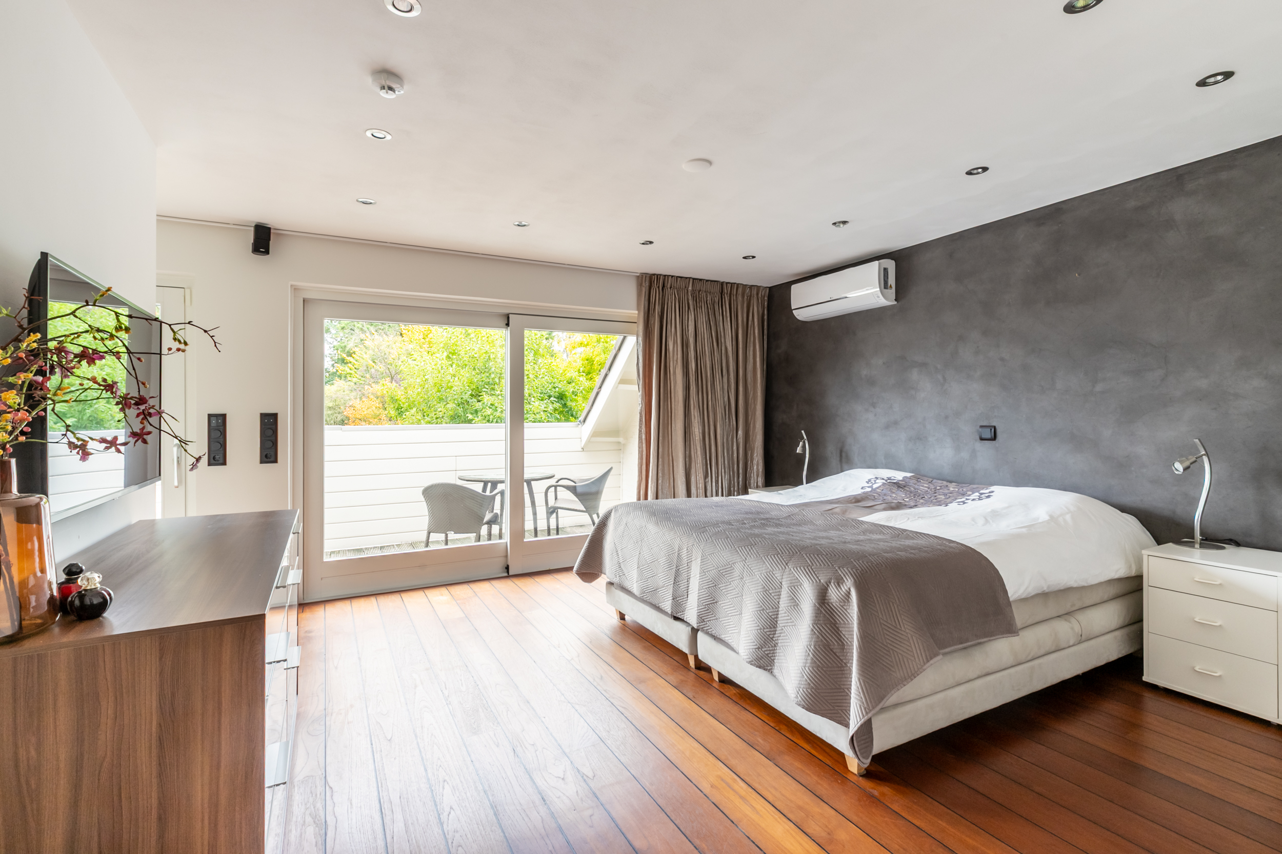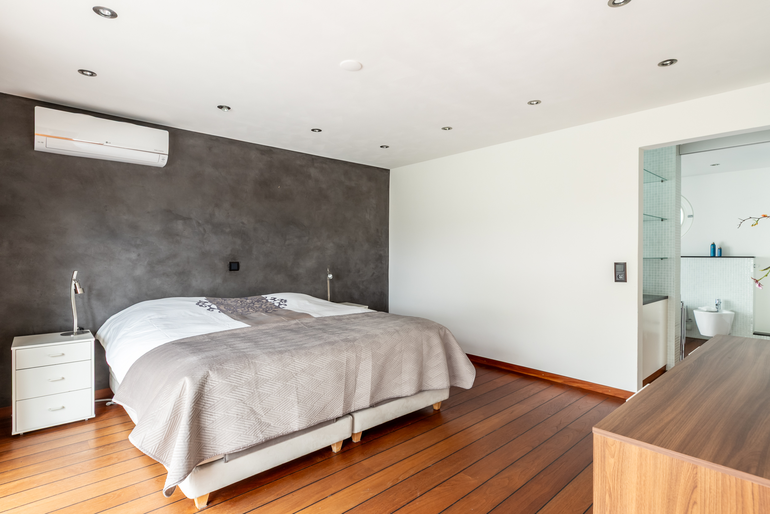 Hoofdslaapkamer met airco grenzend aan het balkon met walk-in-closet en eigen luxe badkamer met twee persoons whirlpool, stoomdouche voor 2 personen, toilet, bidet en dubbele wastafel.
