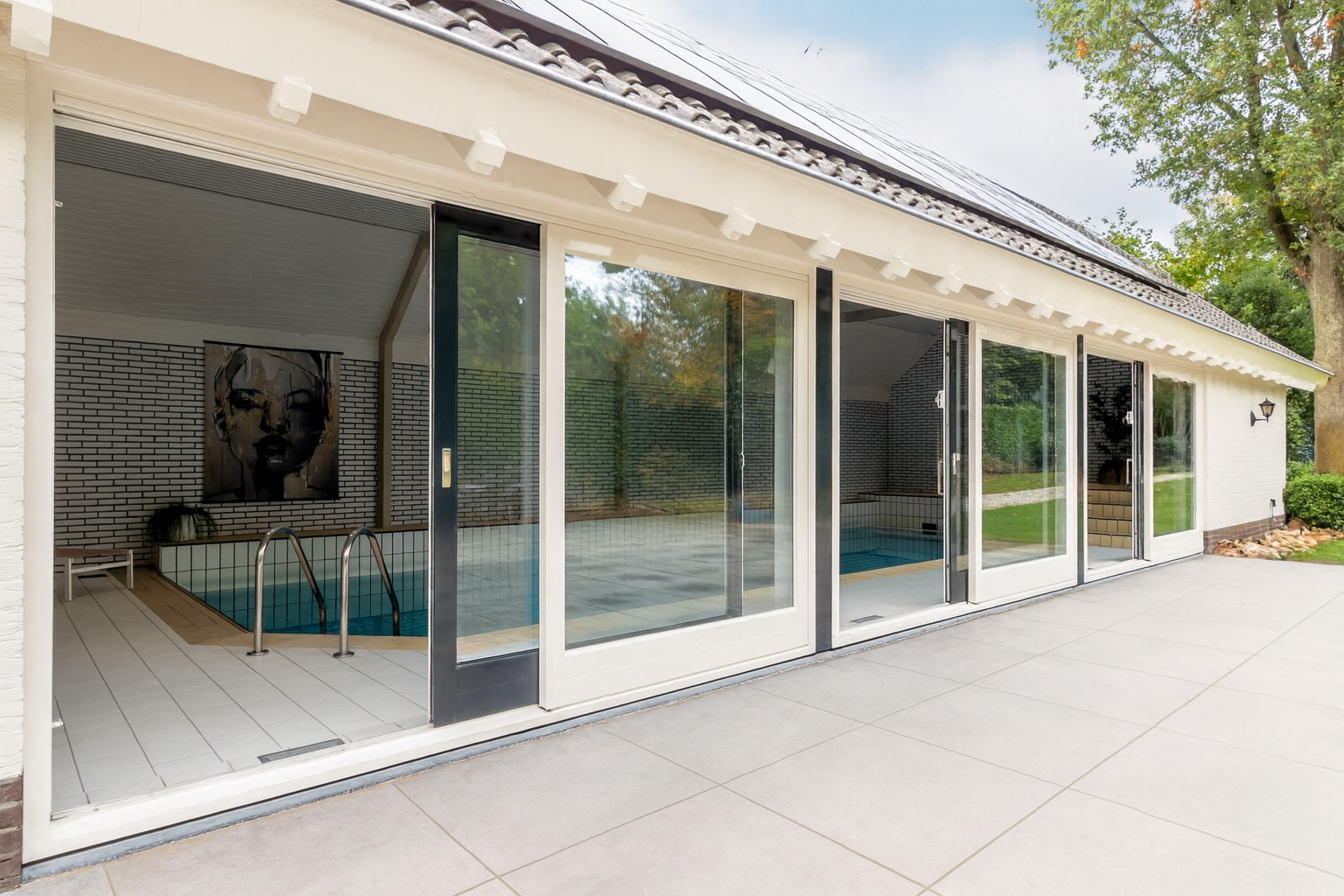 - Mechanische ventilatie, alarminstallatie, rolluiken, tv-kabel, zwembad, airconditioning, stoomcabine, rookkanaal, schuifpui, frans balkon, sauna, glasvezel kabel en zonnepanelen