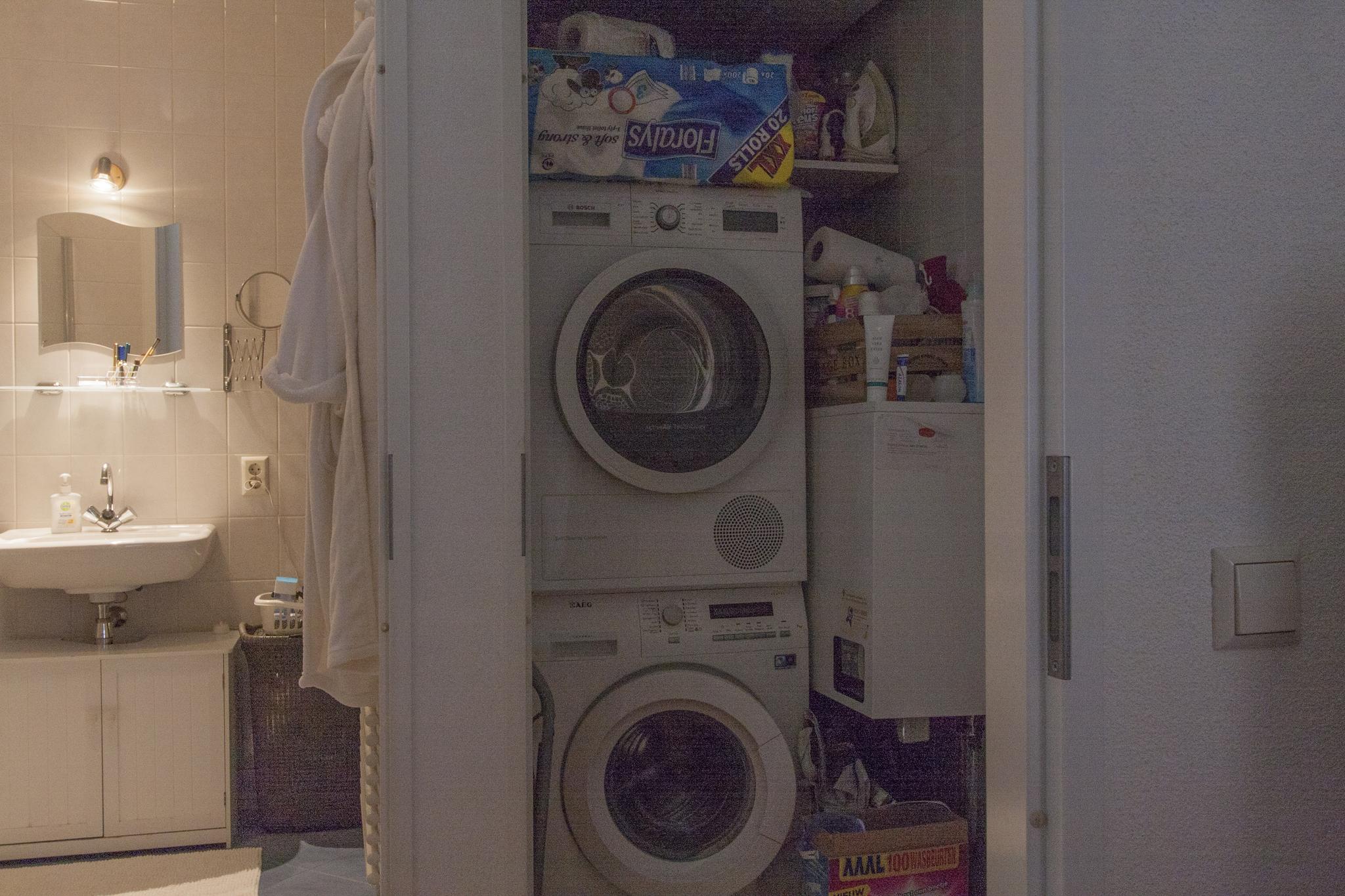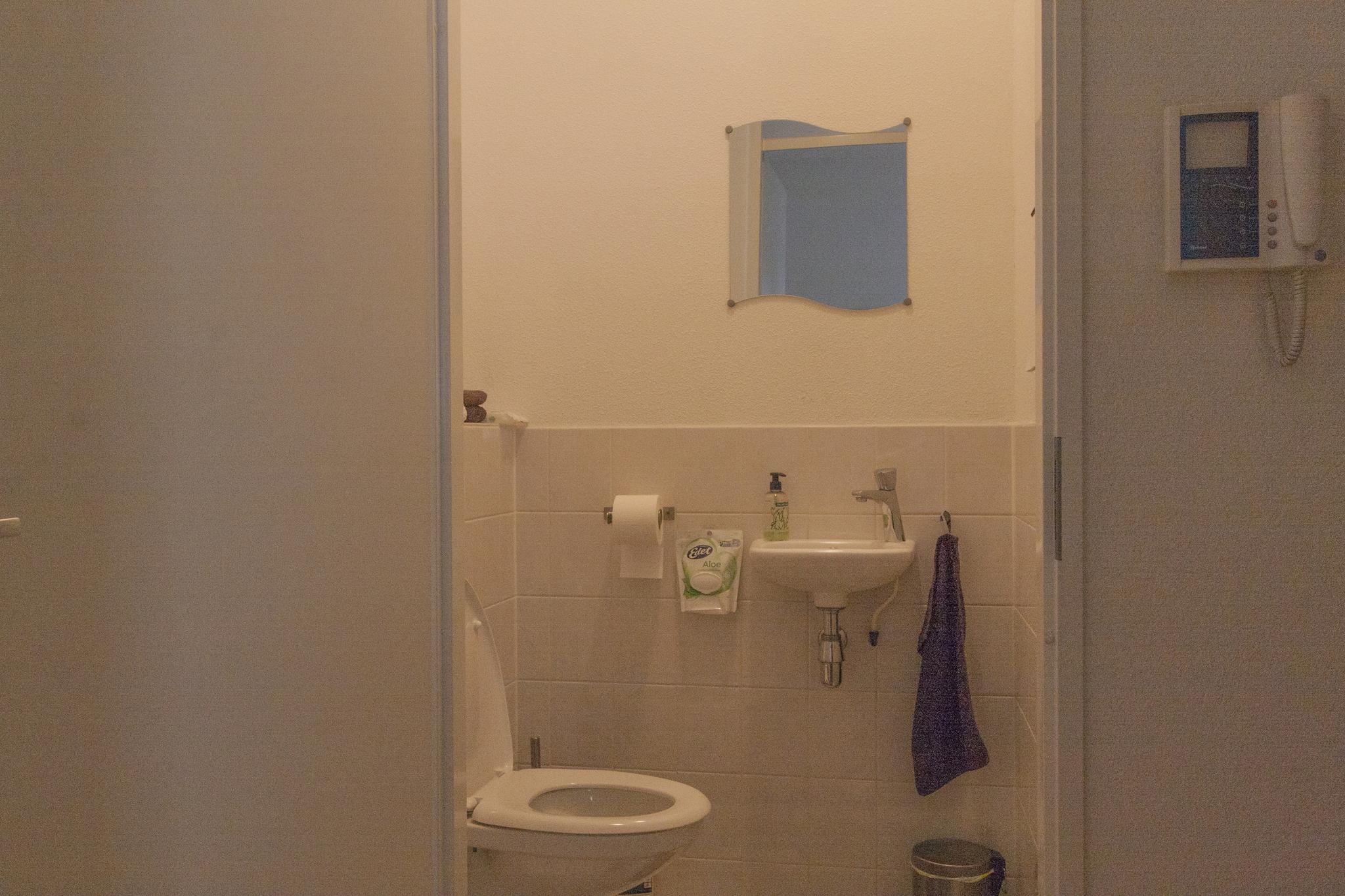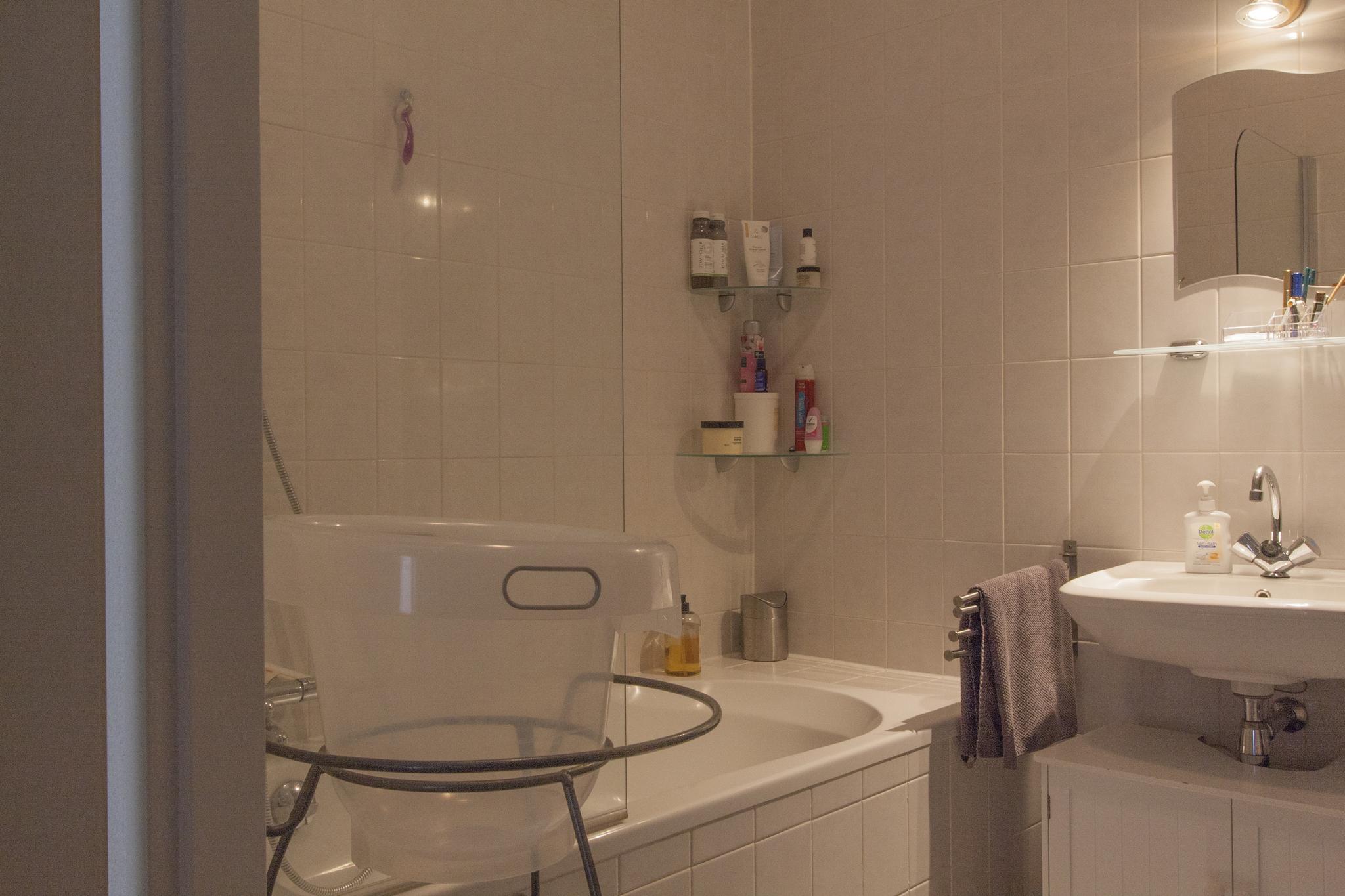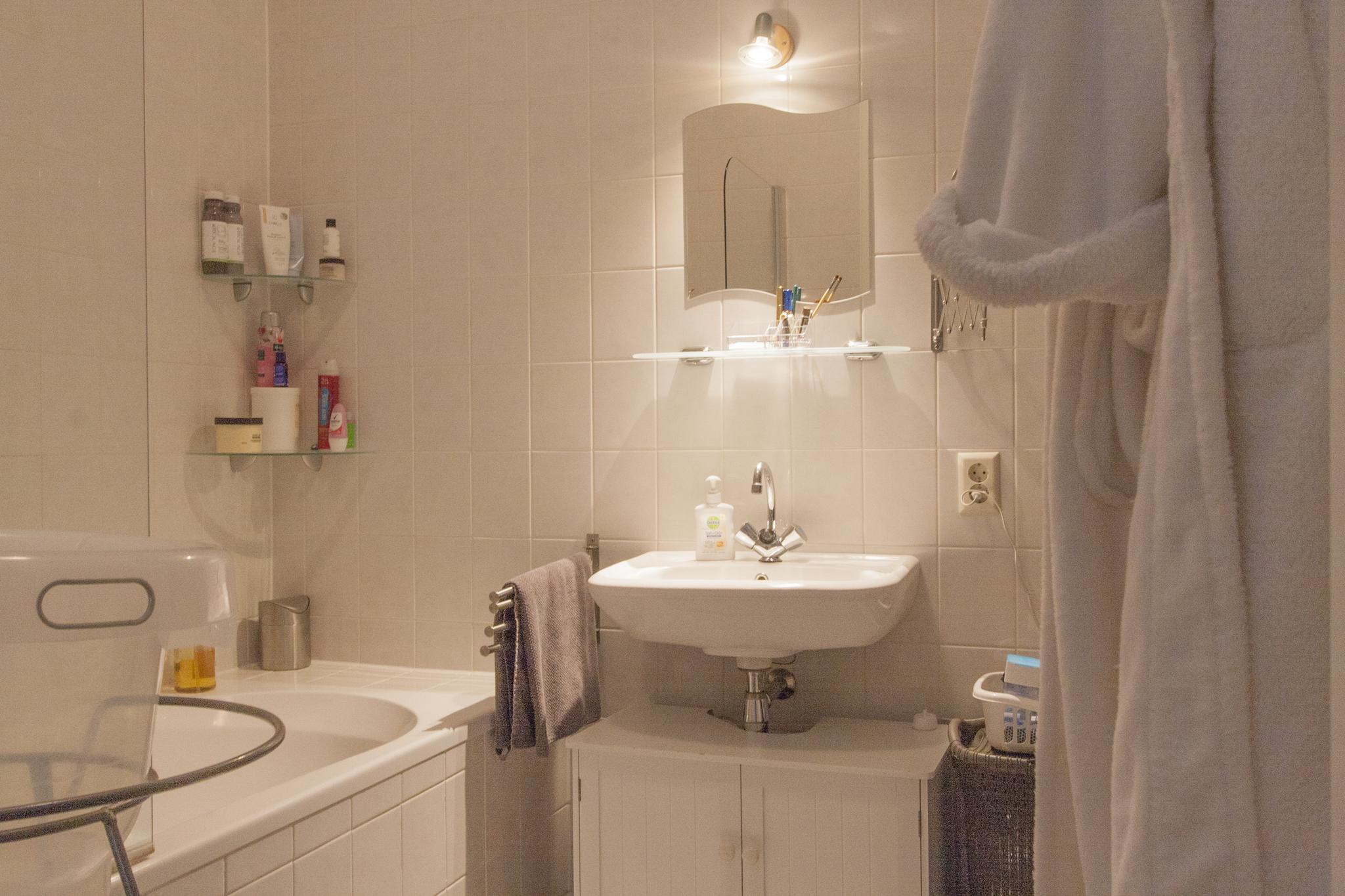 De volledig betegelde badkamer is ruim van opzet en is voorzien van een ligbad met douche, wastafel en een radiator. De separate toiletruimte is voorzien van een zwevend toilet en een fonteintje. Vanuit de hal bereikt u de praktische berging met aansluitmogelijkheid voor wasapparatuur, opstelling warmte-unit en mechanische ventilatie-unit.