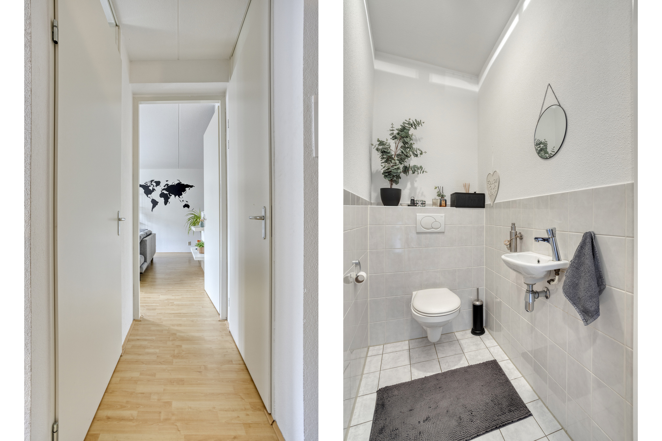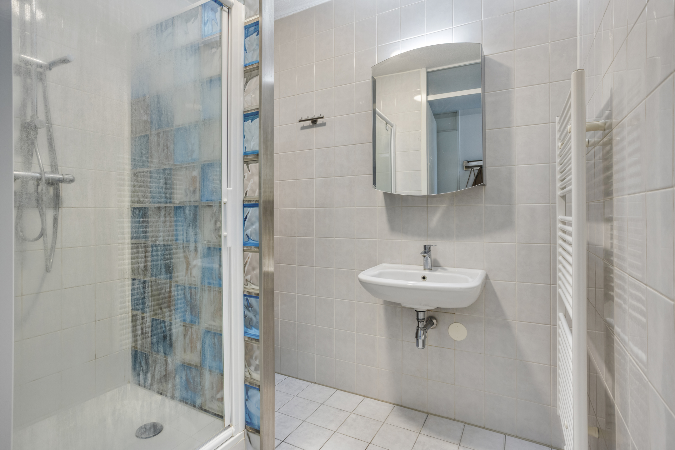De volledig betegelde badkamer is ruim van opzet en is voorzien van een inloopdouche, wastafel, spiegel en een designradiator. De separate toiletruimte is voorzien van een zwevend closet en een design fonteintje. Vanuit de hal bereikt u de praktische berging met aansluitmogelijkheid voor wasapparatuur, opstelling warmte-unit en mechanische ventilatie-unit.