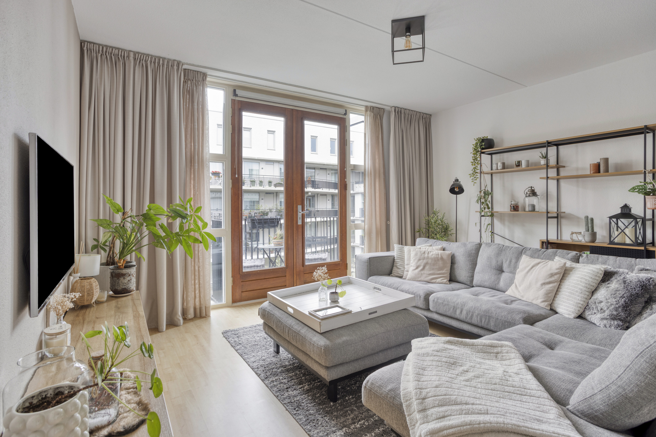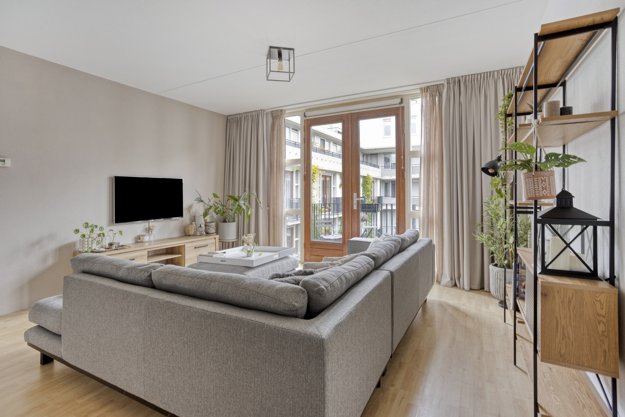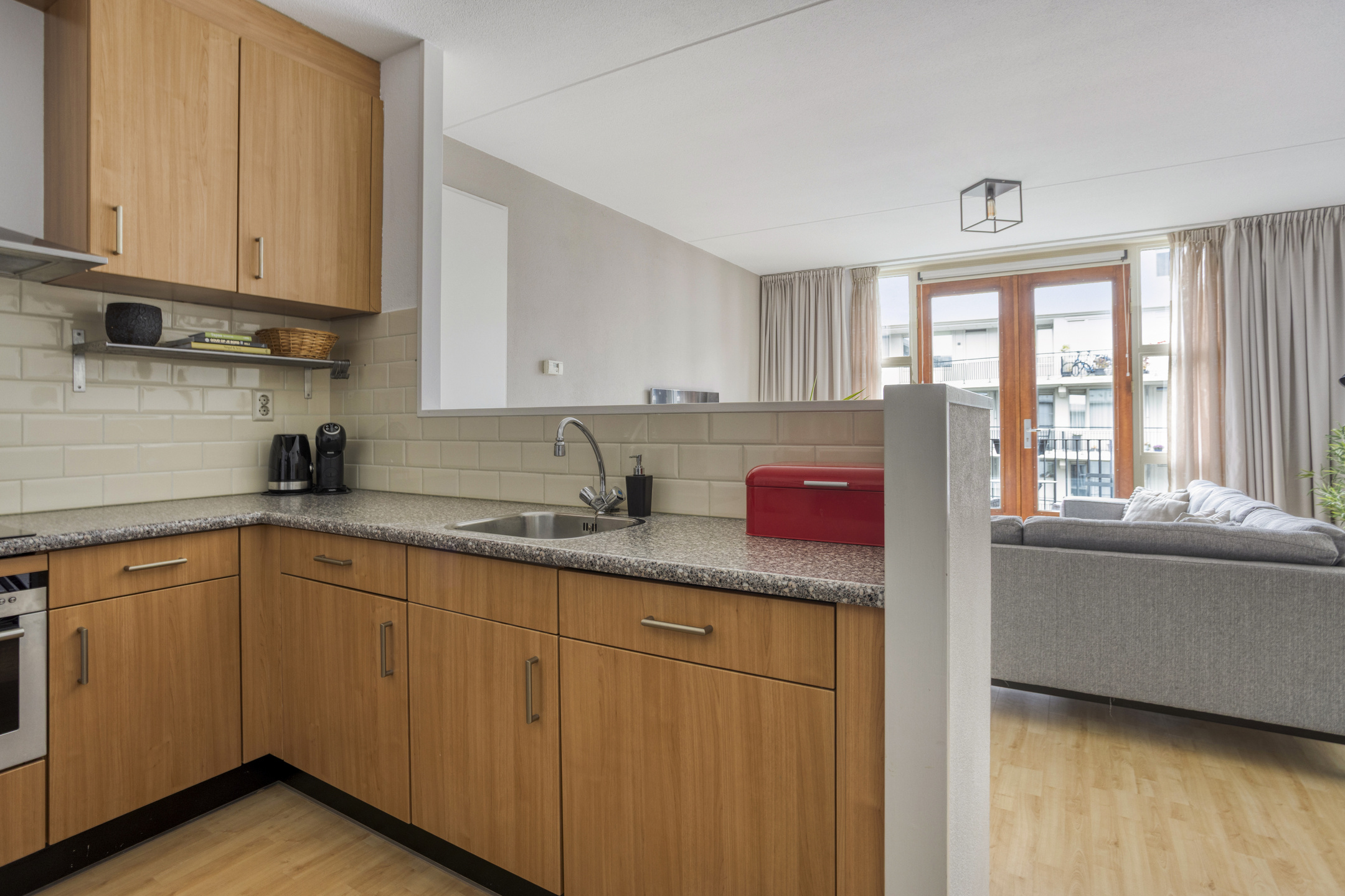 De entree van het appartement ligt op de 3de verdieping aan de goed verzorgde portiek. De ruimtelijke opzet zorgt voor een prettige binnenkomst. Het gehele appartement is voorzien van een hoogwaardige laminaatvloer in lichte kleurstelling en uitstekend onderhouden. De prettige lichtinval, doordat het appartement op de derde verdieping is gelegen, is kenmerkend voor dit schitterende appartement. De ruime, lichte woonkamer met grote raampartijen biedt toegang tot een van de twee franse balkons. Vanuit de woonkamer is er toegang tot de moderne halfopen keuken met moderne bar en is voorzien van diverse inbouwapparatuur zoals o.a. een vaatwasser, RVS afzuigkap, combimagnetron en een inductie kookplaat. Allen A-merken.