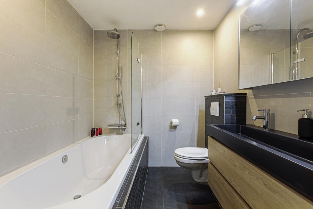 - Ligbad, toilet, dubbele wastafel en wastafelmeubel