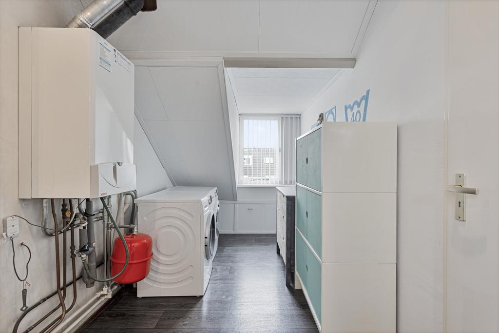 Via een vaste trap te bereiken voorzolder met de opstelling van de combiketel, dakkapel en aansluiting voor de wasmachine en de droger. Ruime zolderkamer met dakkapel en luik naar de extra bergzolder.