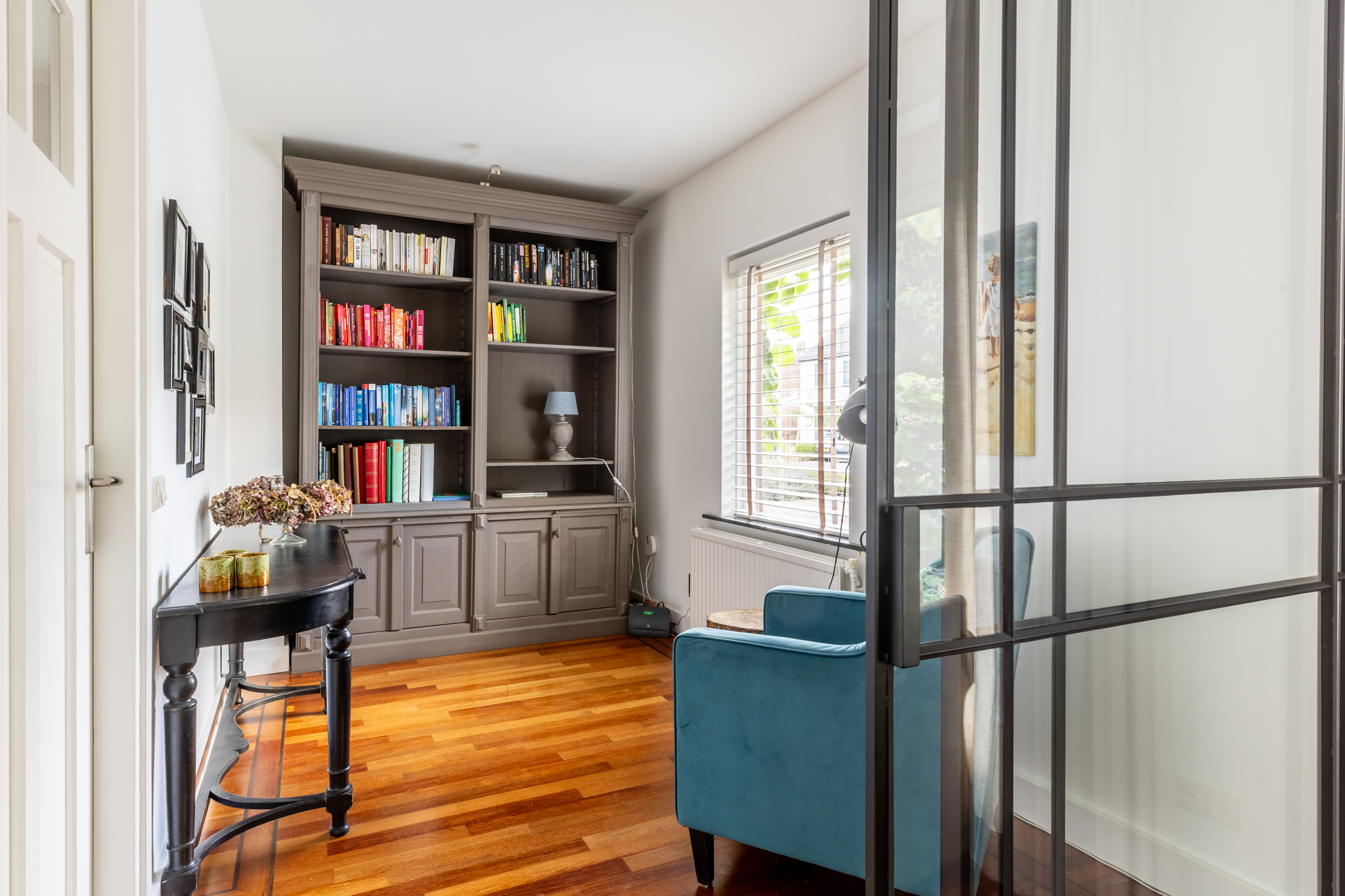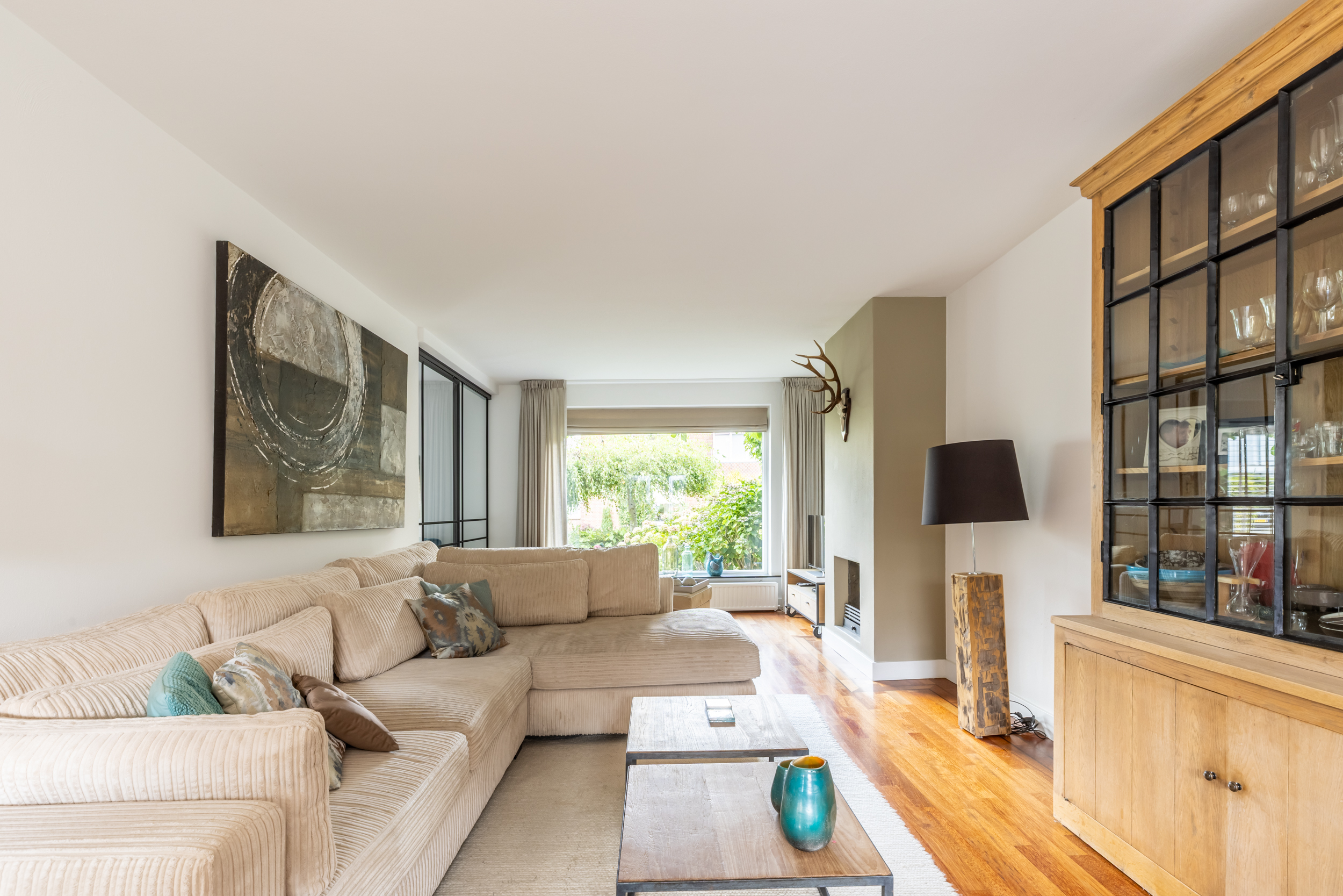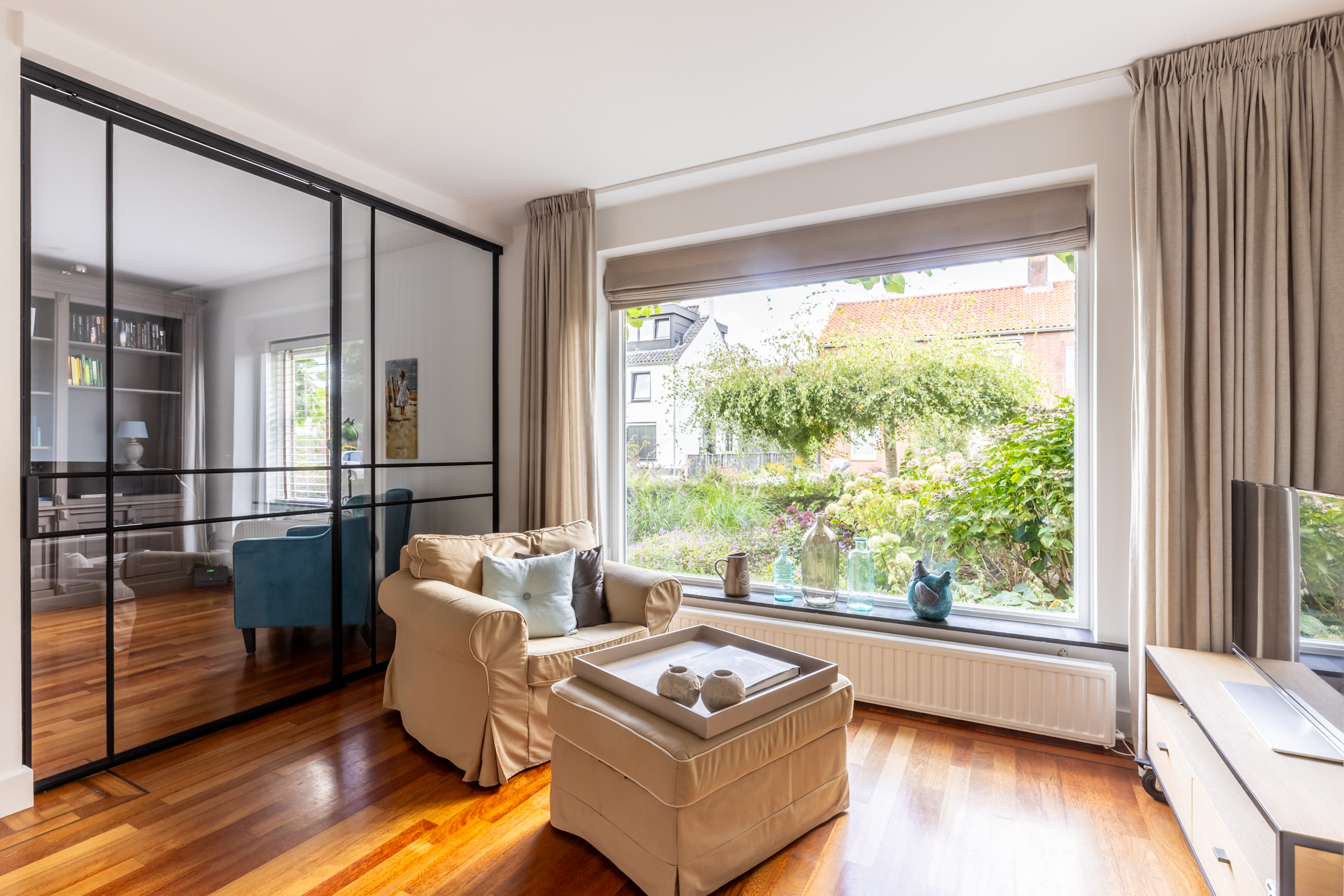 De woonkamer heeft een fraaie zwarte pui, waardoor er een afscheiding is ontstaan tussen de studeerkamer en de woonkamer. De woonkamer is voorzien van een sfeervolle schouw en biedt volop ruimte voor een comfortabele zithoek en dankzij de grote raampartijen geniet je hier van natuurlijke lichtinval.