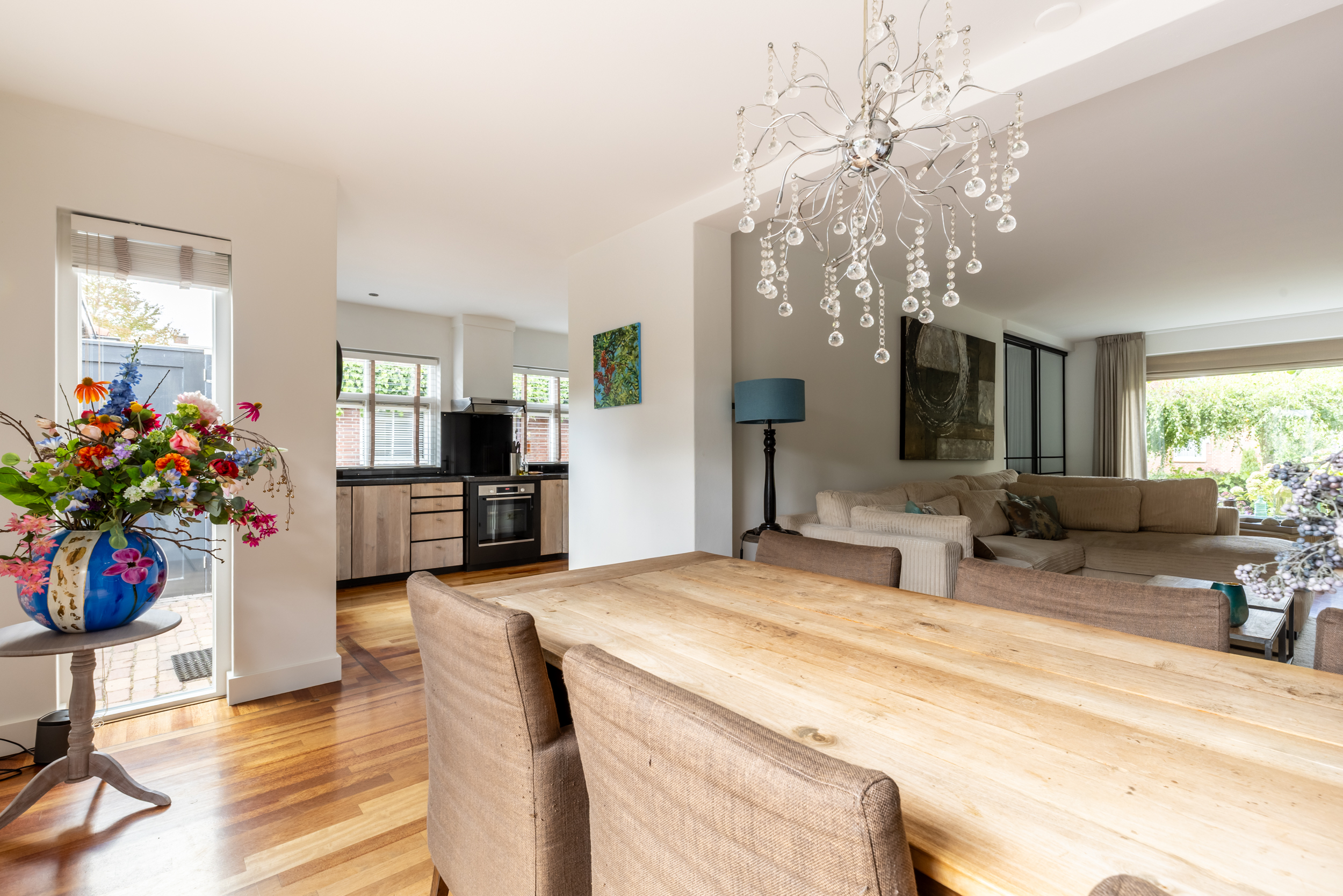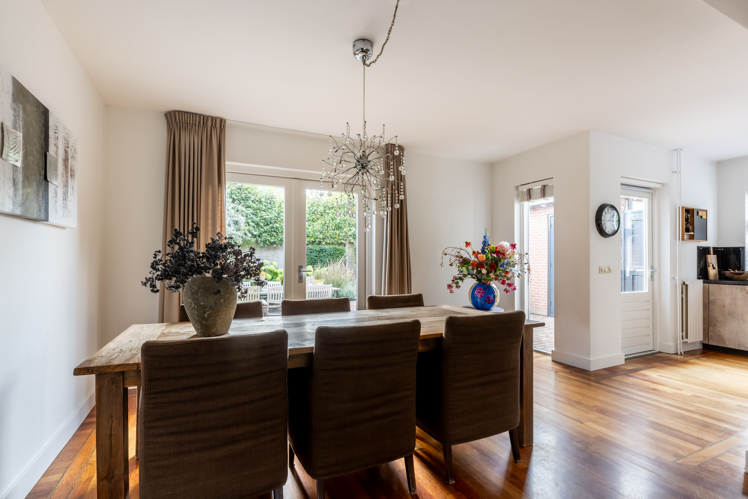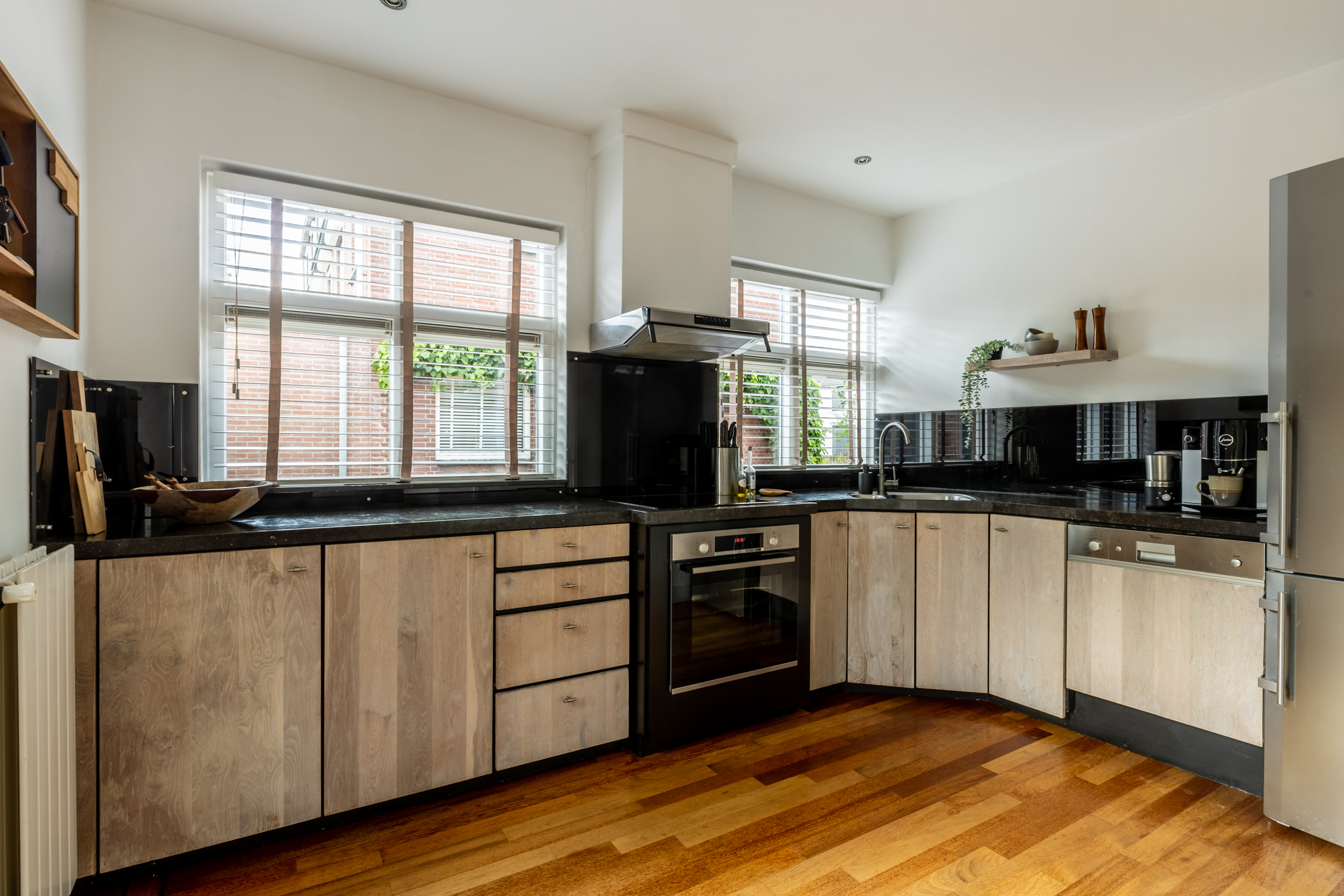 De gehele begane grond is voorzien van een massief houten vloer, wat zorgt voor een warme en uniforme uitstraling.