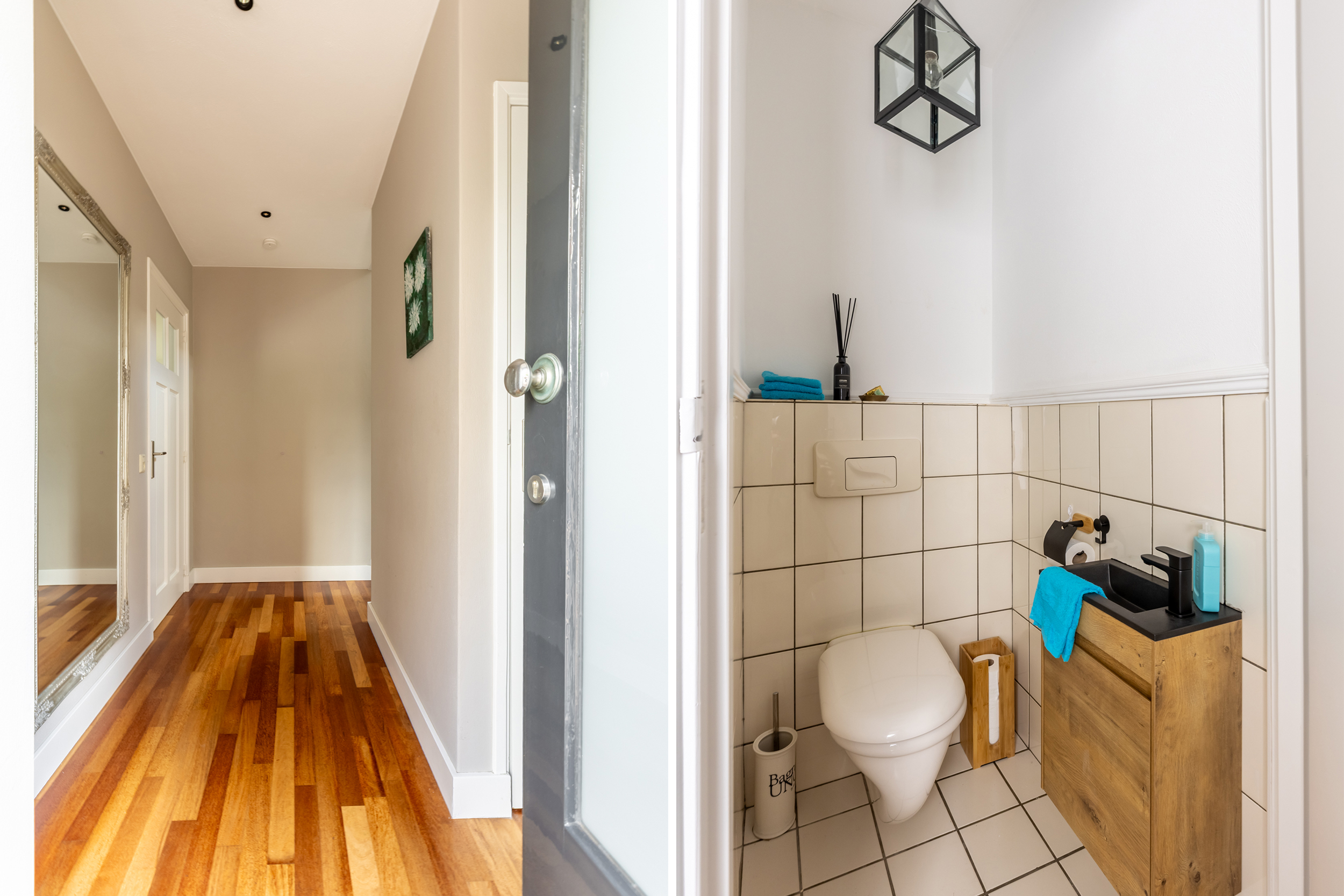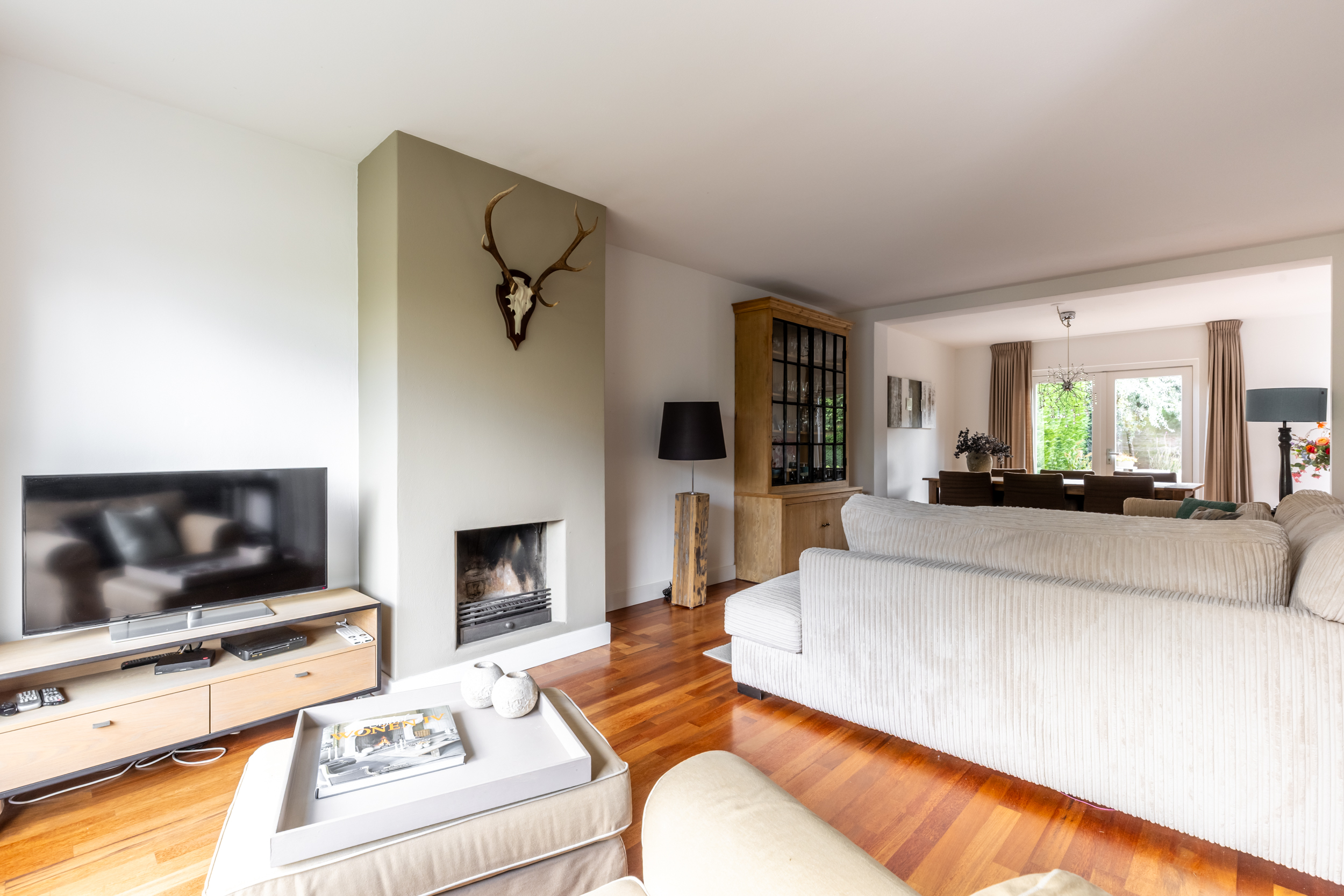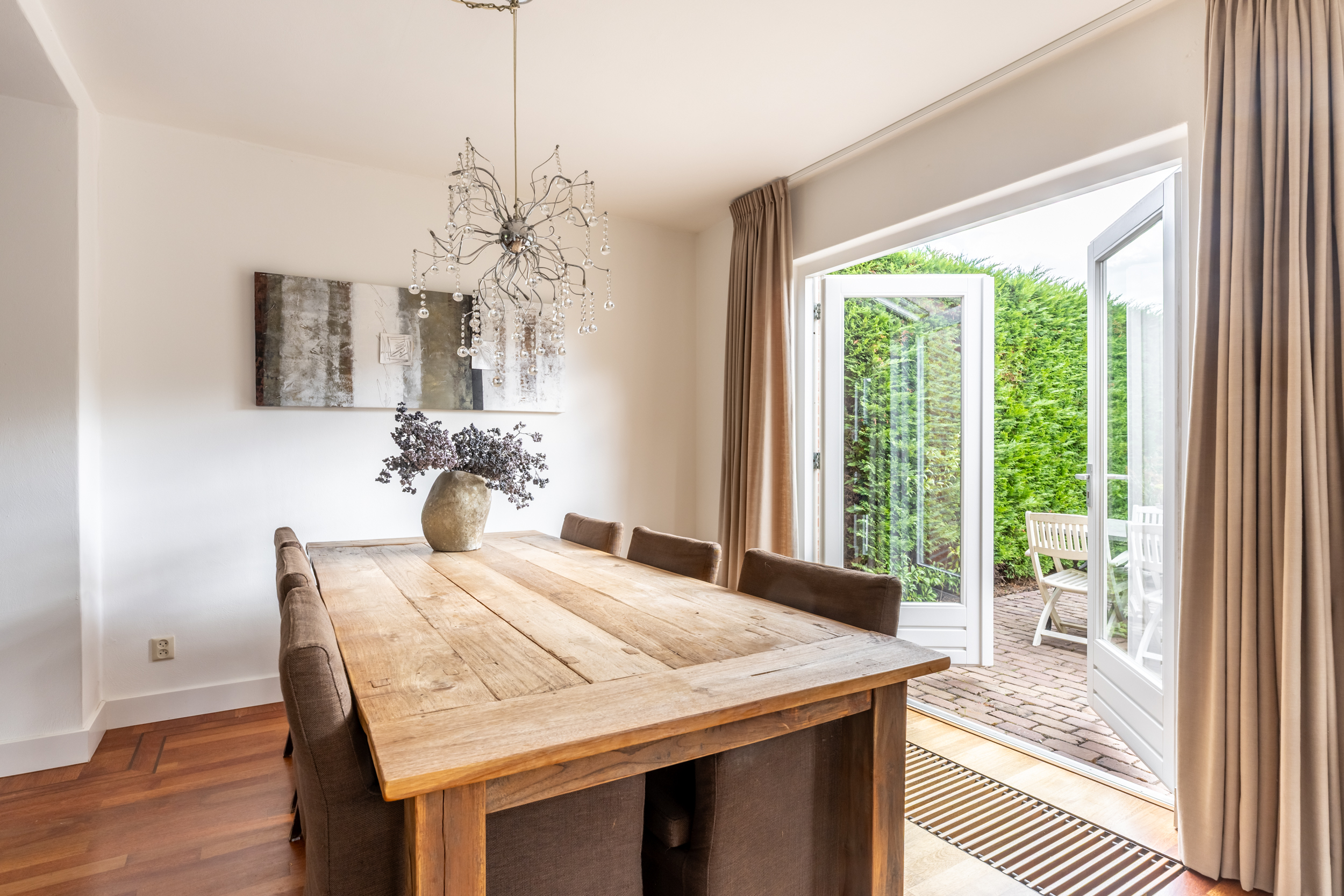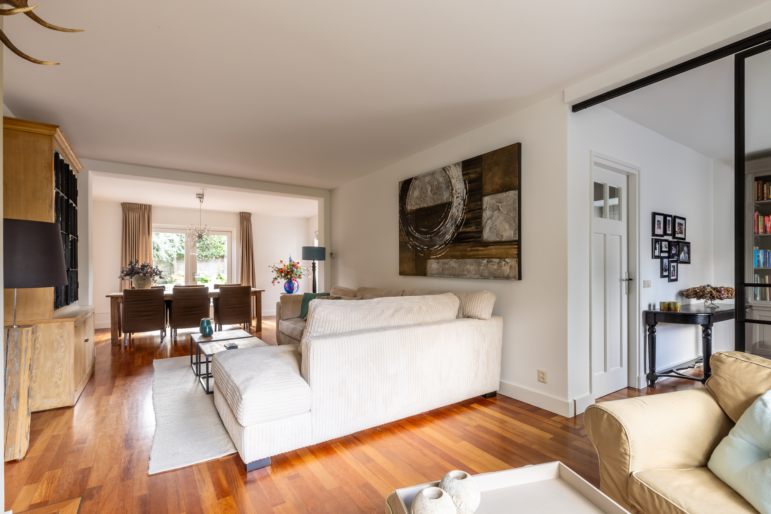 De gehele begane grond is voorzien van een massief houten vloer, wat zorgt voor een warme en uniforme uitstraling.