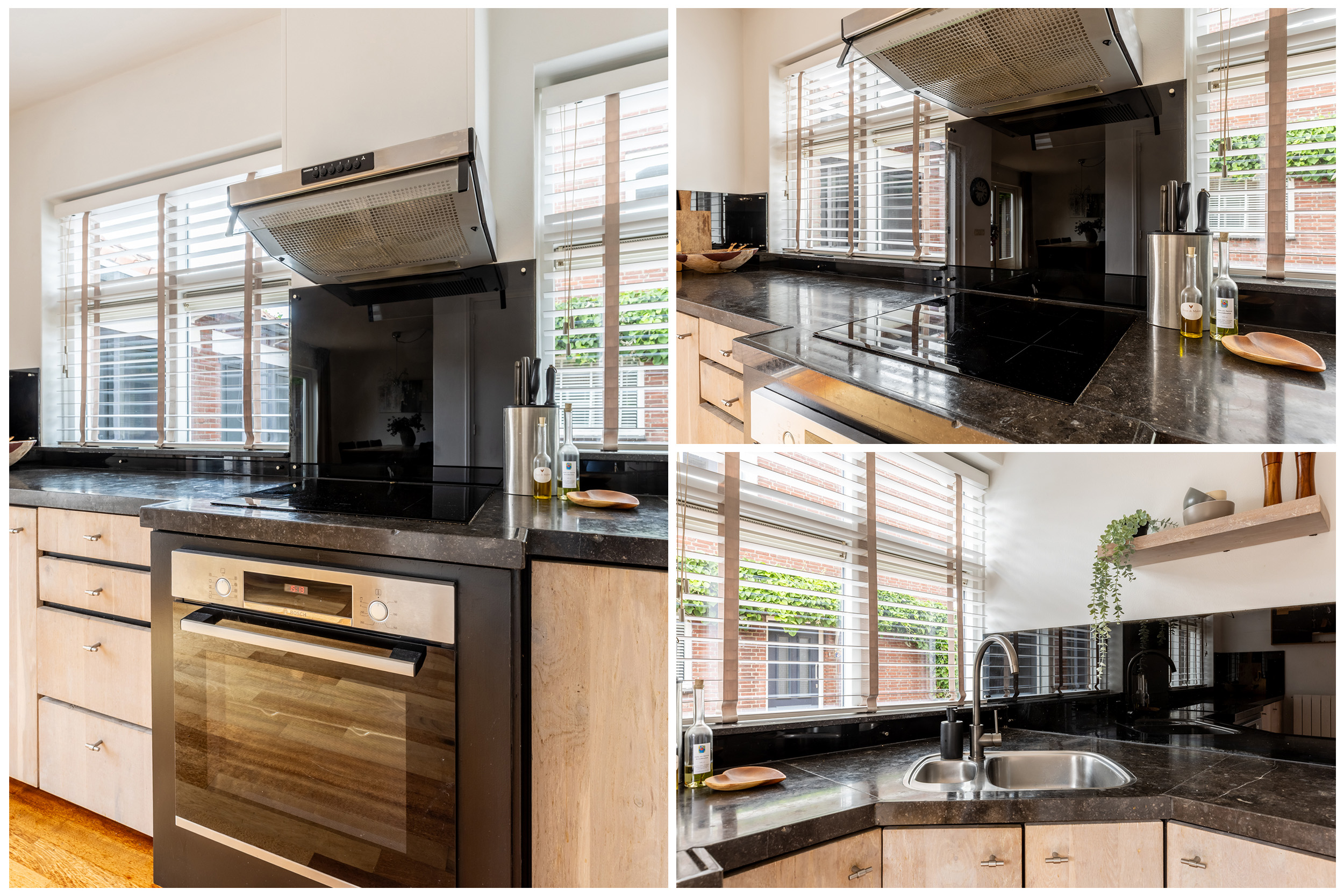 De halfopen keuken is praktisch ingedeeld en van alle gemakken voorzien. De keuken beschikt over een inductiekookplaat (2023) en een moderne oven (2020). De combinatie van houten fronten en een donker werkblad geeft de ruimte een stoere en eigentijdse uitstraling.