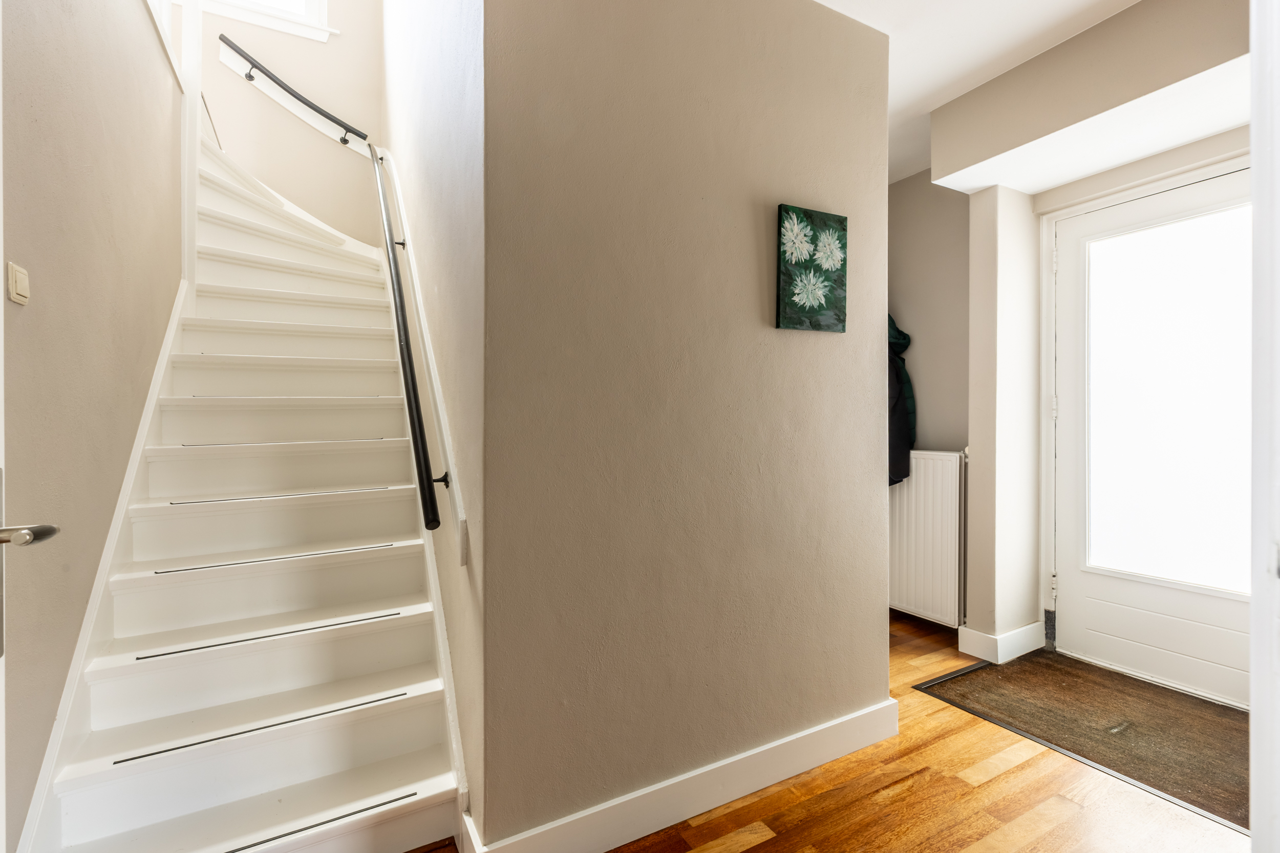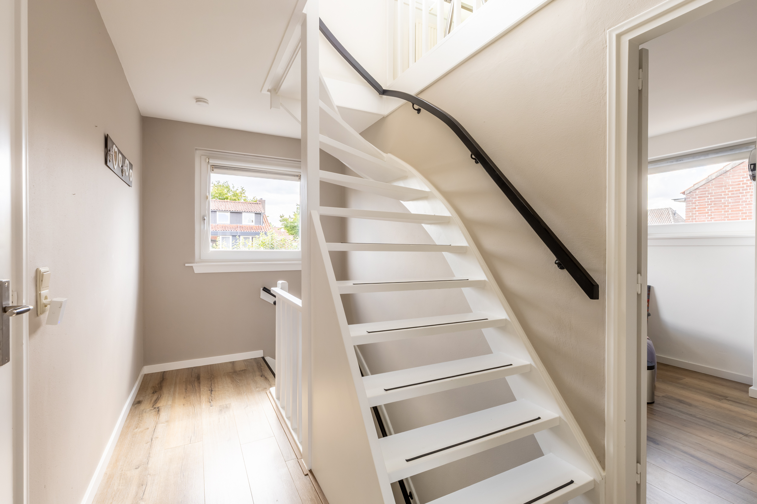 Via de vaste trap bereik je de eerste verdieping, waar zich drie kamers en de badkamer bevinden.