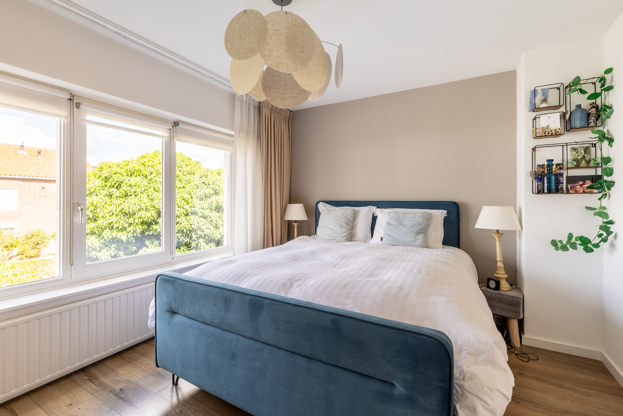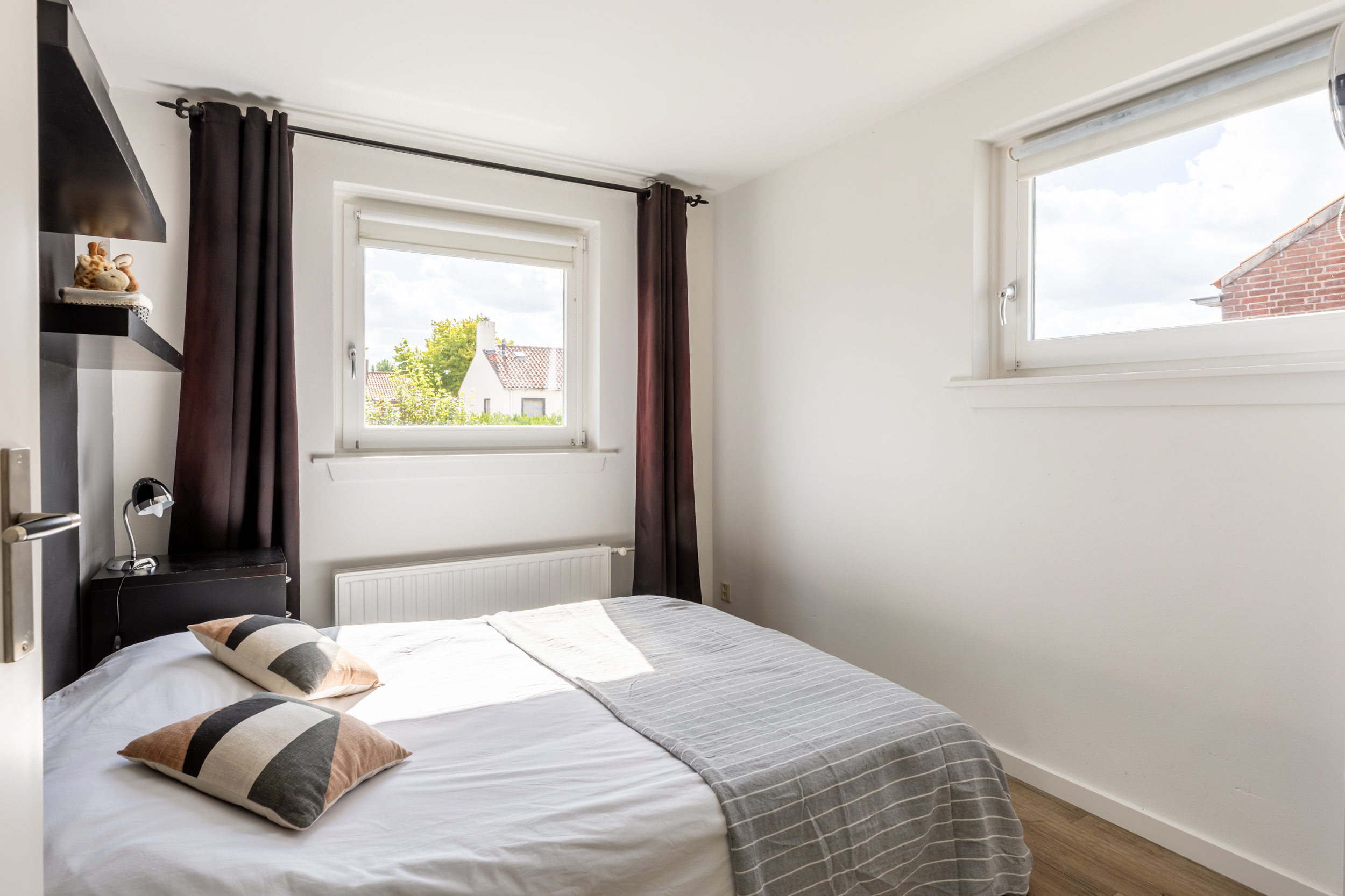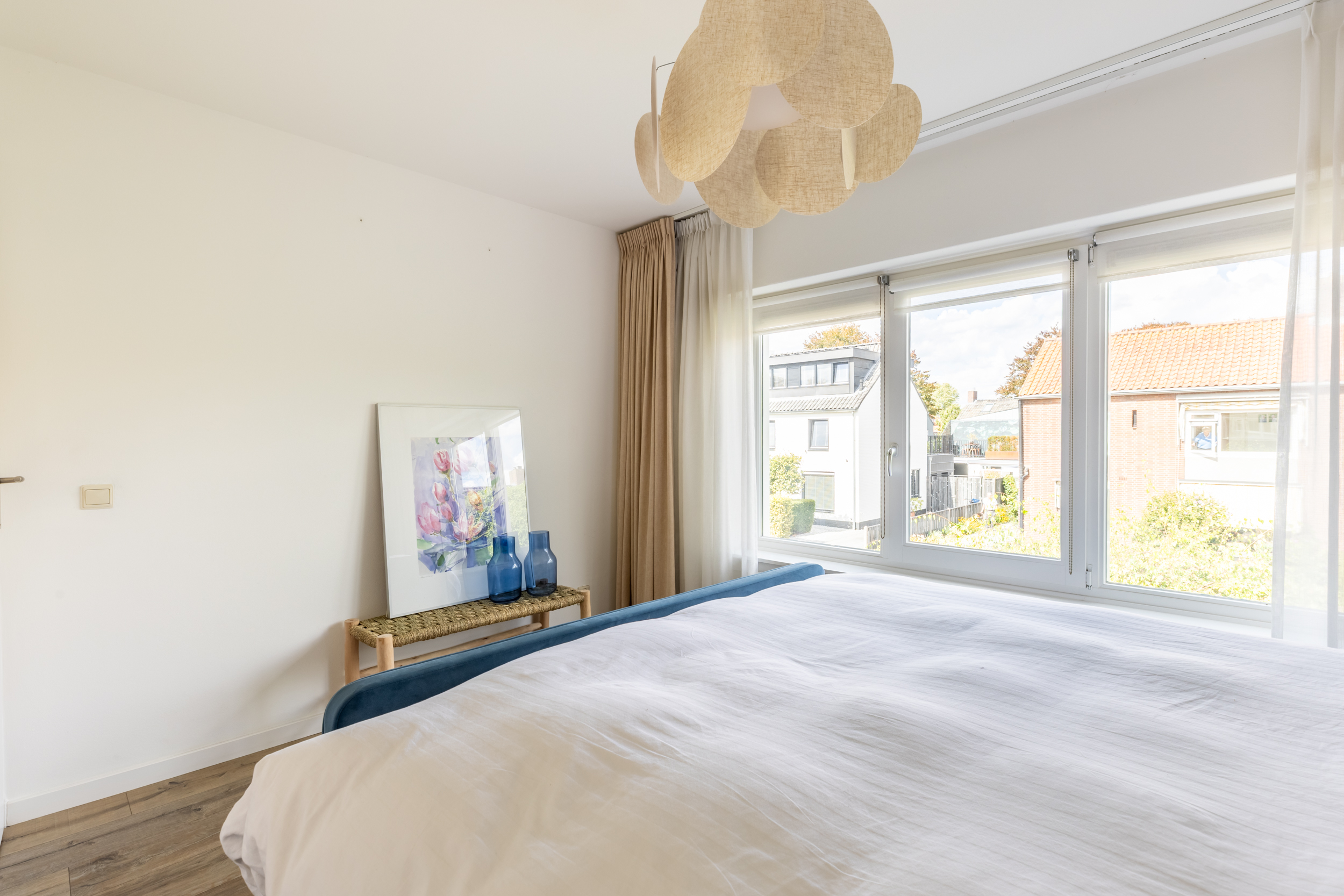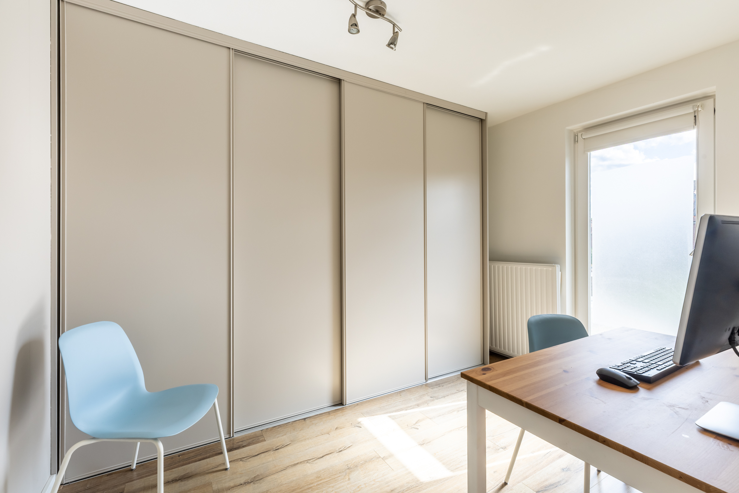 De hoofdslaapkamer ligt aan de voorzijde van de woning en biedt dankzij de grote raampartijen veel lichtinval. Aan de achterzijde bevinden zich nog twee kamers: één slaapkamer en een praktische kamer die momenteel is ingericht als kantoorruimte, voorzien van een kastenwand.