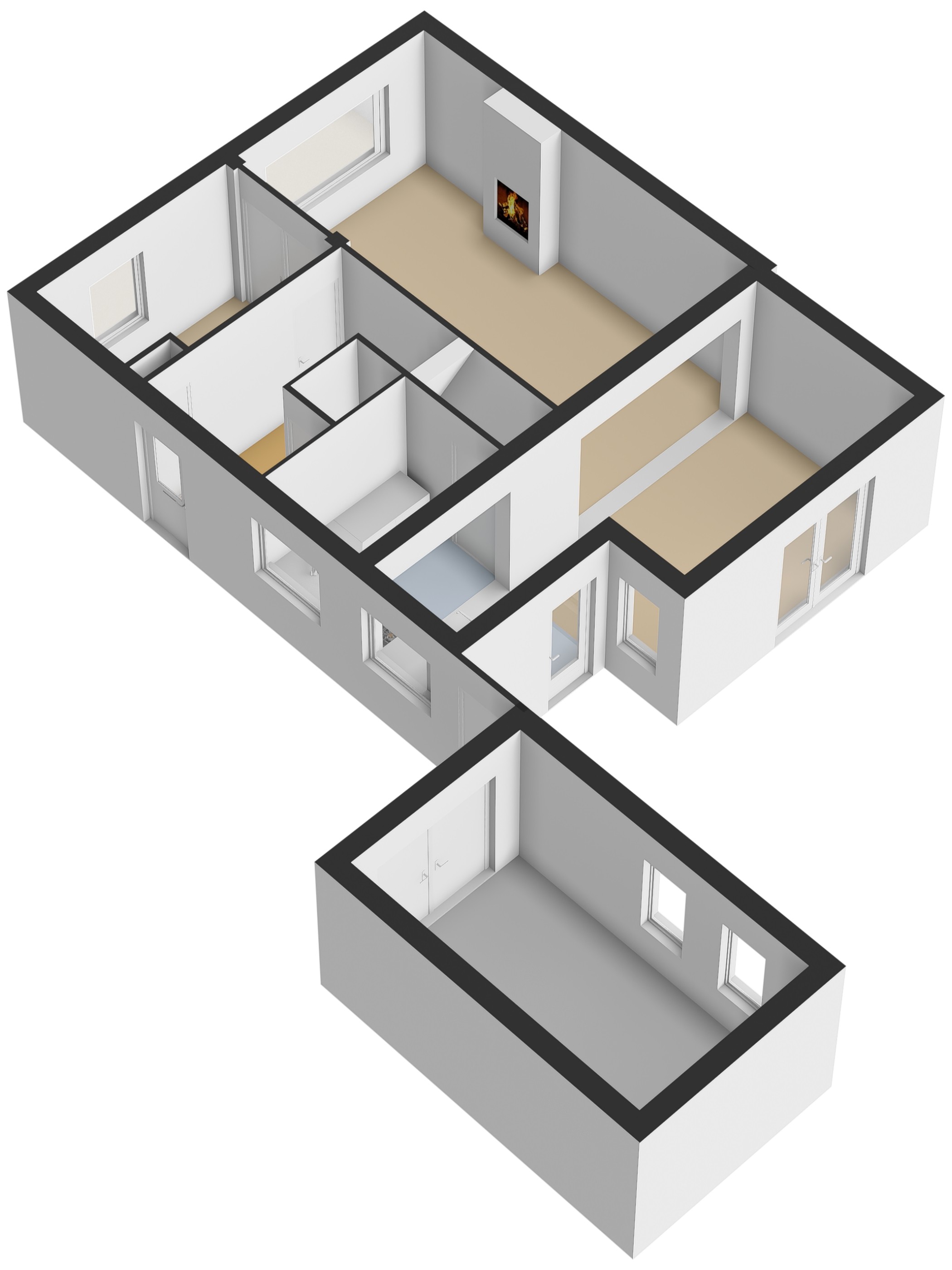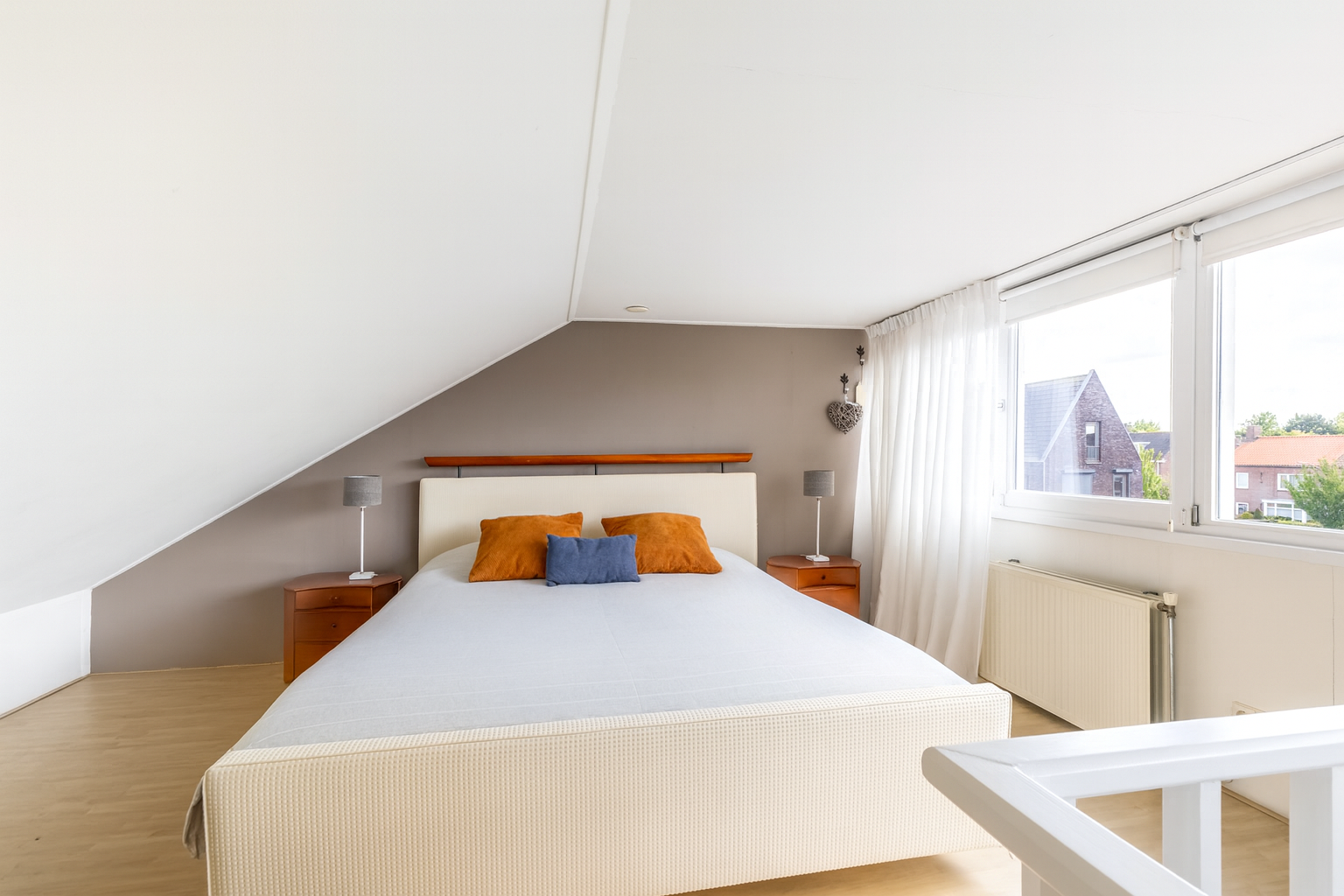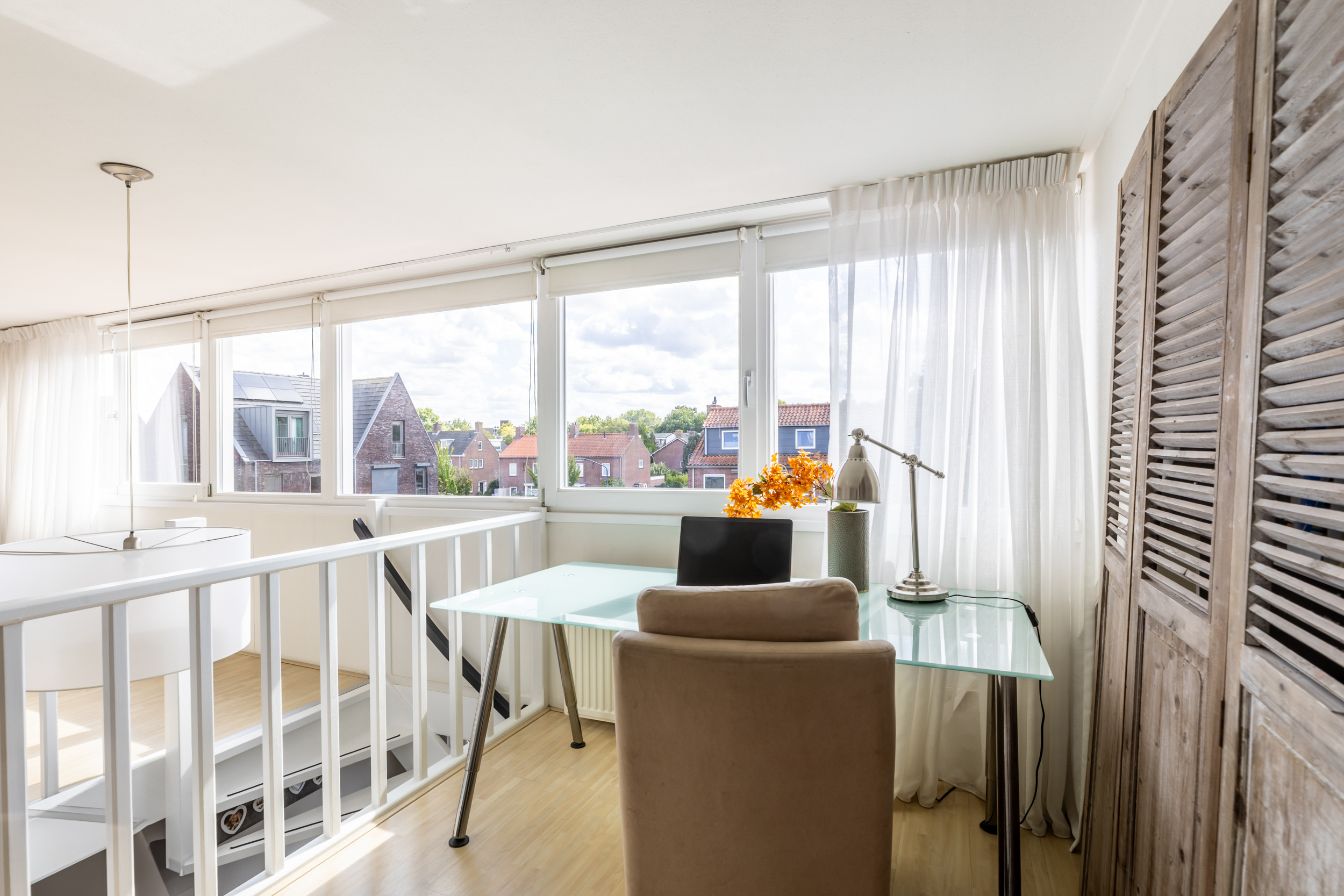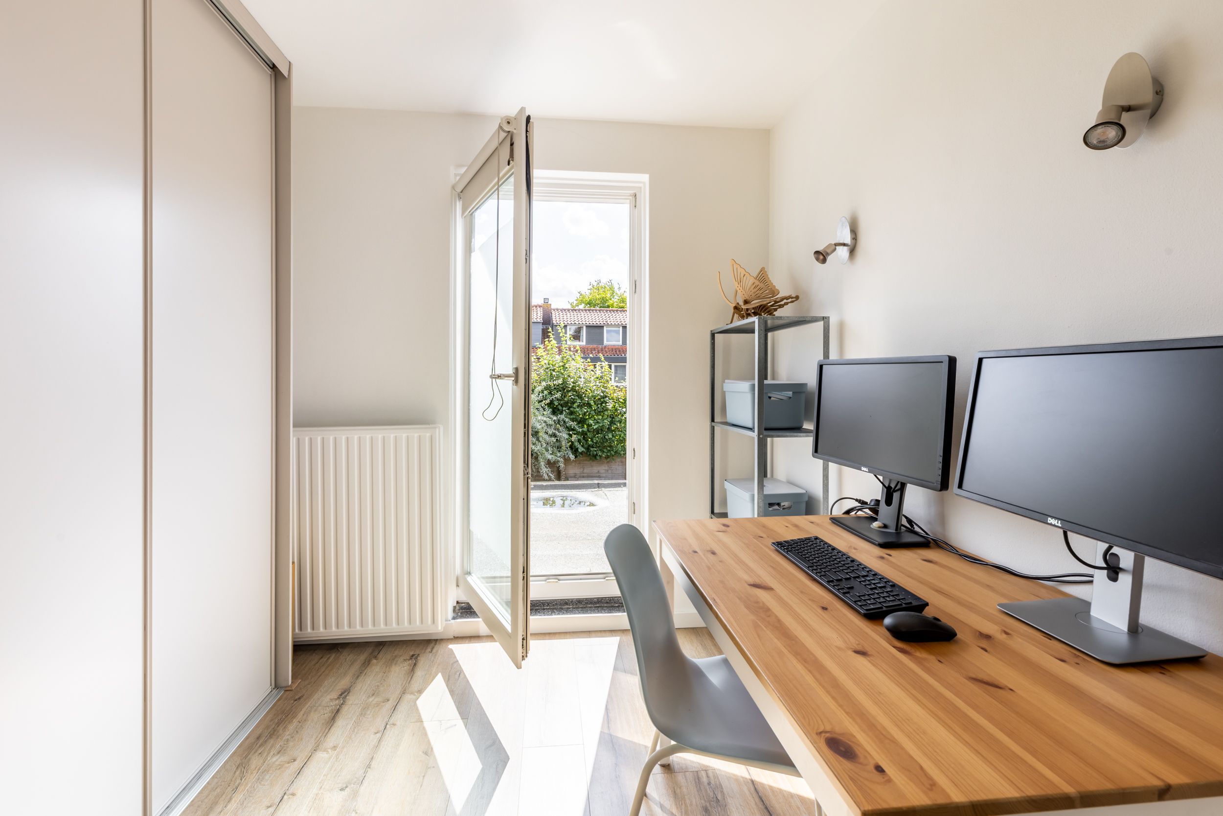 De hoofdslaapkamer ligt aan de voorzijde van de woning en biedt dankzij de grote raampartijen veel lichtinval. Aan de achterzijde bevinden zich nog twee kamers: één slaapkamer en een praktische kamer die momenteel is ingericht als kantoorruimte, voorzien van een kastenwand.