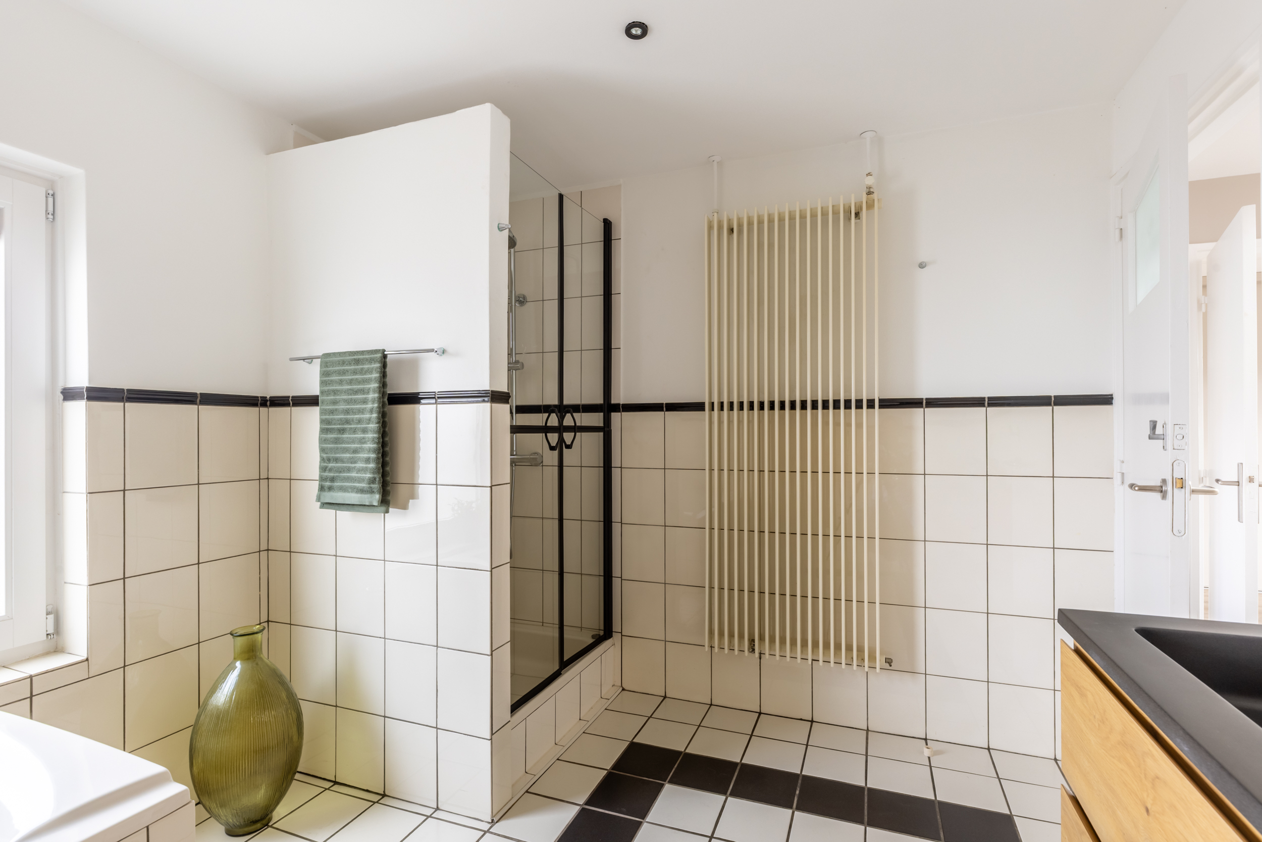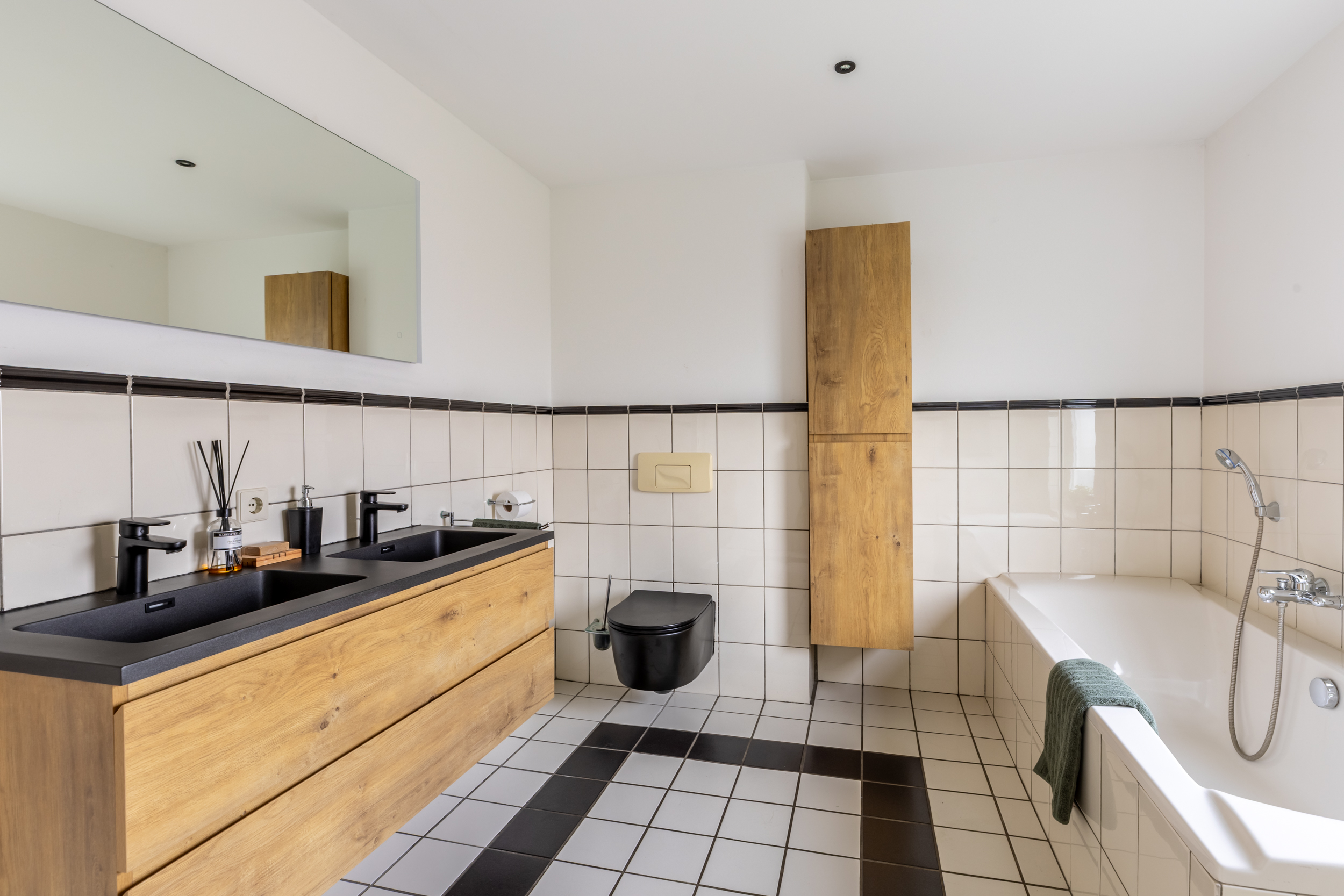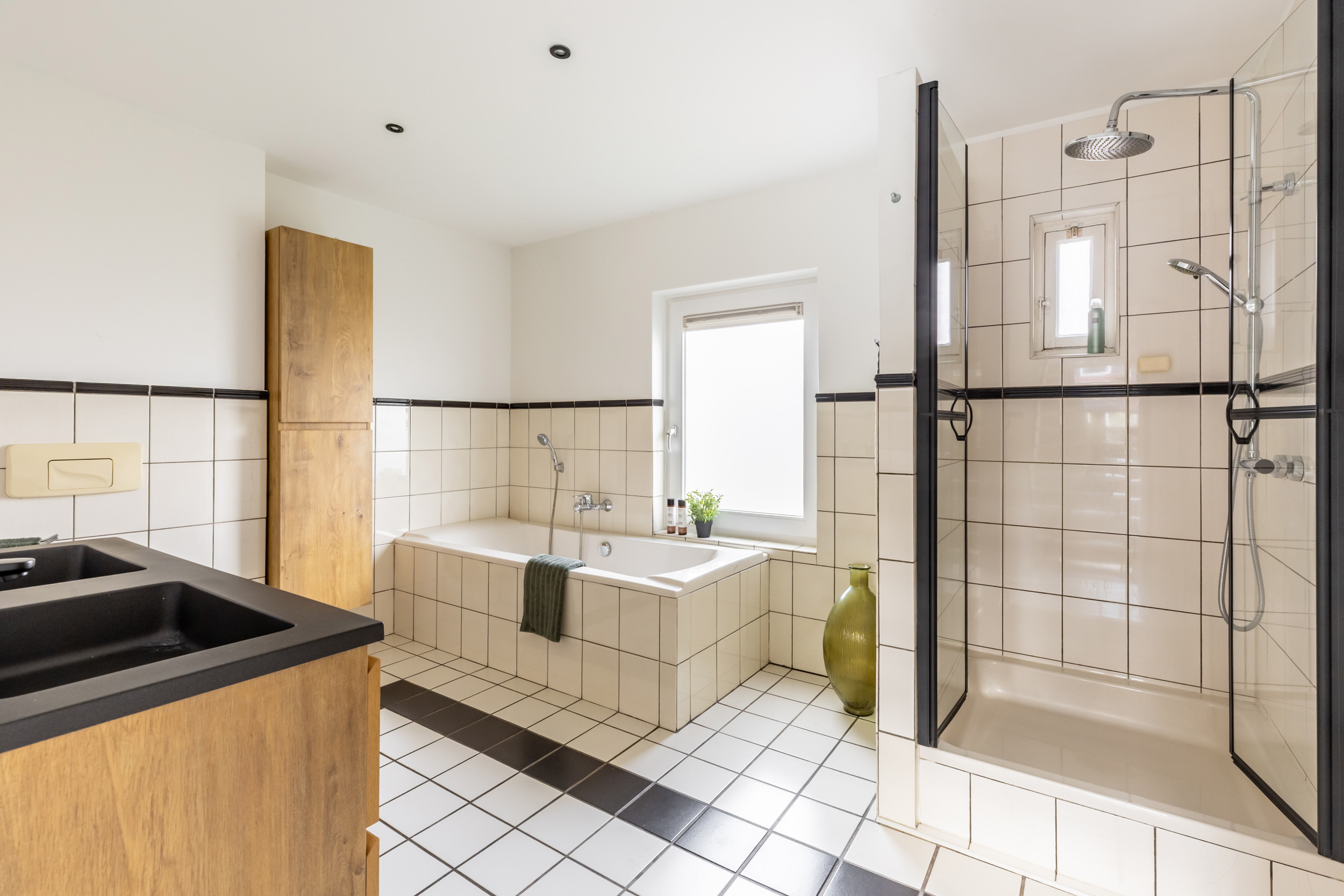 De badkamer is zeer royaal en stijlvol ingericht. Hier vind je een comfortabel ligbad en een douche met een luxe regendouchekop. Het dubbele wastafelmeubel, uitgevoerd in hout met een strak zwart blad, wordt prachtig aangevuld met een bijpassende houten kast voor extra opbergruimte. De moderne uitstraling wordt compleet gemaakt door het zwarte toilet. Bovendien zijn er recent nog diverse onderdelen vernieuwd, waaronder het toilet, het wastafelmeubel, de douchedeuren en de kast. Dankzij het aanwezige raam profiteert de ruimte van veel natuurlijk licht en ventilatie, waardoor het een fijne plek is om de dag ontspannen te beginnen of af te sluiten.