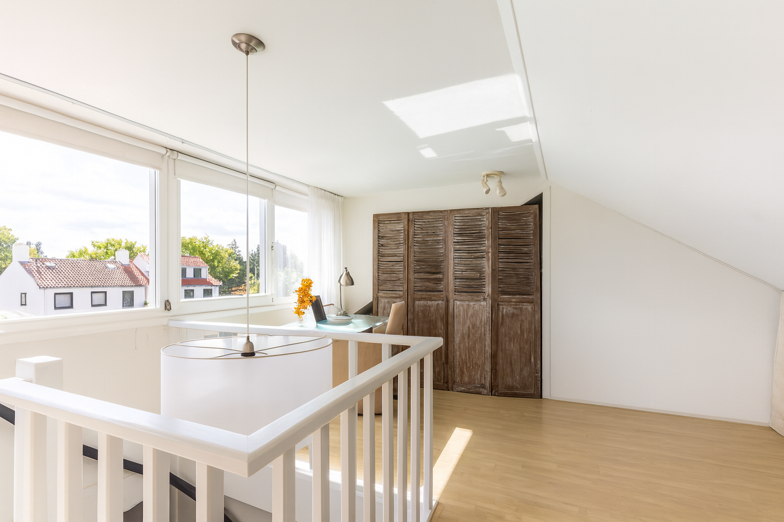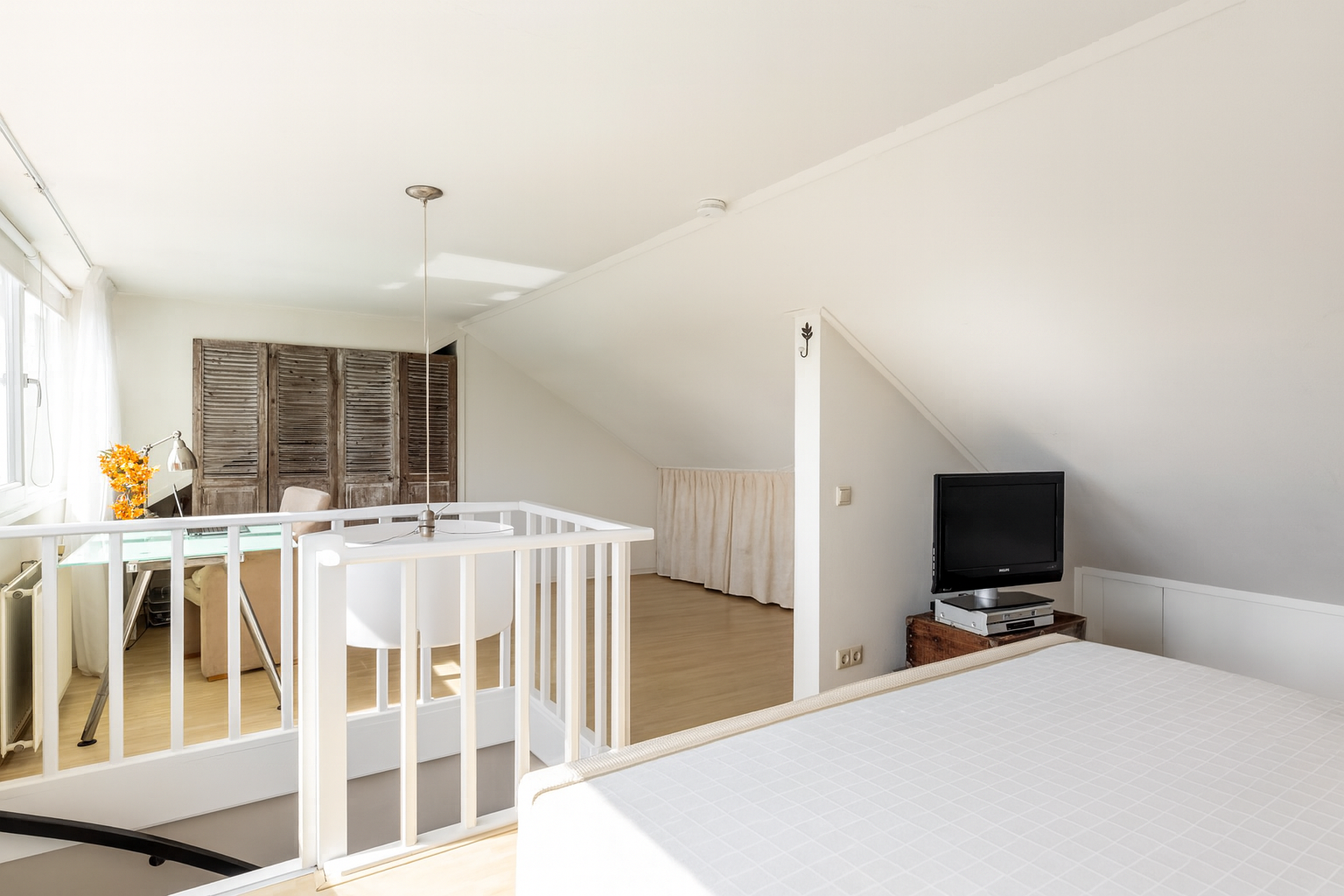 De tweede verdieping is bereikbaar via een vaste trap en biedt een verrassend ruime kamer die momenteel is ingericht als zowel slaapkamer als werkplek. Dankzij de grote raampartij met dakkapel komt er veel natuurlijk licht naar binnen.
