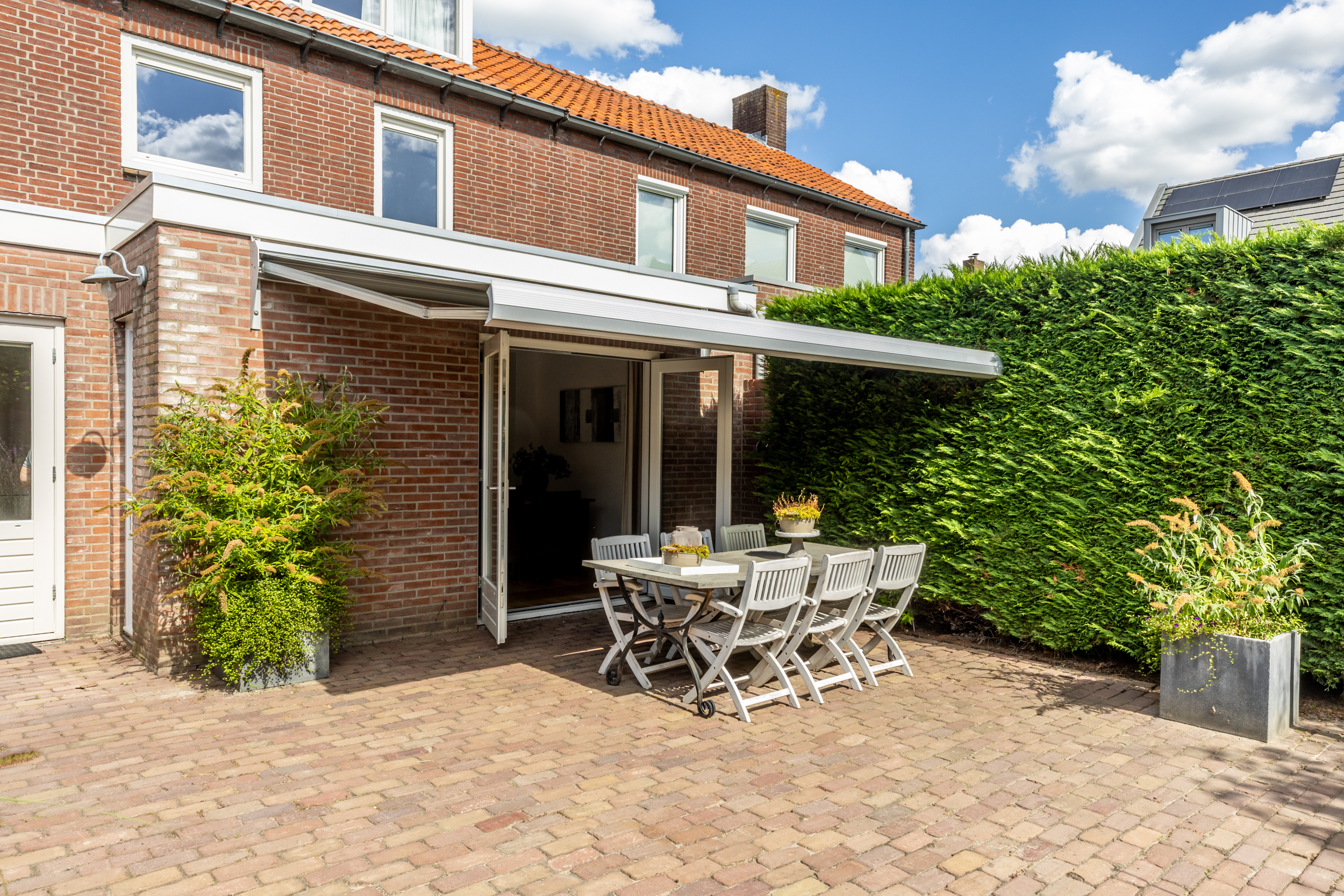 De zonnige tuin ligt op het zuidwesten, waardoor je hier het grootste deel van de dag van de zon kunt genieten. Met het aanwezige zonnescherm creëer je eenvoudig een schaduwrijke plek op warme dagen. De tuin is ruim opgezet en biedt meerdere terrassen en veel privacy door de groene erfafscheiding.
