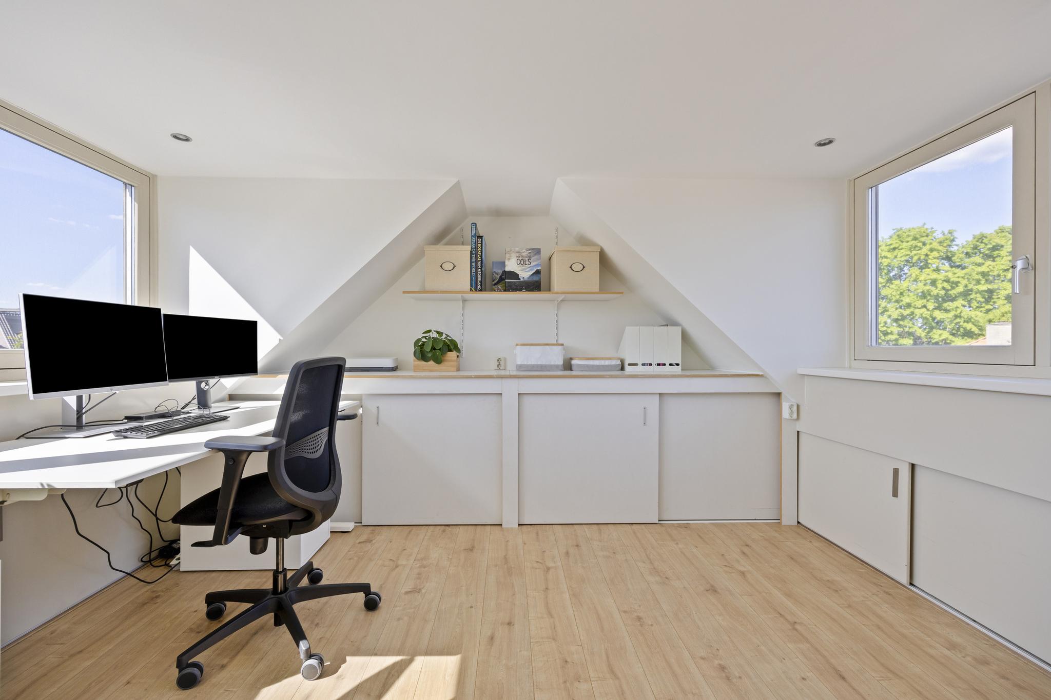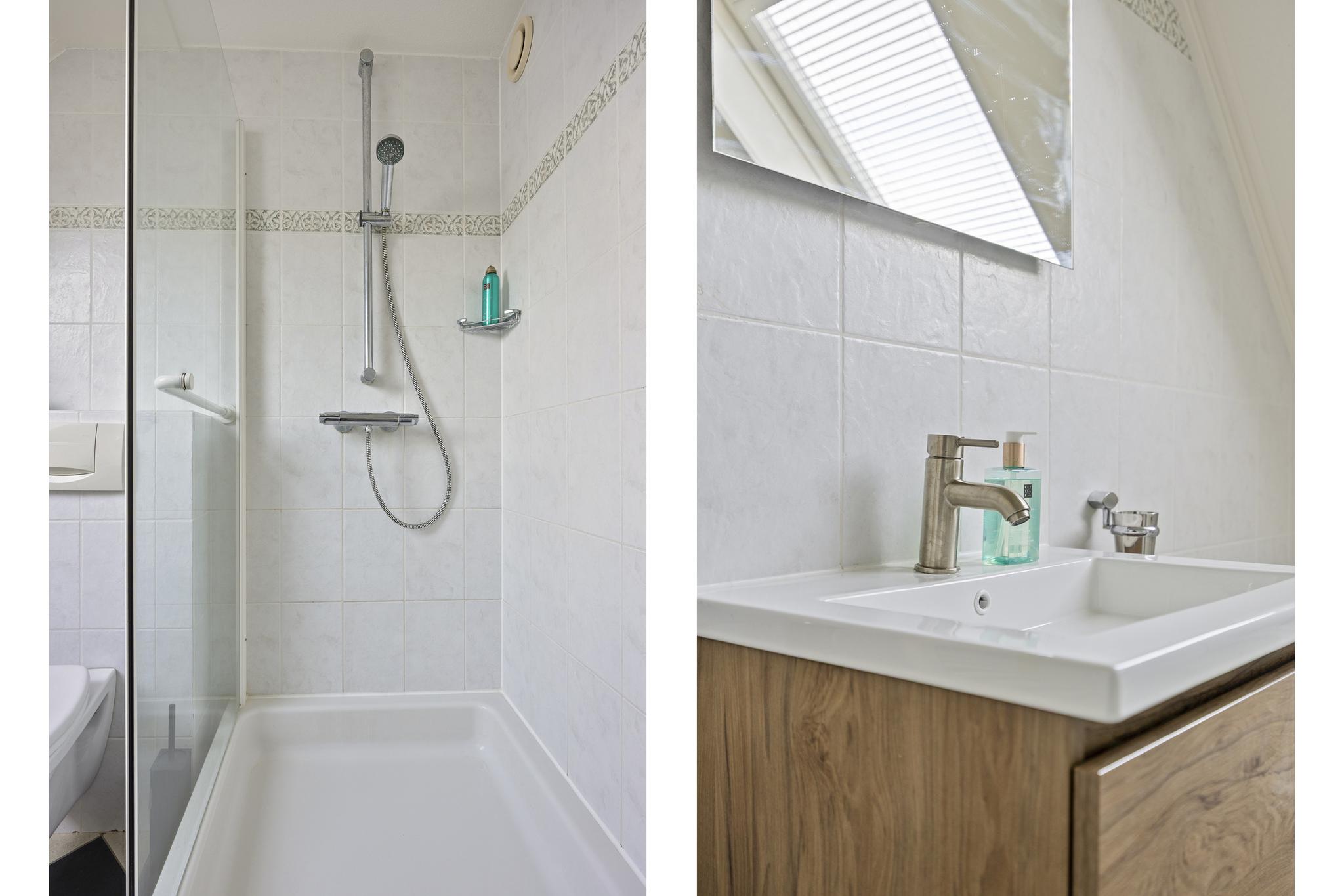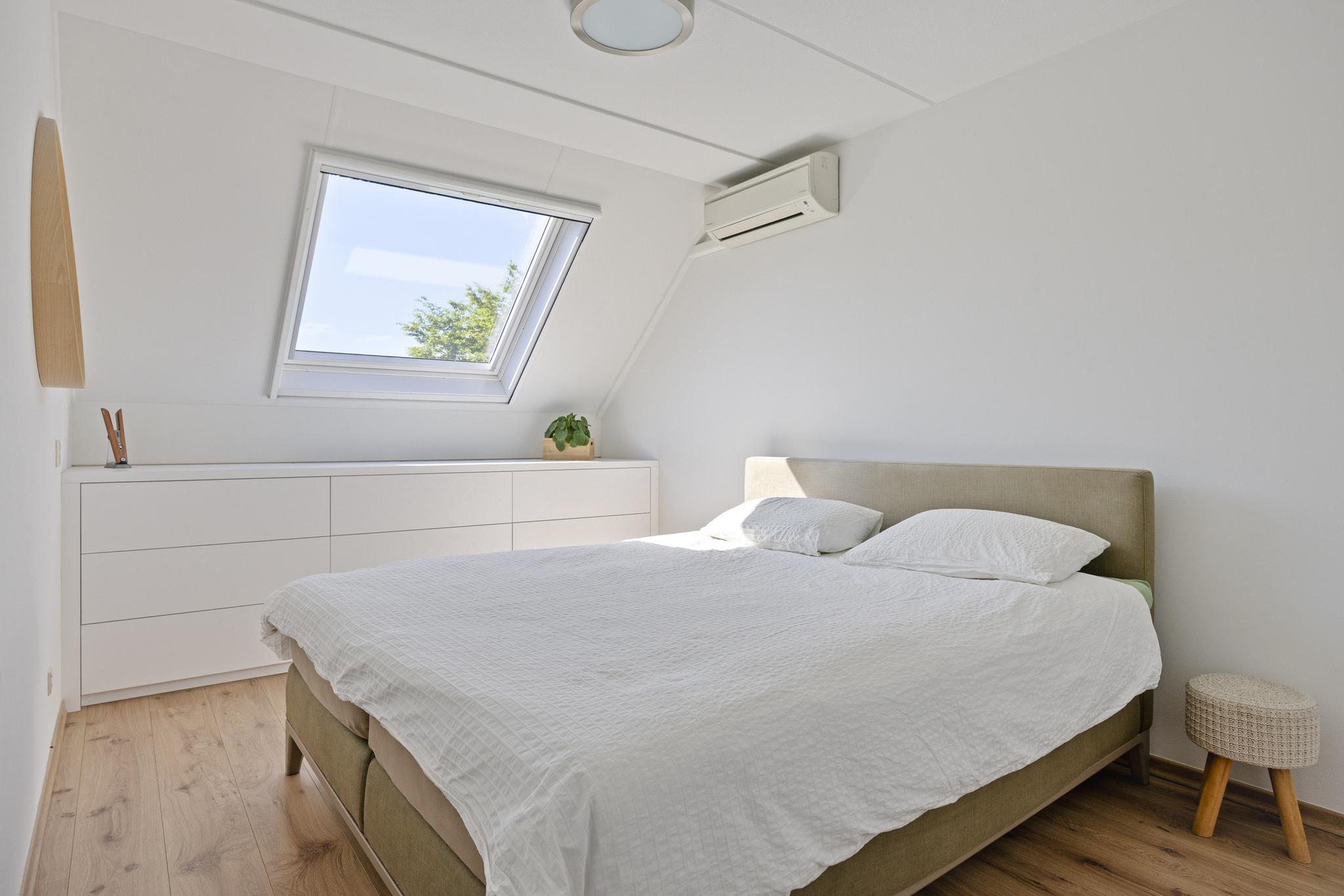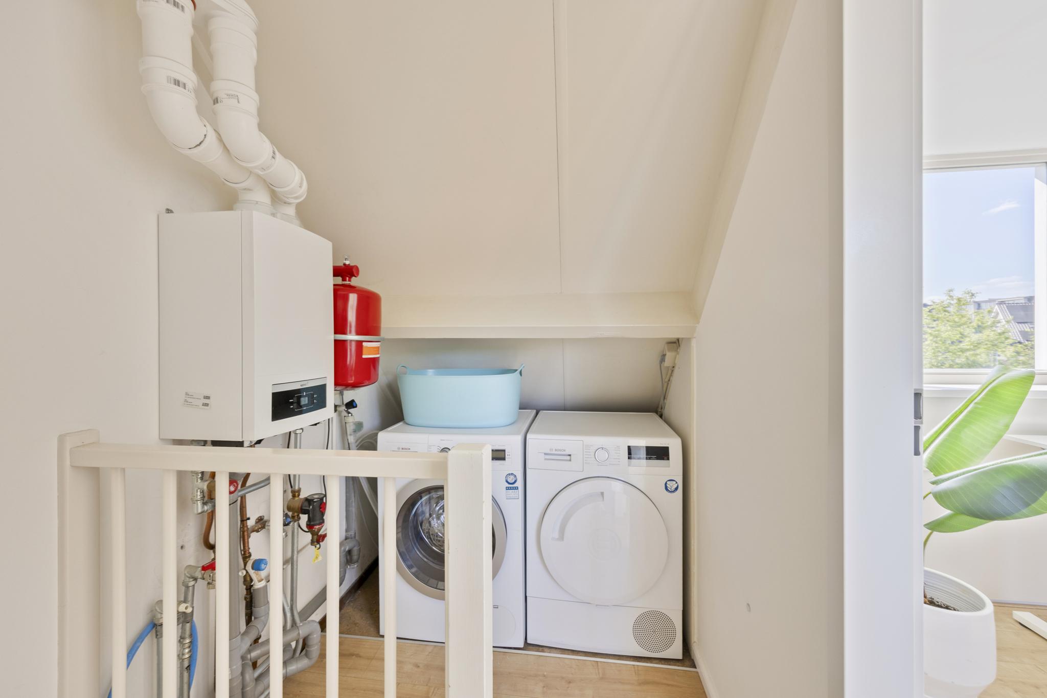 Een vaste trap brengt je naar de verrassend ruime tweede verdieping. Hier bevindt zich een grote slaapkamer, verruimd door twee brede dakkapellen die niet alleen licht en ruimte creëren, maar ook zijn uitgerust met rolluiken. De kamer biedt voldoende plek voor een tweepersoonsbed én extra kastruimte dankzij de inbouwkast. Op de overloop vind je daarnaast de cv-ketel uit 2019 en de aansluitingen voor de wasmachine en droger. Deze verdieping is perfect als ouderslaapkamer, logeerkamer of tienerkamer.