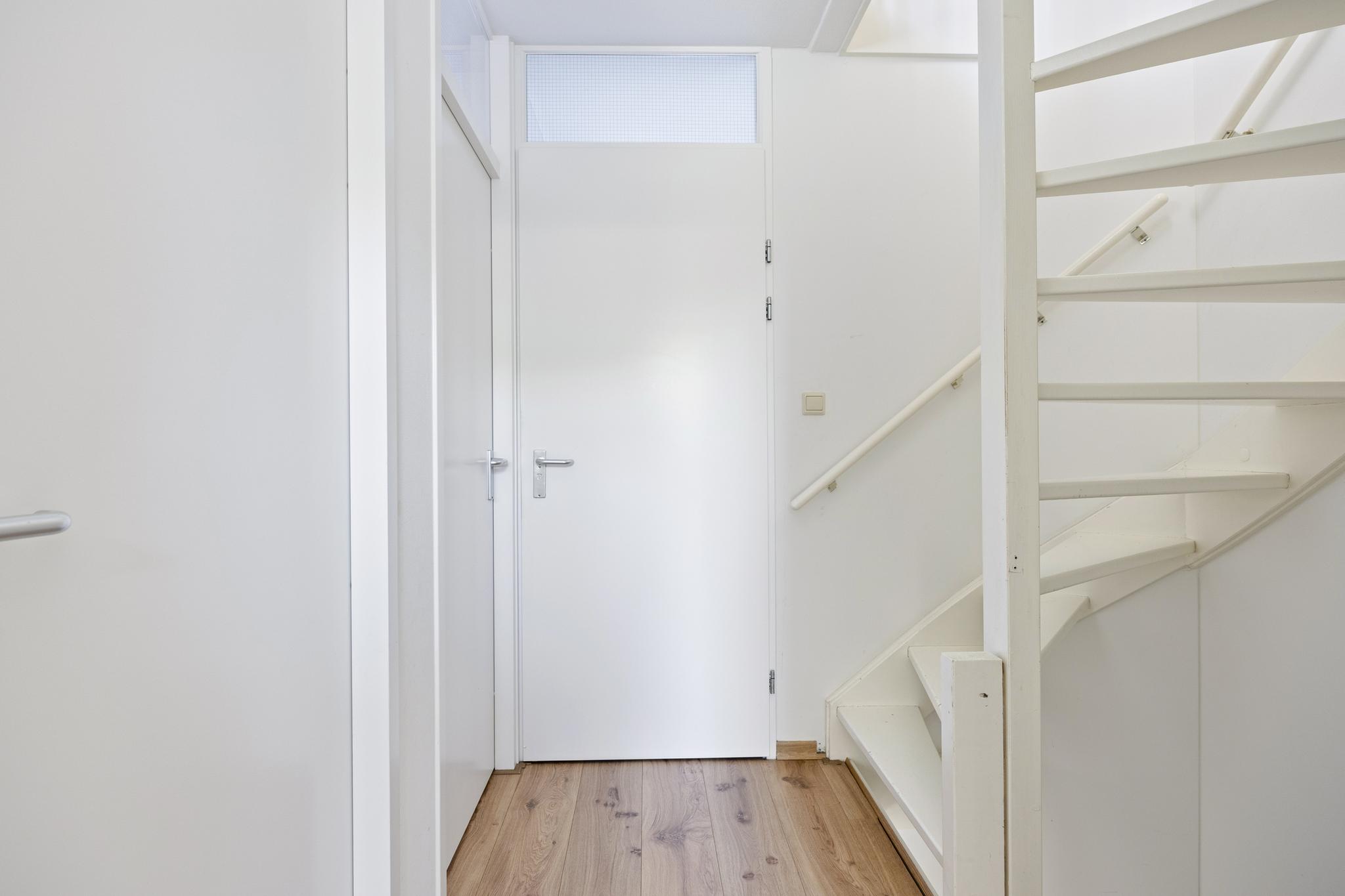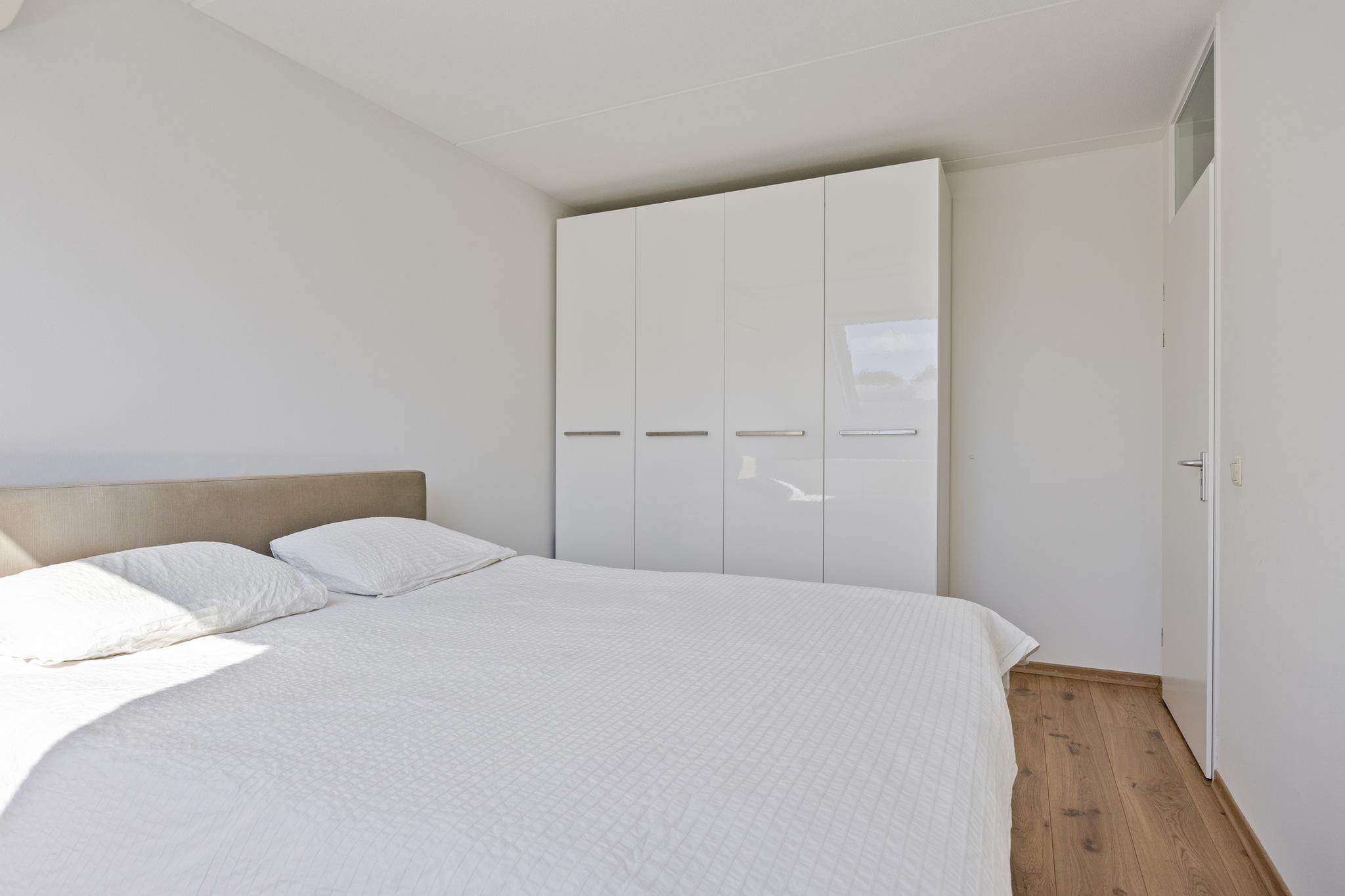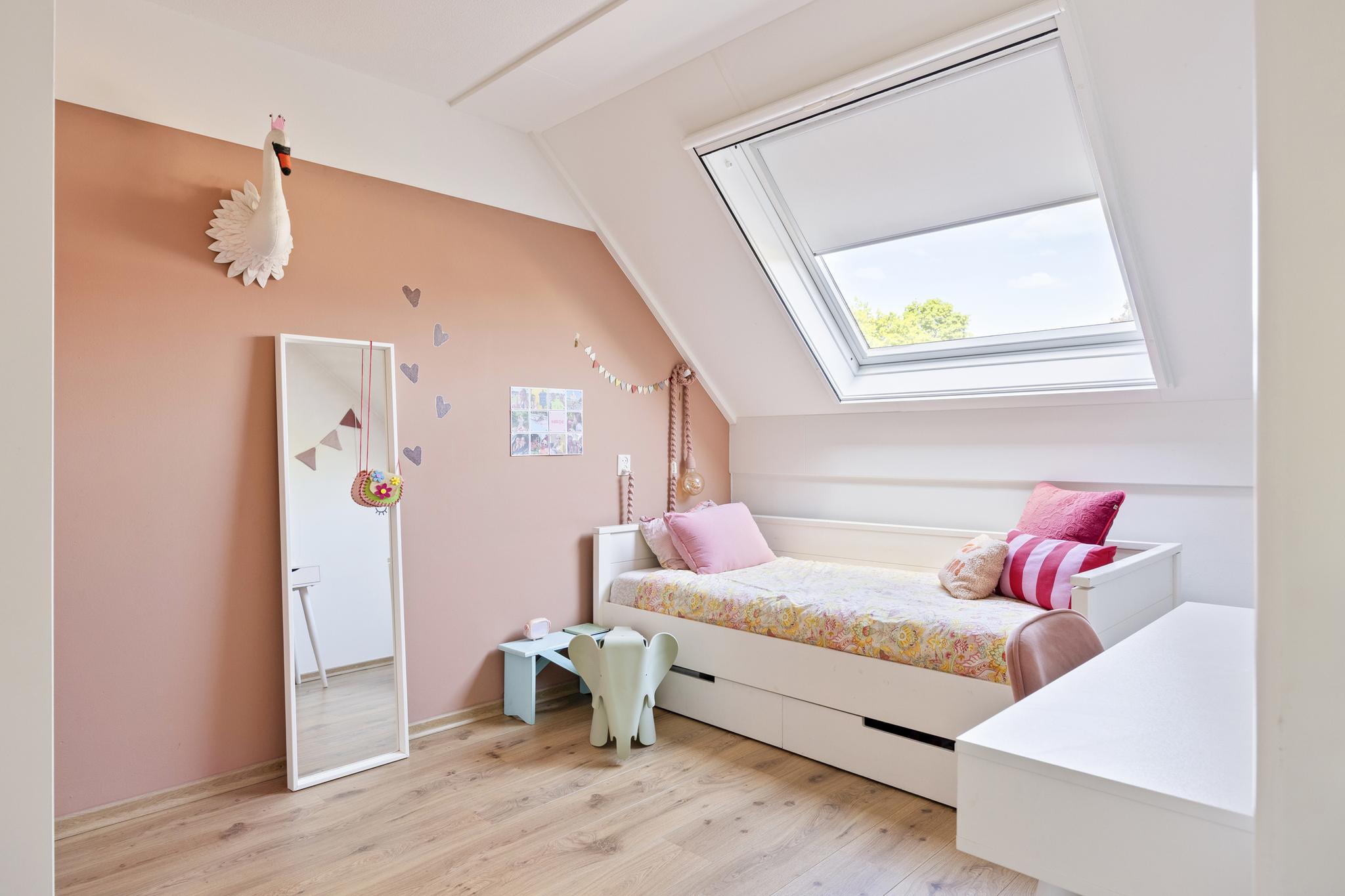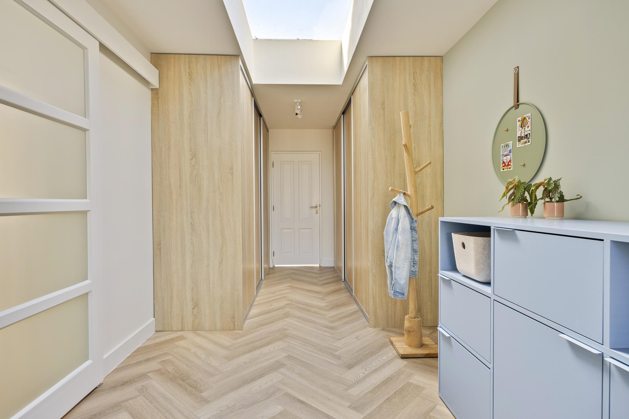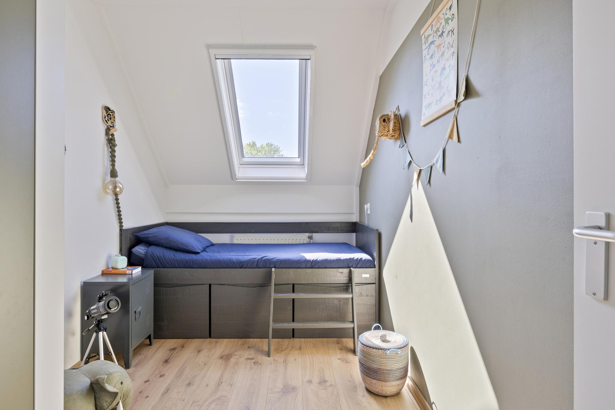 Een vaste trap brengt je naar de verrassend ruime tweede verdieping. Hier bevindt zich een grote slaapkamer, verruimd door twee brede dakkapellen die niet alleen licht en ruimte creëren, maar ook zijn uitgerust met rolluiken. De kamer biedt voldoende plek voor een tweepersoonsbed én extra kastruimte dankzij de inbouwkast. Op de overloop vind je daarnaast de cv-ketel uit 2019 en de aansluitingen voor de wasmachine en droger. Deze verdieping is perfect als ouderslaapkamer, logeerkamer of tienerkamer.