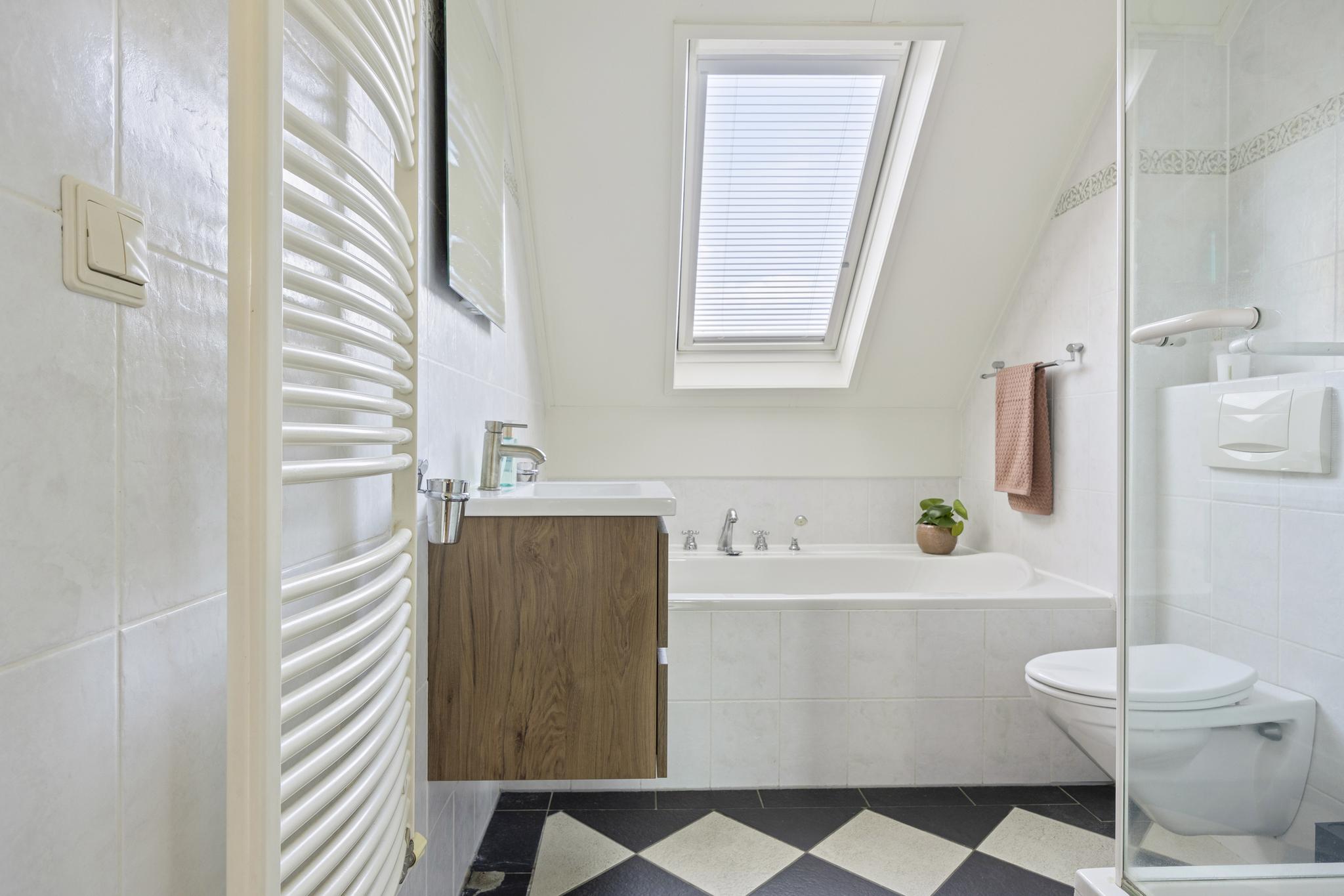 Via de trap bereiken we de eerste verdieping met een overloop. Deze geeft toegang tot drie ruime slaapkamers en de badkamer. Elke slaapkamer biedt genoeg ruimte voor een tweepersoonsbed en een kledingkast en dankzij de dakramen stroomt het daglicht prettig naar binnen. De hoofdslaapkamer beschikt over een airco, ideaal tijdens warme zomernachten. De overige twee slaapkamers zijn voorzien van praktische inbouwkasten. De badkamer is van alle gemakken voorzien met een ligbad, douche, toilet en een wastafelmeubel. Hier kun je heerlijk ontspannen na een lange dag.
