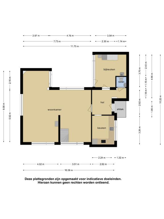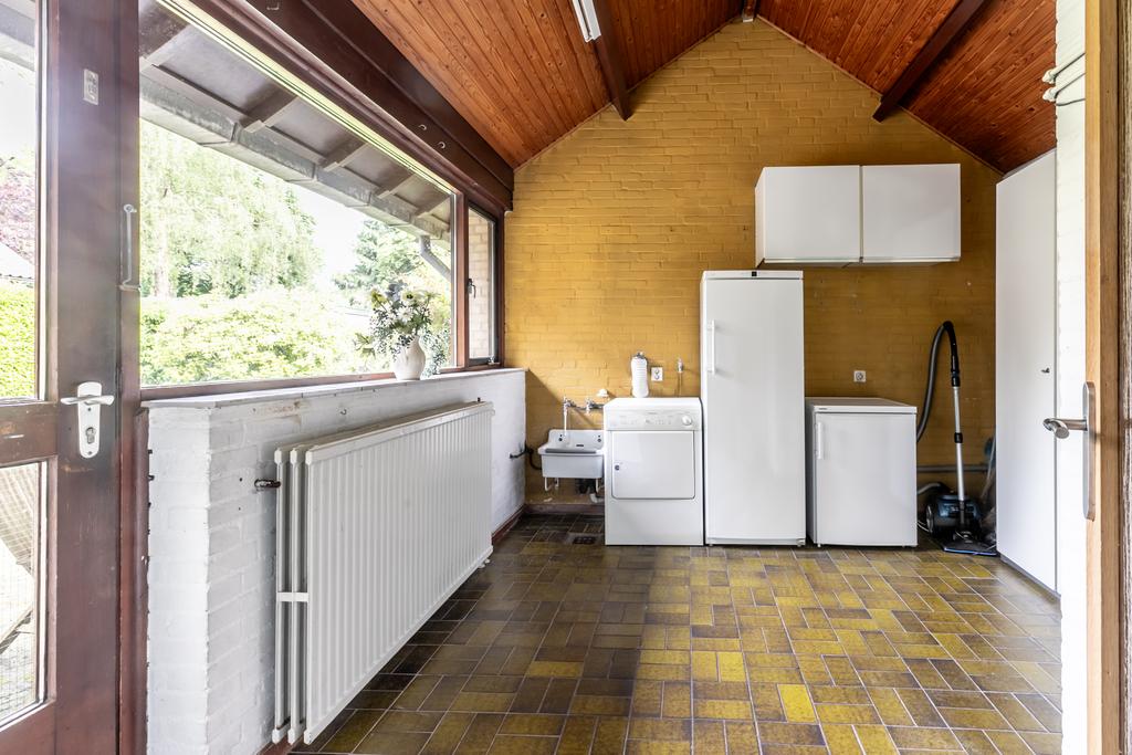 •Vanuit de hal is ook de praktische bijkeuken bereikbaar. In de bijkeuken zijn de aansluitingen van de wasmachine aanwezig, een uitstortgootsteen en ruimte voor extra witgoed en kasten. In deze ruimte bevindt zich ook de cv-ketel en de buitendeur naar de tuin en achterom.