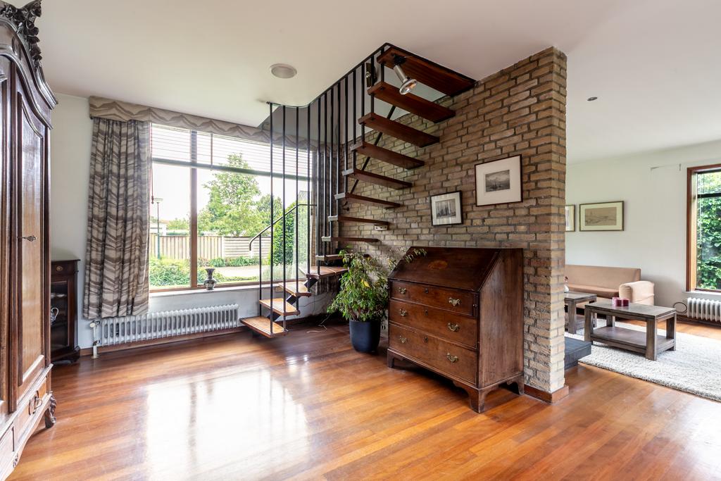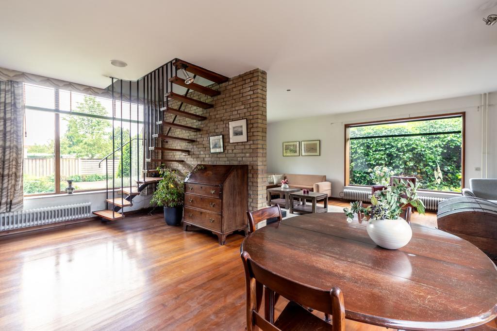 •Lichte en ruime woon-/eetkamer waarvan de vloer is afgewerkt met parketvloerdelen. Isolerende beglazing en een gezellige gashaard zorgen voor extra comfort. In een hoek van het eetgedeelte bevindt zich de trap.