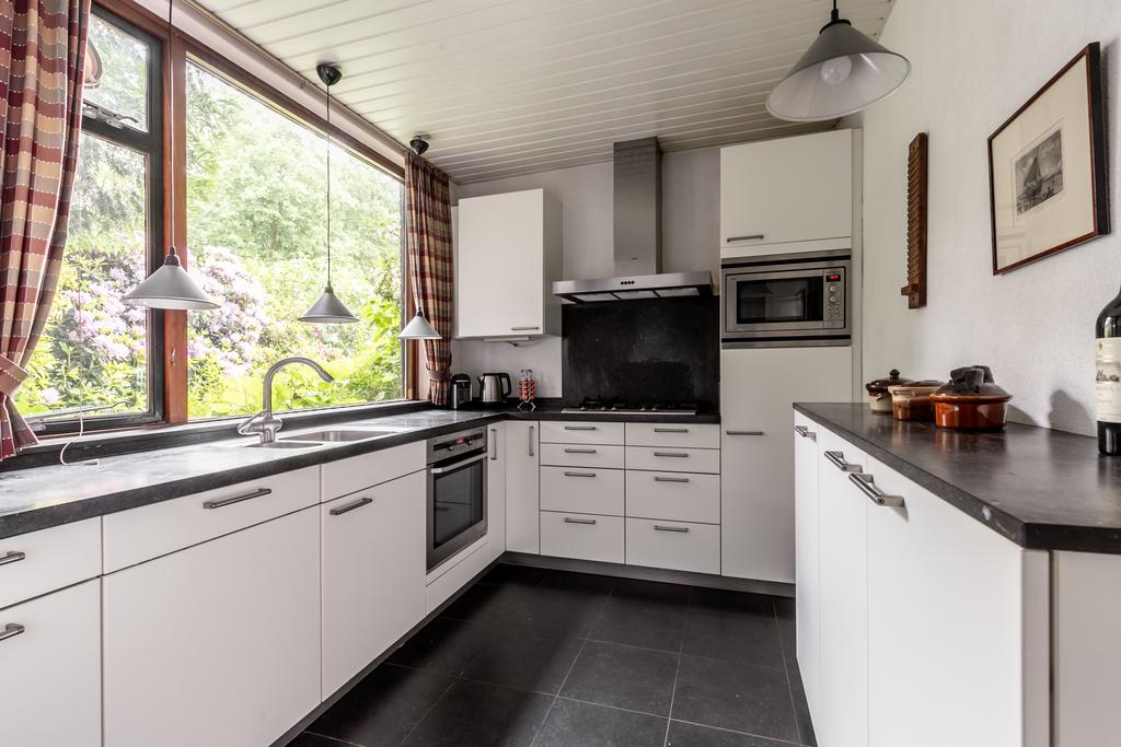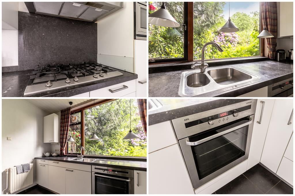•Een lichte keuken voorzien van diverse apparatuur, waaronder een vaatwasser, 5-pits gaskookplaat met afzuigkap, een oven, een magnetron en een koelkast. Het werkblad is van natuursteen.