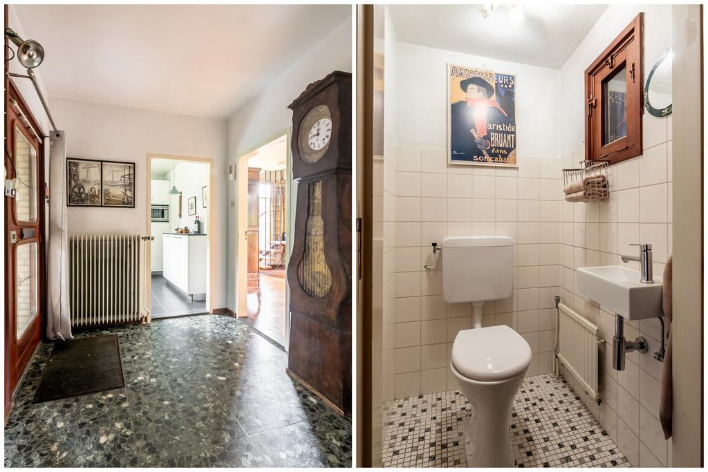 •Entree, ruime hal met garderobe, toilet en meterkast. De betonvloer is afgewerkt met een tegelvloer. Toegang tot de woonkamer, de keuken en de bijkeuken.