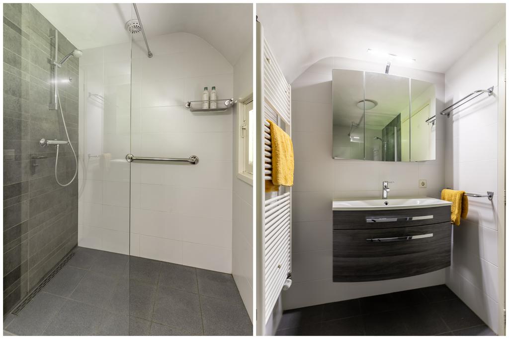 •De moderne badkamer heeft een inloopdouche en een wastafel.