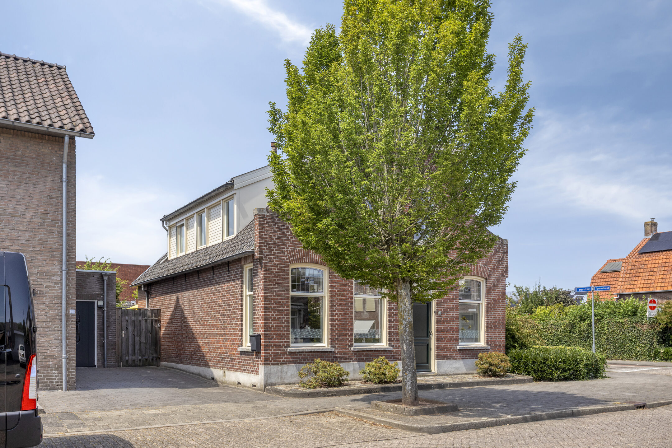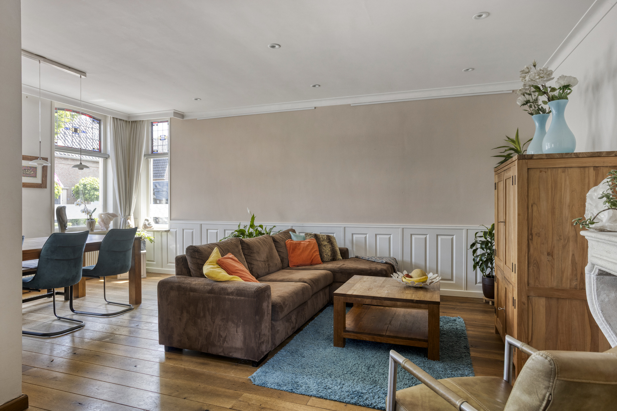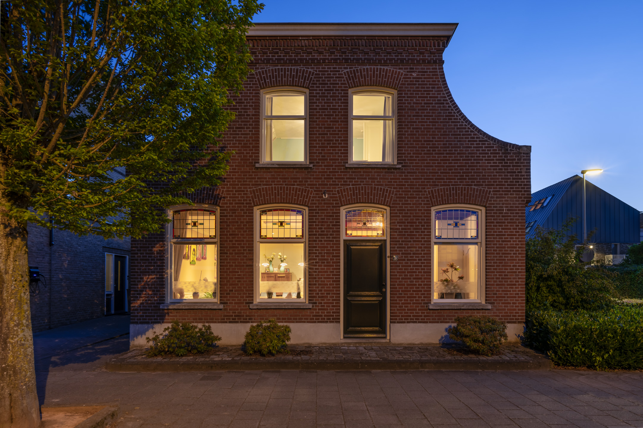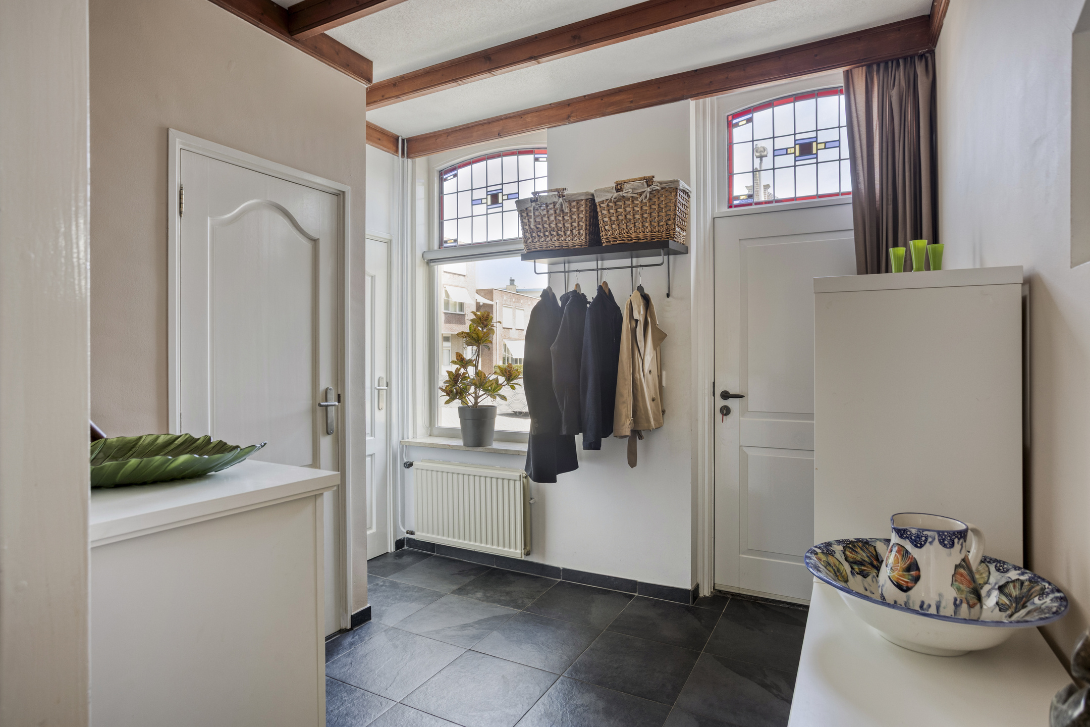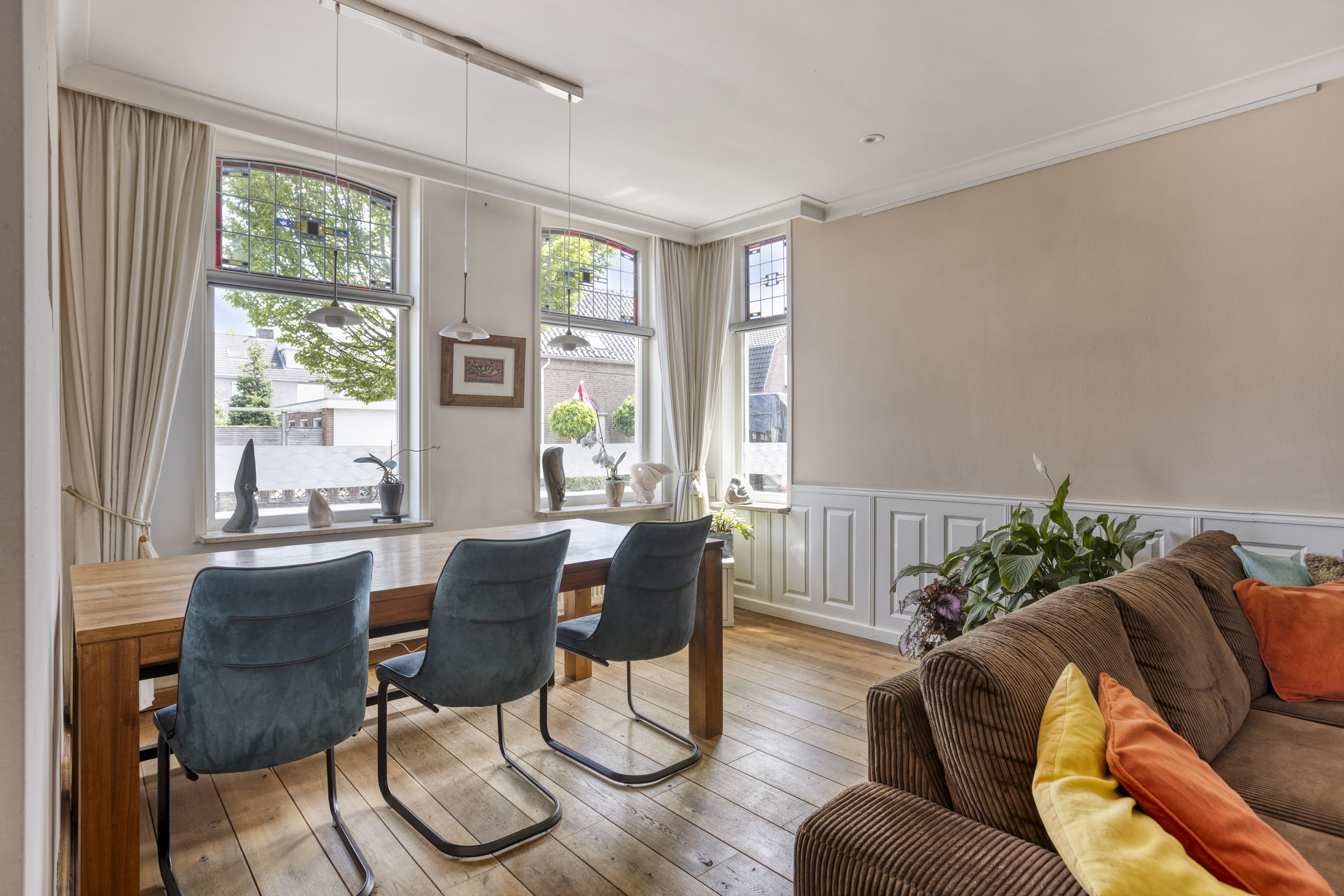 De karakteristieke voorgevel springt direct in het oog, met authentieke details zoals glas-in-loodramen die de woning een unieke uitstraling en een gemeentelijke monumentenstatus geven.