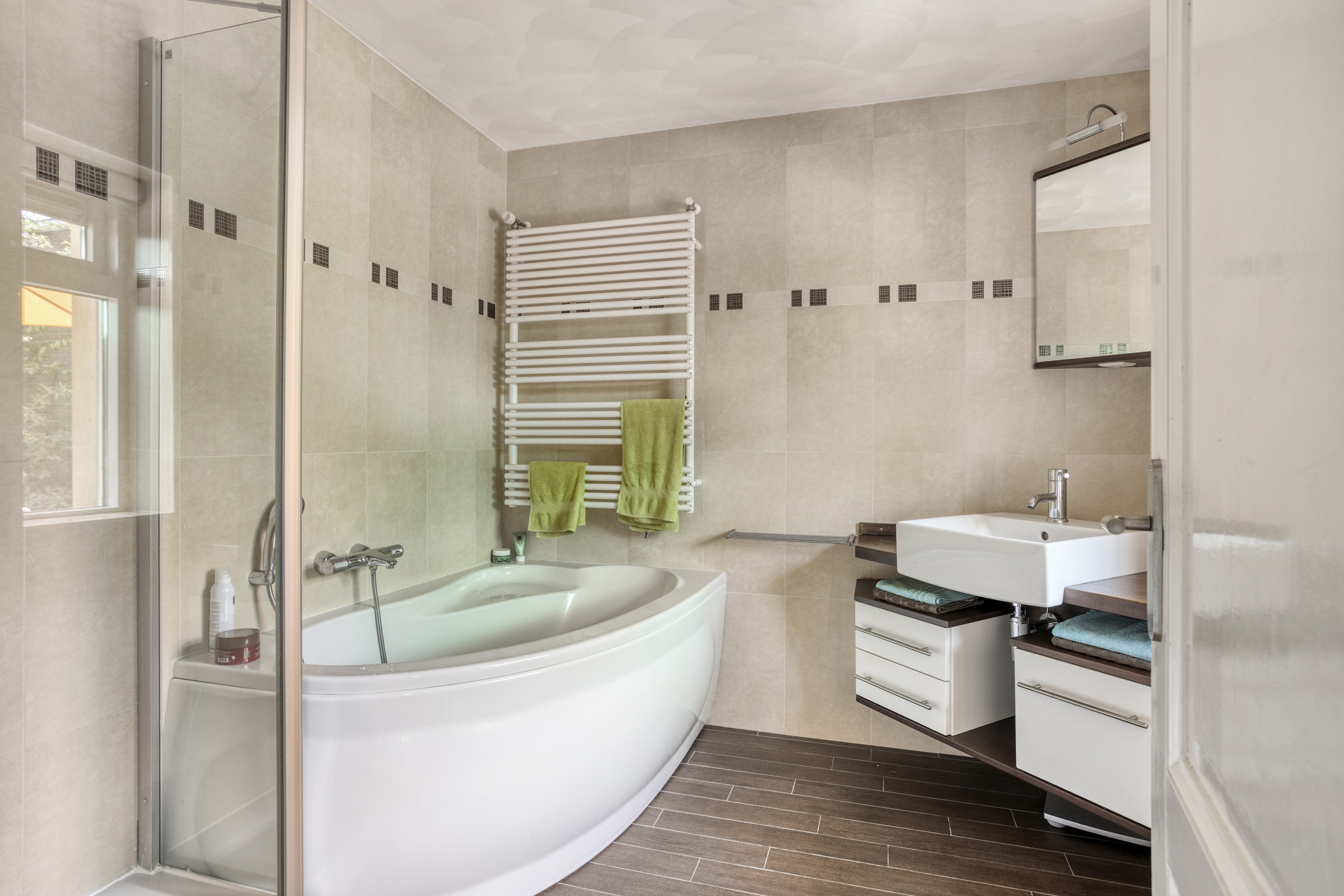 - Ligbad, douche, wastafel en wastafelmeubel