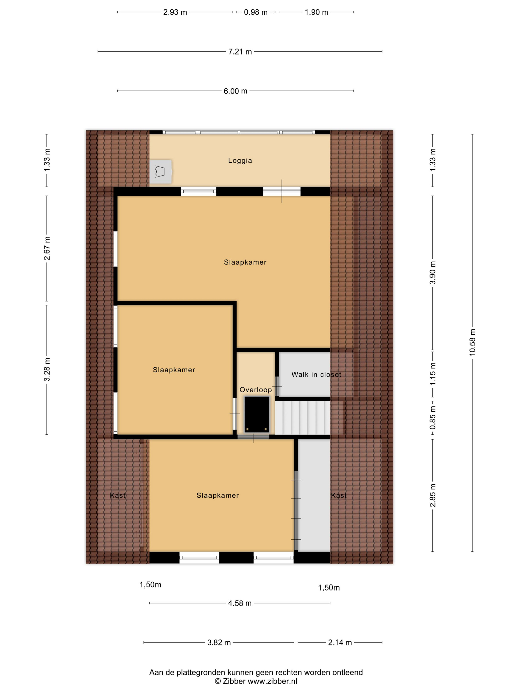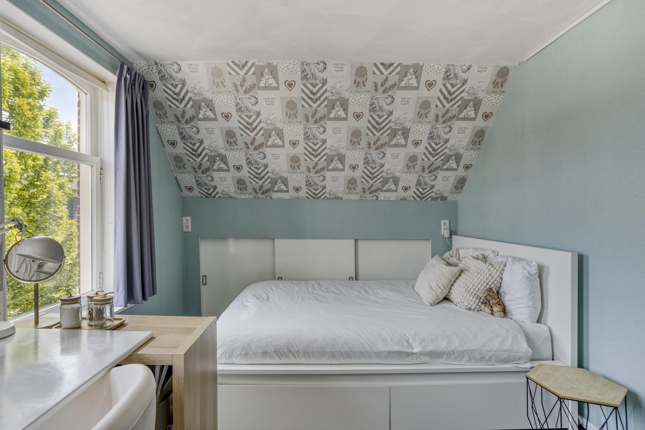 Via de trap bereik je de overloop op de eerste verdieping, waar je toegang hebt tot drie slaapkamers en een walk-in closet. De royale hoofdslaapkamer biedt genoeg ruimte voor een tweepersoonsbed en een grote kledingkast. Vanuit deze kamer heb je toegang tot een ruime loggia. Deze ruimte is multifunctioneel in te richten: om de was te drogen, als extra opslagruimte of om sporttoestellen te plaatsen. De overige twee slaapkamers zijn ook royaal en geschikt voor een tweepersoonsbed. Eén van deze kamers beschikt bovendien over handige en ruime bergruimte in de knieschotten en een walk-in closet, ideaal voor het opbergen van spullen. Dankzij de praktische indeling en de hoeveelheid kamers is dit echt een gezinsvriendelijke verdieping.