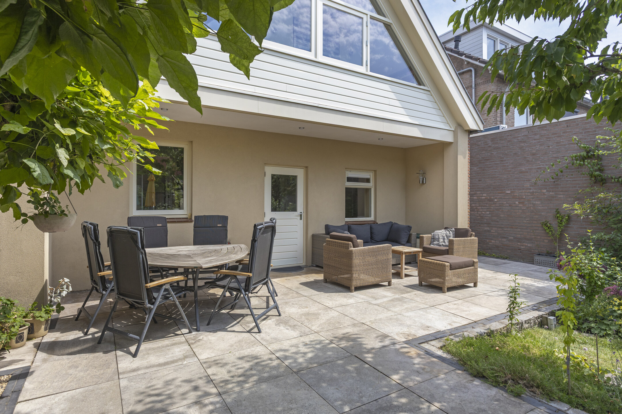 De zonnige tuin op het westen is een heerlijke plek om te ontspannen en biedt volop privacy. Dankzij de gunstige ligging geniet je hier tot in de avond van de zon. Er is genoeg ruimte voor meerdere zithoeken, een eettafel en een loungeset om lange zomeravonden door te brengen.