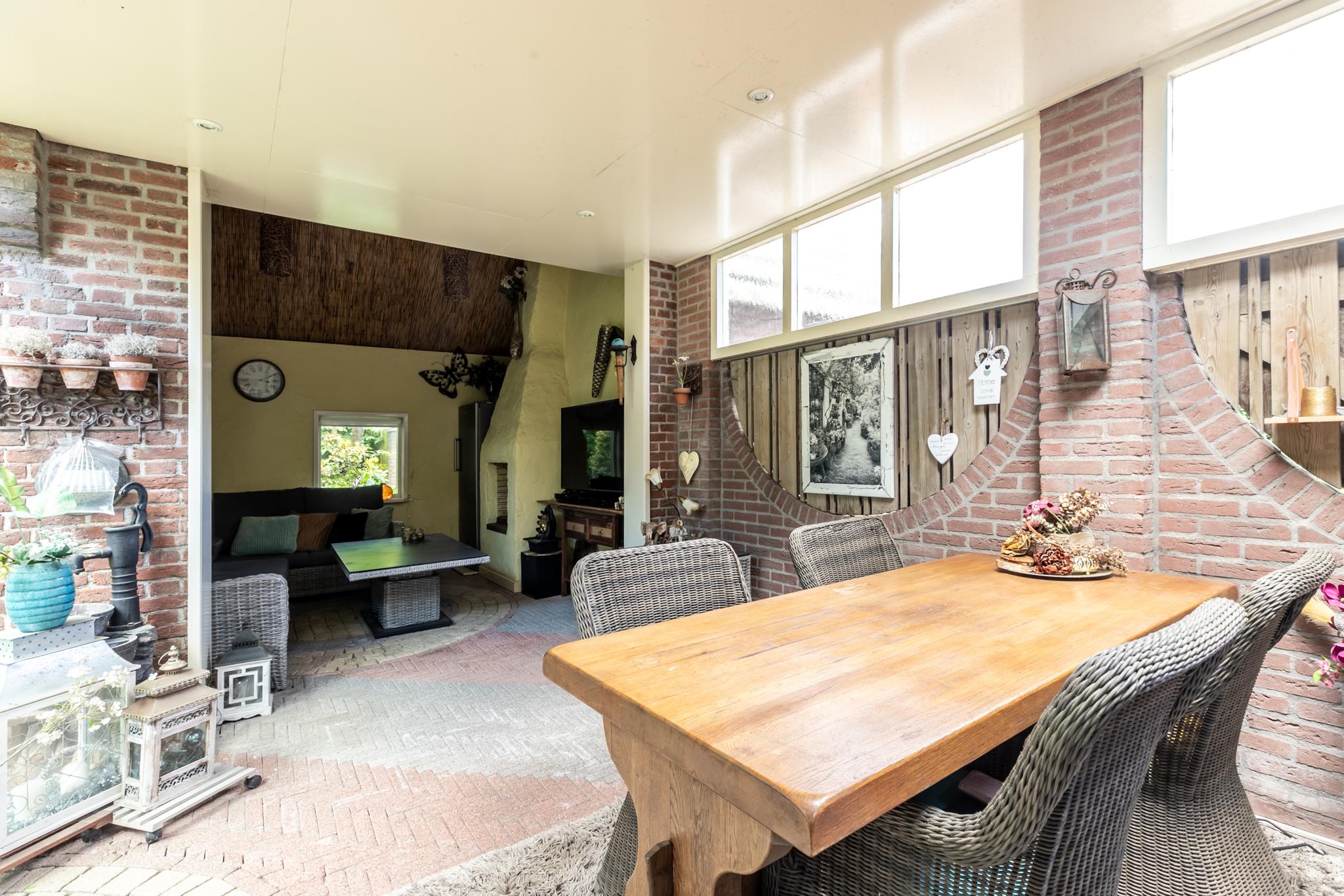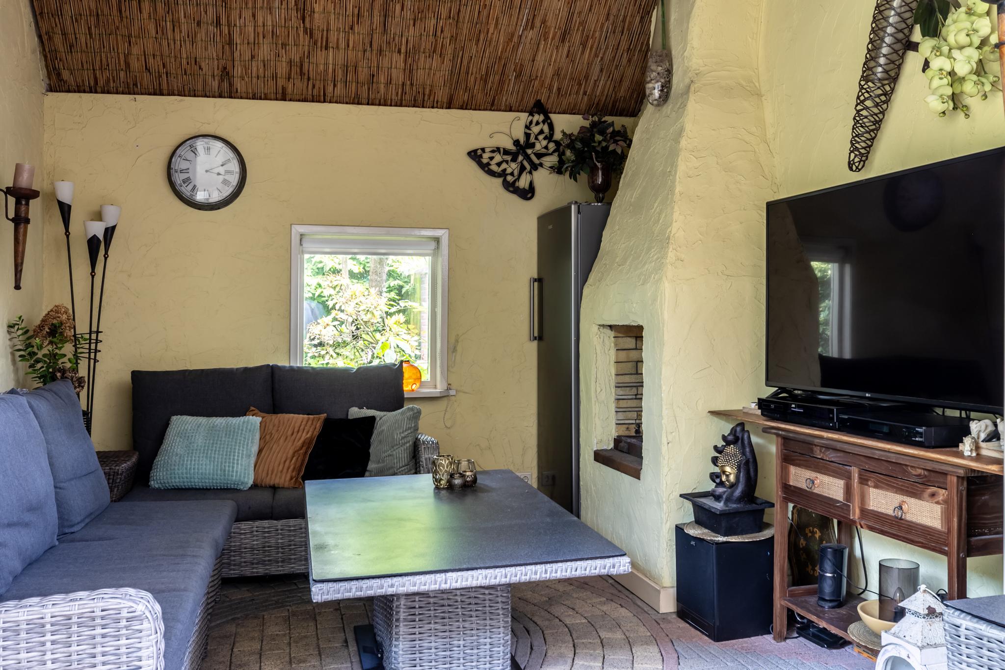 •Onder de overkapping die is afgesloten met een glazen schuifwand is een gezellige zithoek gecreëerd met houthaard en tv-aansluiting. De basis is al gelegd voor een man-cave of chillruimte.