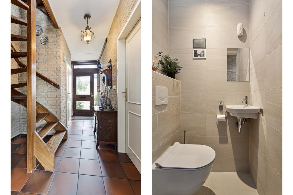 Via de voortuin te bereiken entree en hal met de meterkast, een trapopgang en een moderne toiletruimte met een vrijhangend toilet en fonteintje. De mechanische ventilatie is in 2022 vernieuwd.