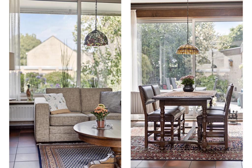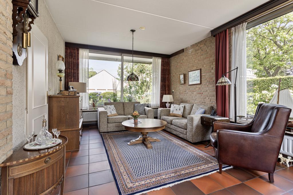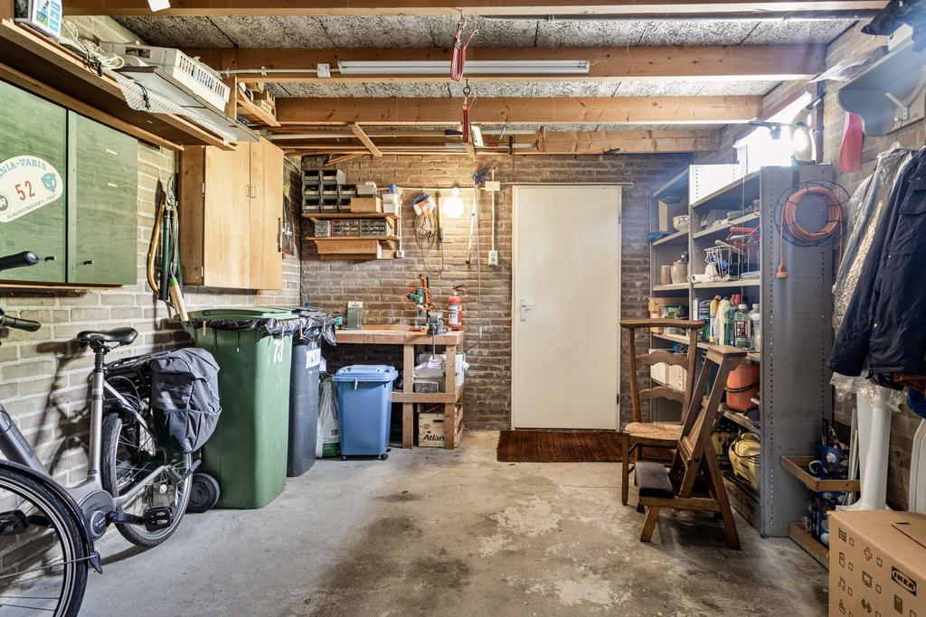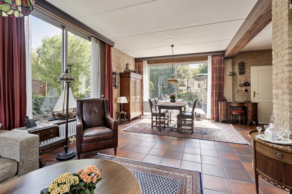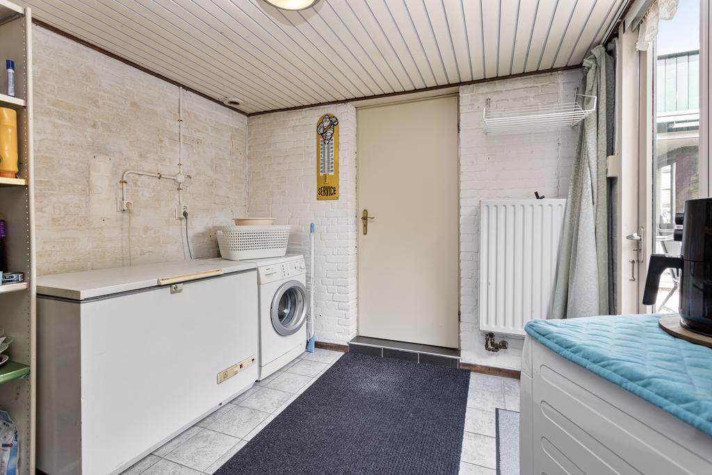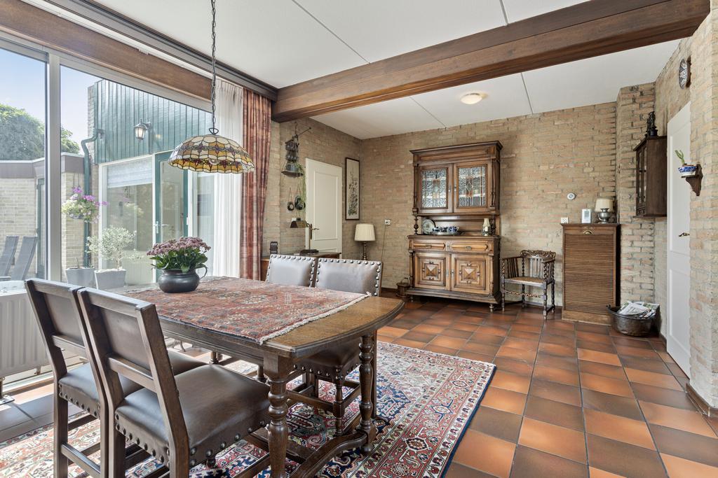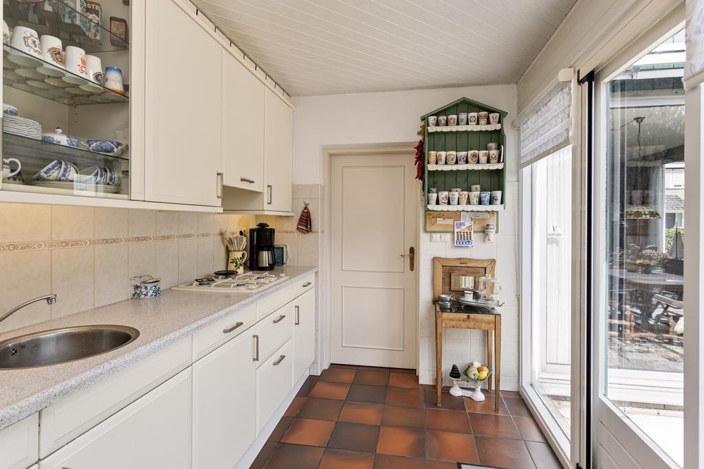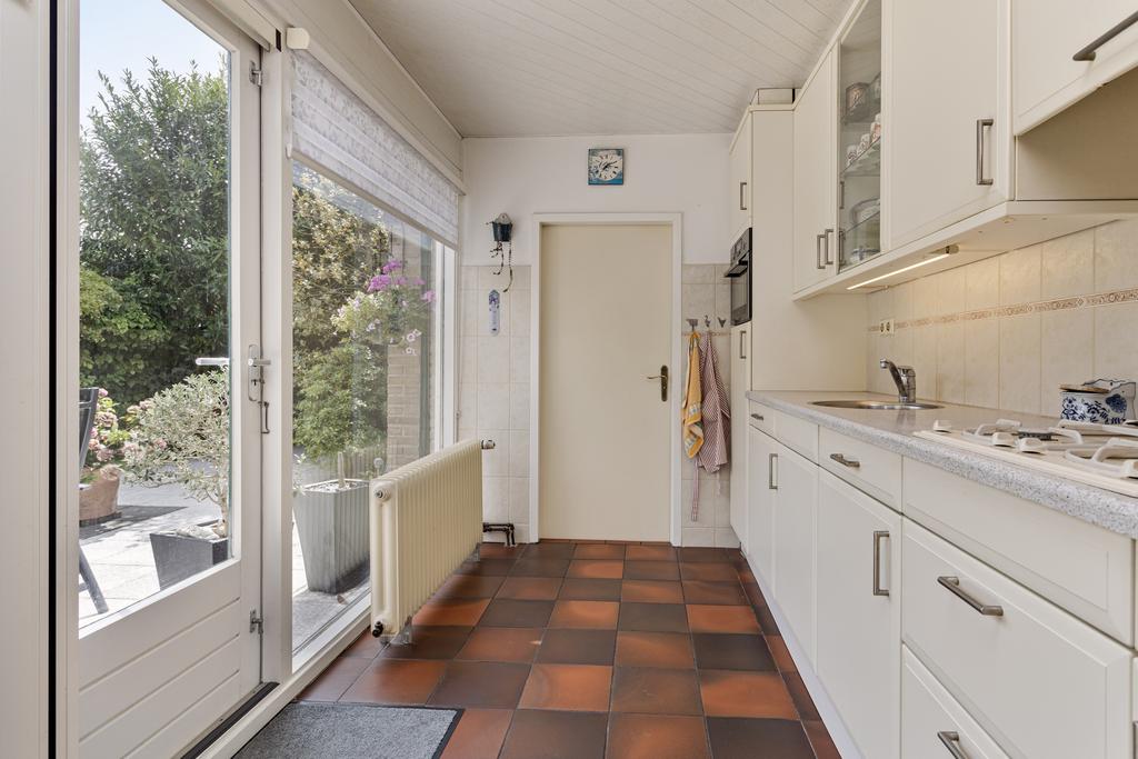 Sfeervolle L-vormige woonkamer met veel lichtinval en een grote schuifpui naar de achtertuin. Separate keuken in de aanbouw met een tuingerichte pui en een keukeninrichting in lichte kleurstellingen voorzien van diverse apparatuur (2002) zoals een 4-pits gaskookplaat, afzuigschouw, combi-oven, koelkast en een vaatwasser. Vanuit de keuken is er een doorloop naar de praktische bijkeuken met de aansluitingen voor de wasmachine en de droger. Vanuit de bijkeuken is inpandig de garage te bereiken.