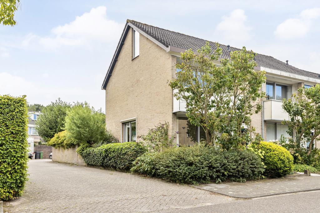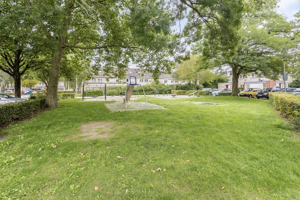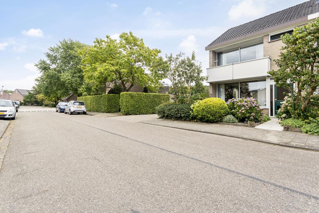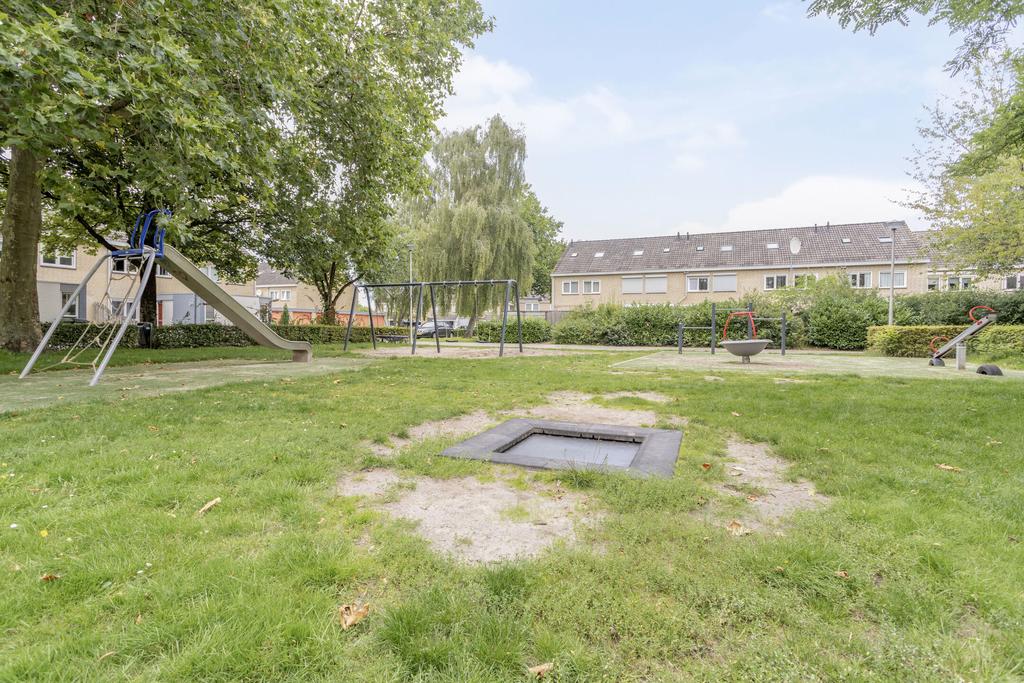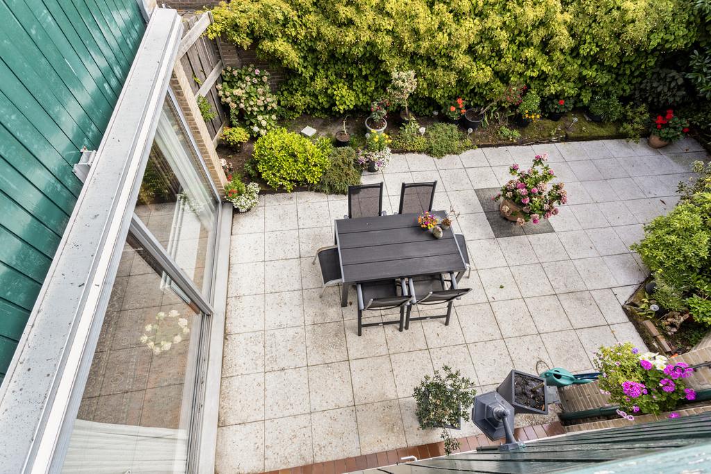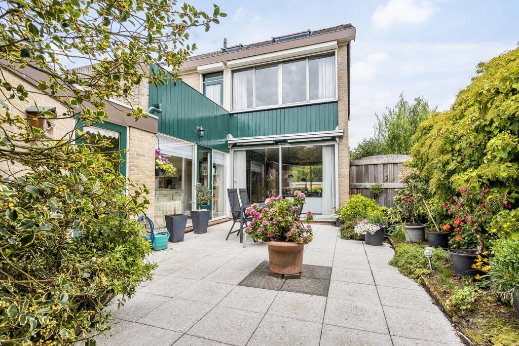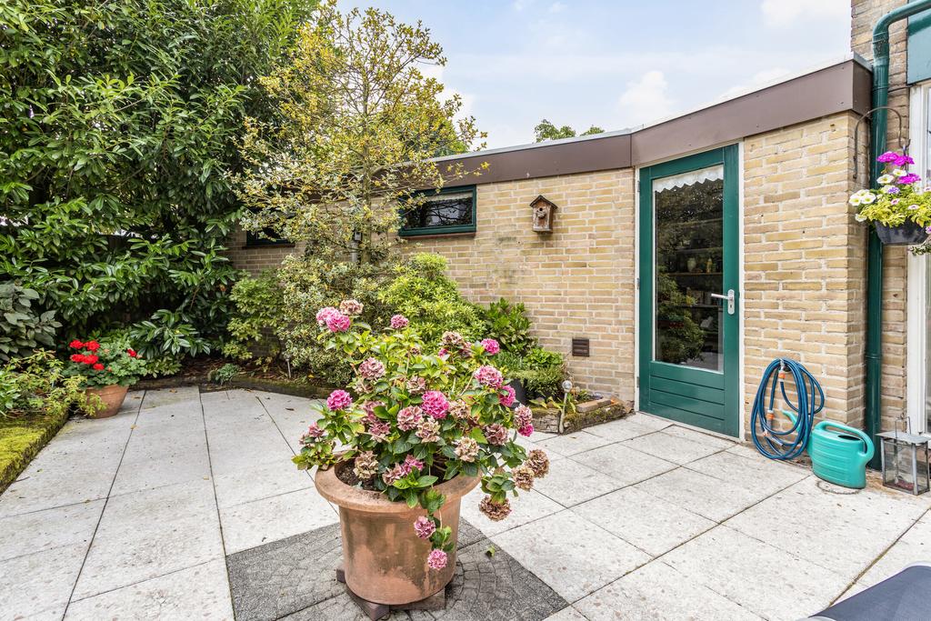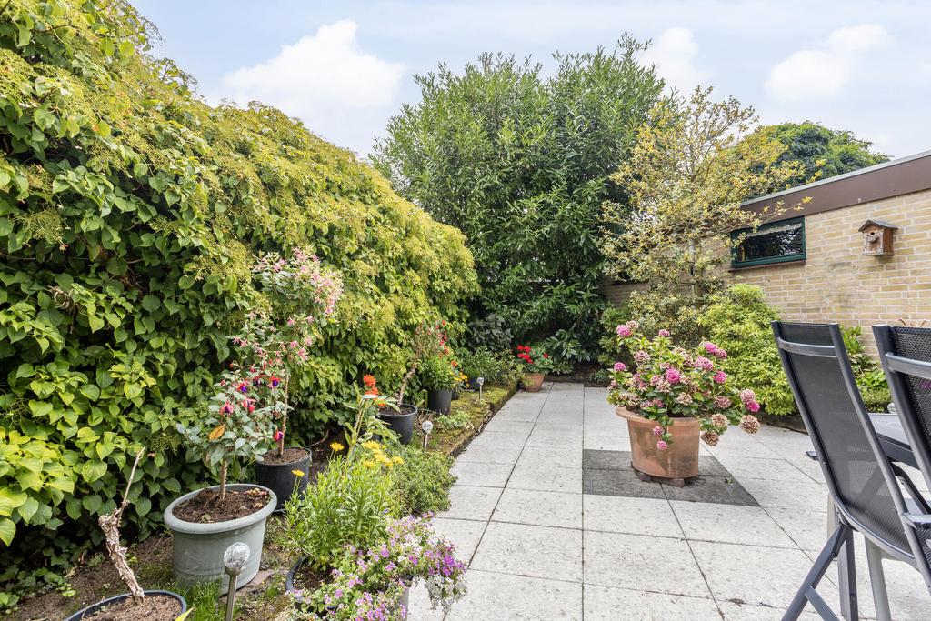 Groen aangelegde, gedeelte ommuurde achtertuin op het zuiden met groot zonnescherm en mogelijk achterom en tevens toegang tot de bijkeuken. De tuin biedt veel privacy en is voorzien van bestrating en veel groenborders. Aan de achterzijde van de woning ligt een pleintje wat ideaal is voor kinderen om te spelen. Vanuit het pleintje is tevens de garage met de auto bereikbaar.