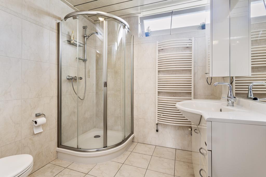 Overloop met een vaste bergkast. Keurige, geheel betegelde badkamer (2003) met een wastafelmeubel, douche, designradiator en een vrijhangend toilet.