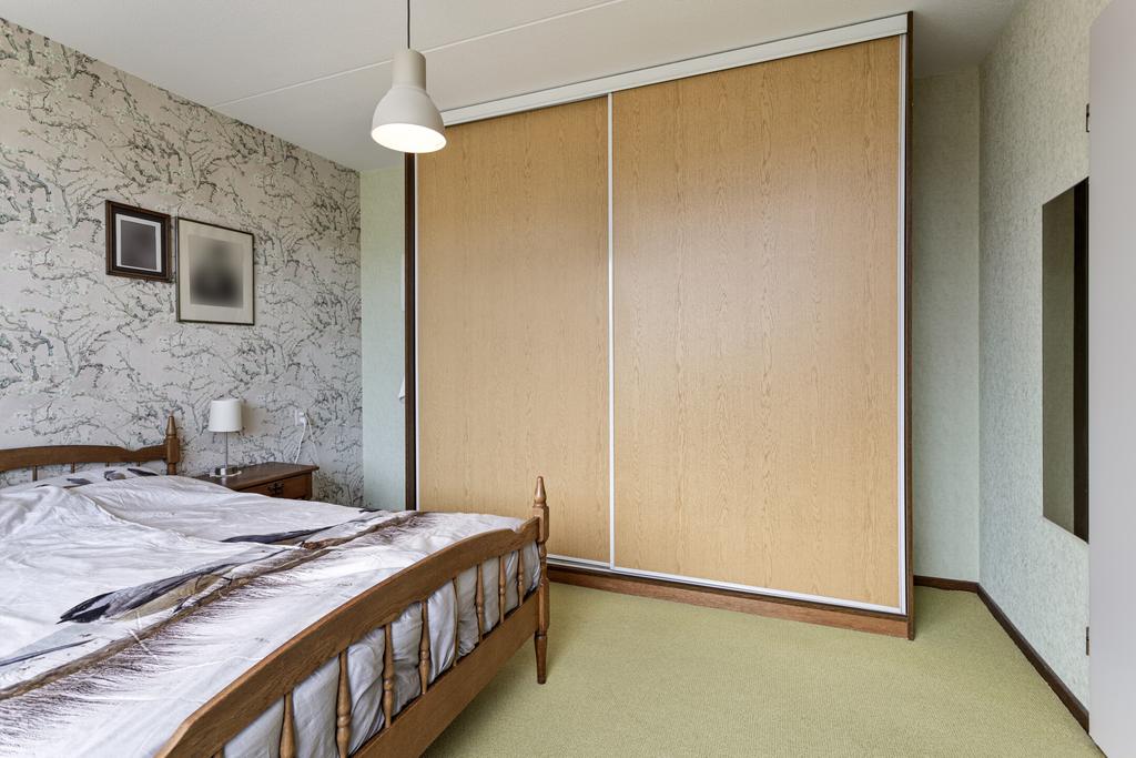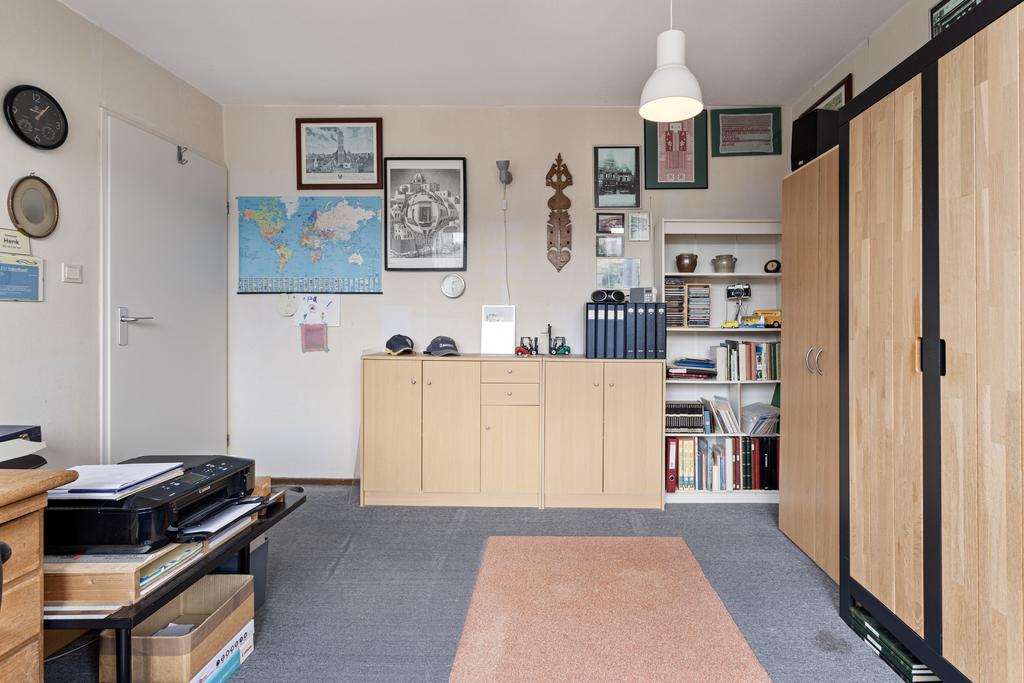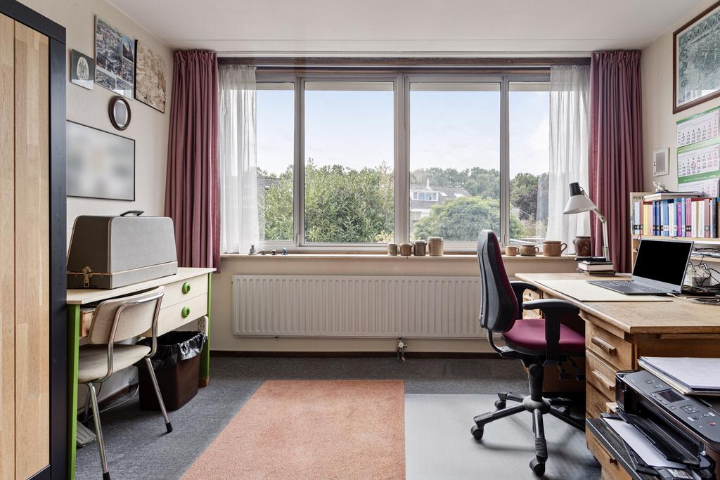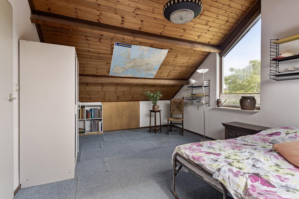 De vierde slaapkamer is zeer ruim en licht, mede dankzij het extra dakraam. Er is onder de schuine kanten veel bergruimte gecreëerd door middel van knieschotten.