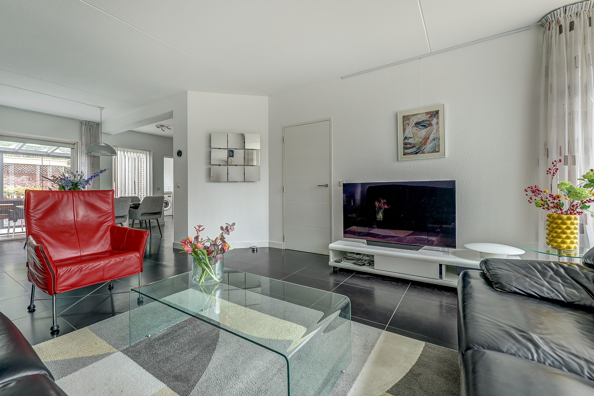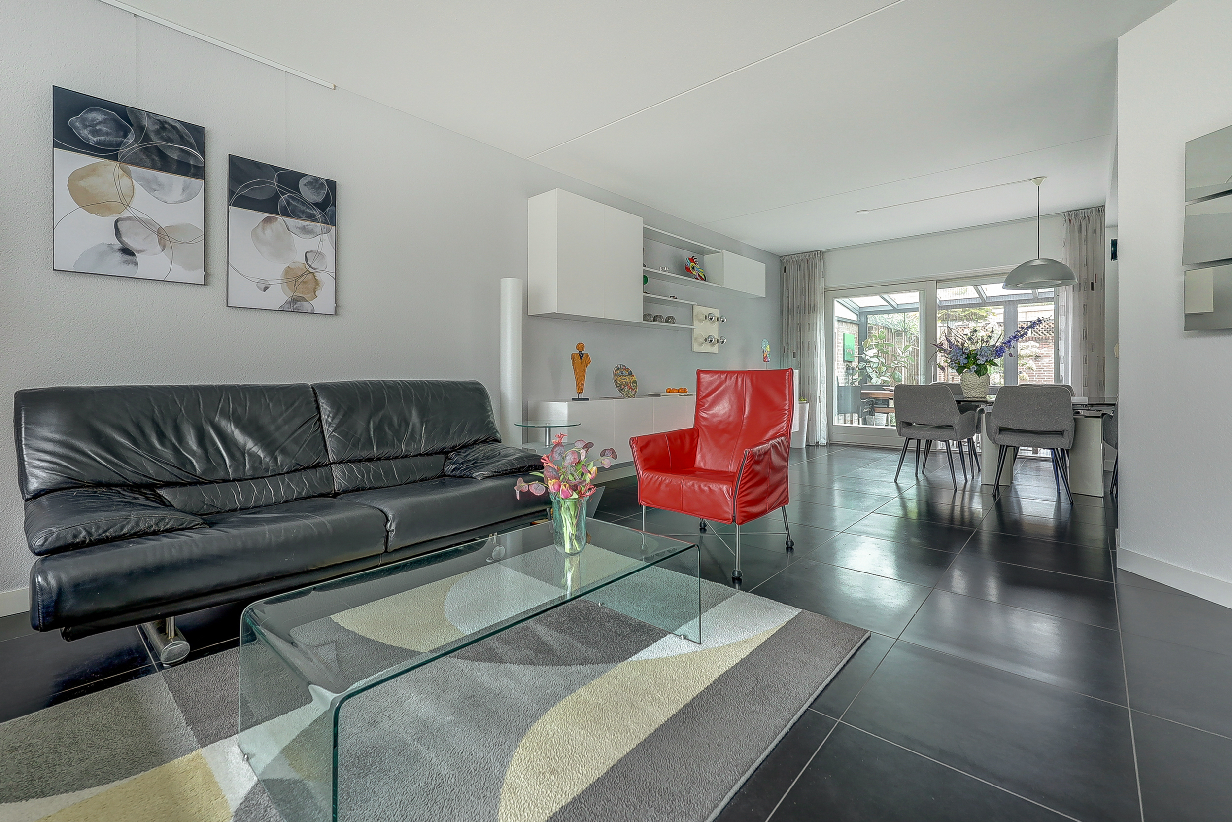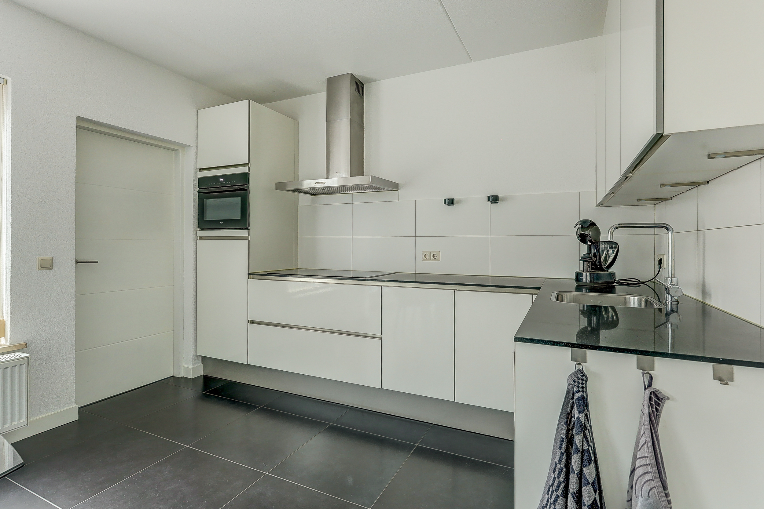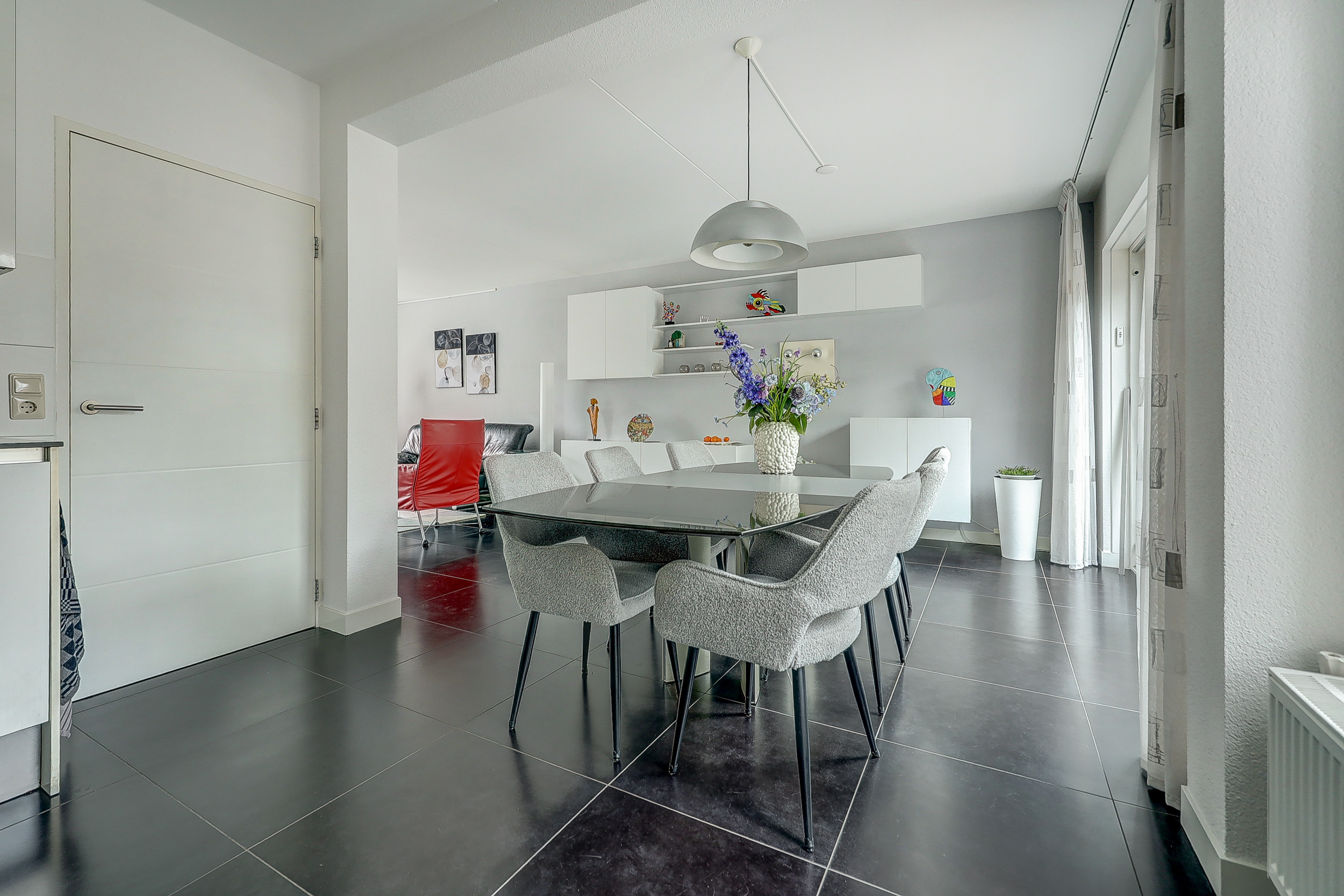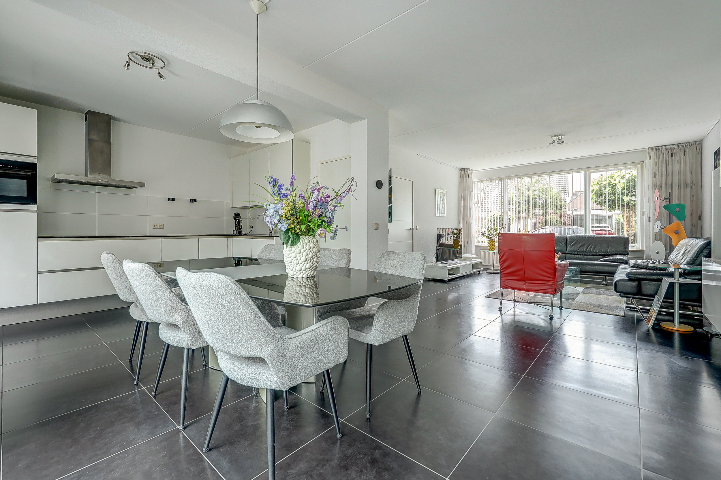 Zodra je de woning binnenstapt via de ruime hal, word je direct verrast door de ruimte en de strakke afwerking. De begane grond is modern ingericht met een stijlvolle zwarte tegelvloer en lichte kleurstellingen, wat zorgt voor een frisse en eigentijdse uitstraling. De woonkamer is ruim opgezet en slim ingedeeld. Aan de voorzijde bevindt zich de gezellige zitkamer, waar met gemak een royale bank, salontafel, extra zitplekken én een tv-meubel geplaatst kunnen worden. Dankzij de grote raampartijen aan zowel de voor- als achterzijde baadt de hele ruimte in natuurlijk daglicht. Aan de achterzijde vind je de eetkamer, waar voldoende plek is voor een grote eettafel om uitgebreid te tafelen met familie of vrienden. De keuken, die voorheen afgesloten was, is inmiddels volledig geïntegreerd in de leefruimte. Hierdoor is een open sfeer ontstaan waarin koken en leven samenkomen. De moderne keuken is uitgevoerd in lichte kleuren en voorzien van hoogwaardige inbouwapparatuur, waaronder een inductiekookplaat, combi-oven, afzuigkap, vaatwasser, koelkast en een spoelbak. Extra opbergruimte vind je in de kastruimte langs het aanrechtblad – ideaal voor voorraad en keukengerei. Direct grenzend aan de keuken bevindt zich de praktische bijkeuken, met aansluitingen voor de wasmachine en droger. Hier is bovendien ruimte voor een extra koelkast en/of vriezer – een fijne aanvulling voor het dagelijks gemak. In de hal tref je verder nog een keurig afgewerkt, apart toilet met fonteintje én de meterkast.