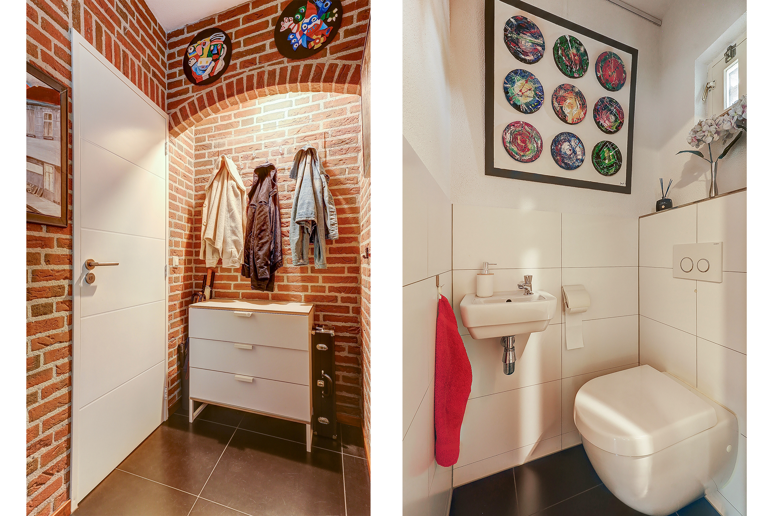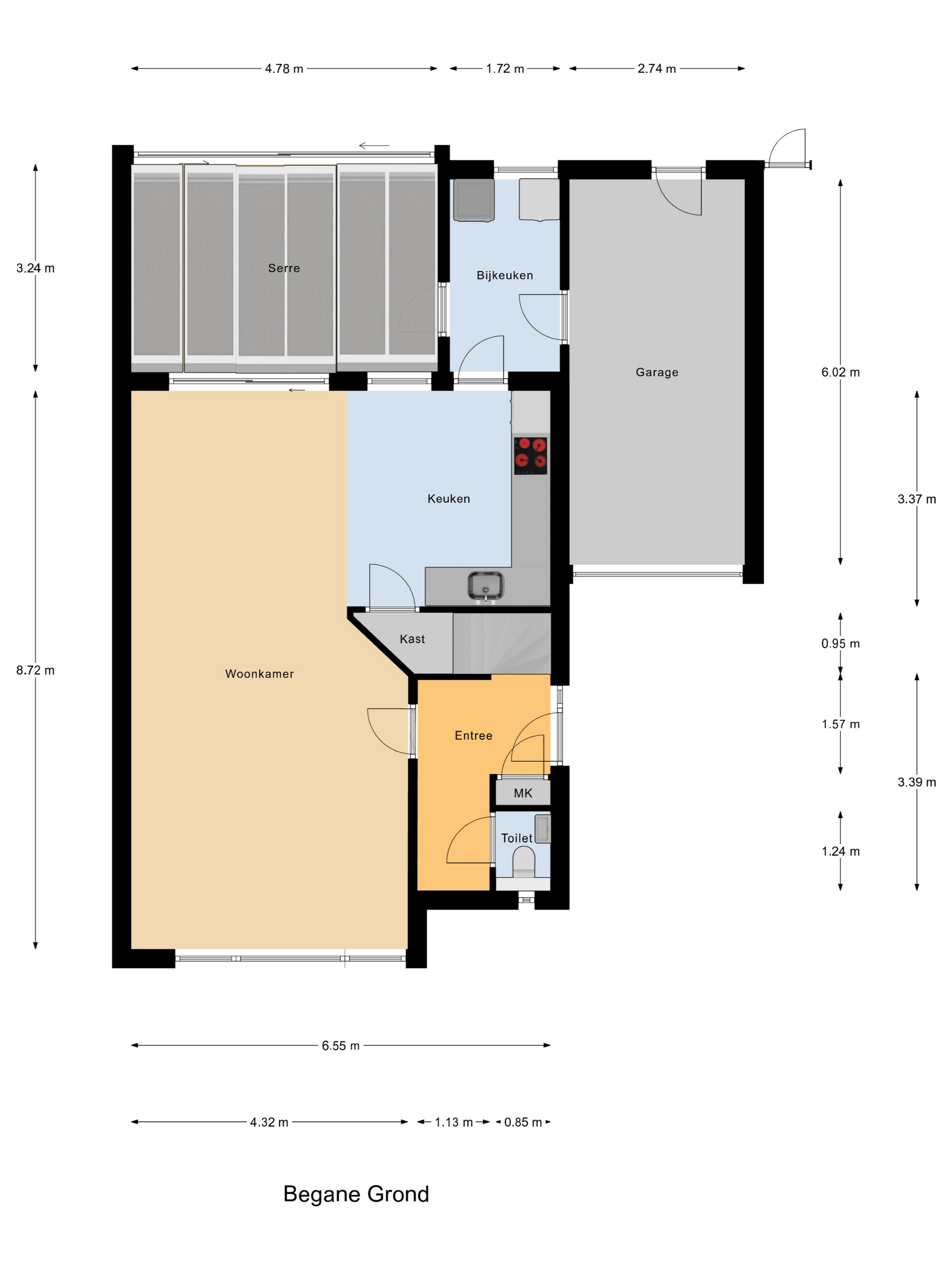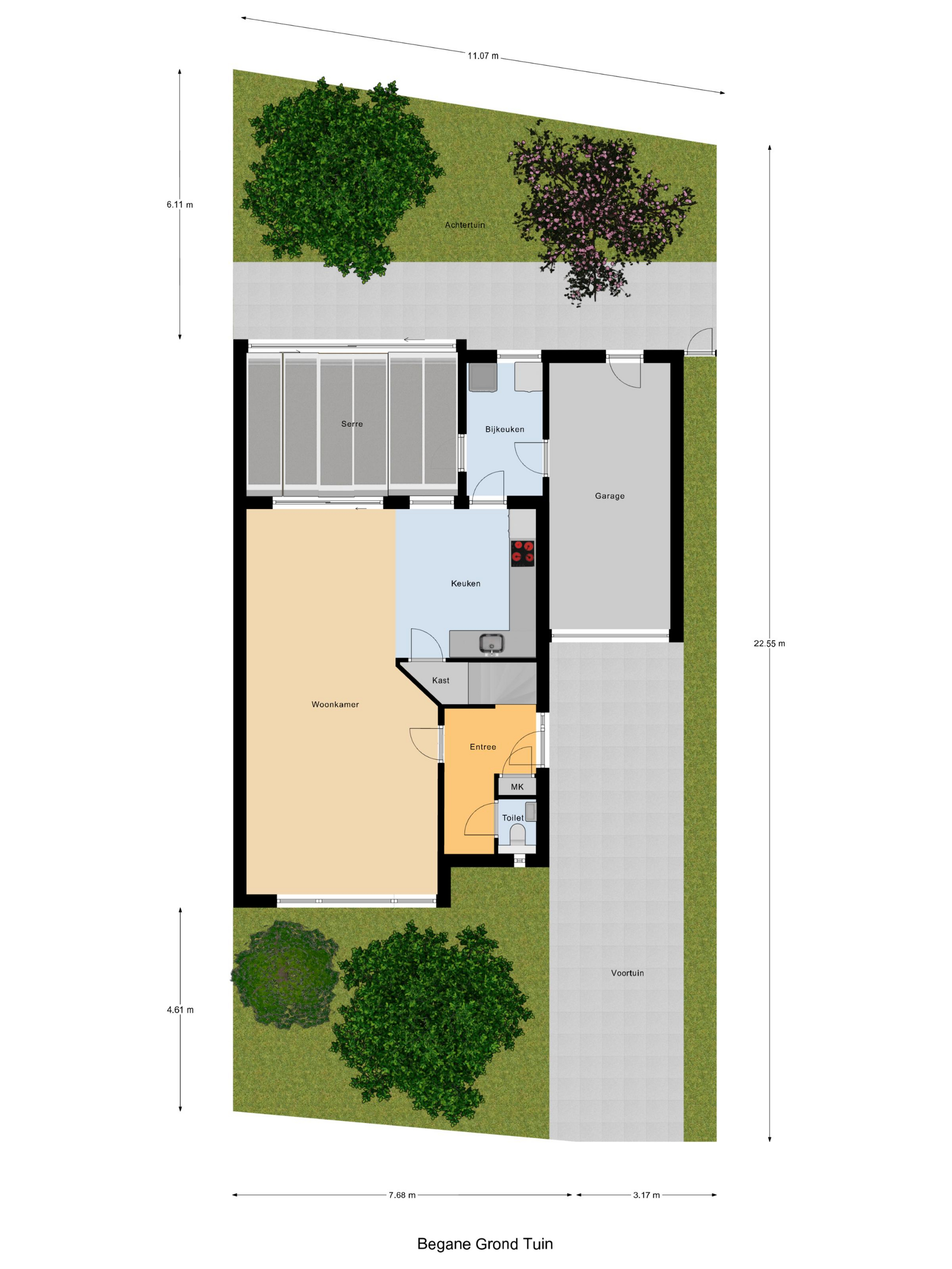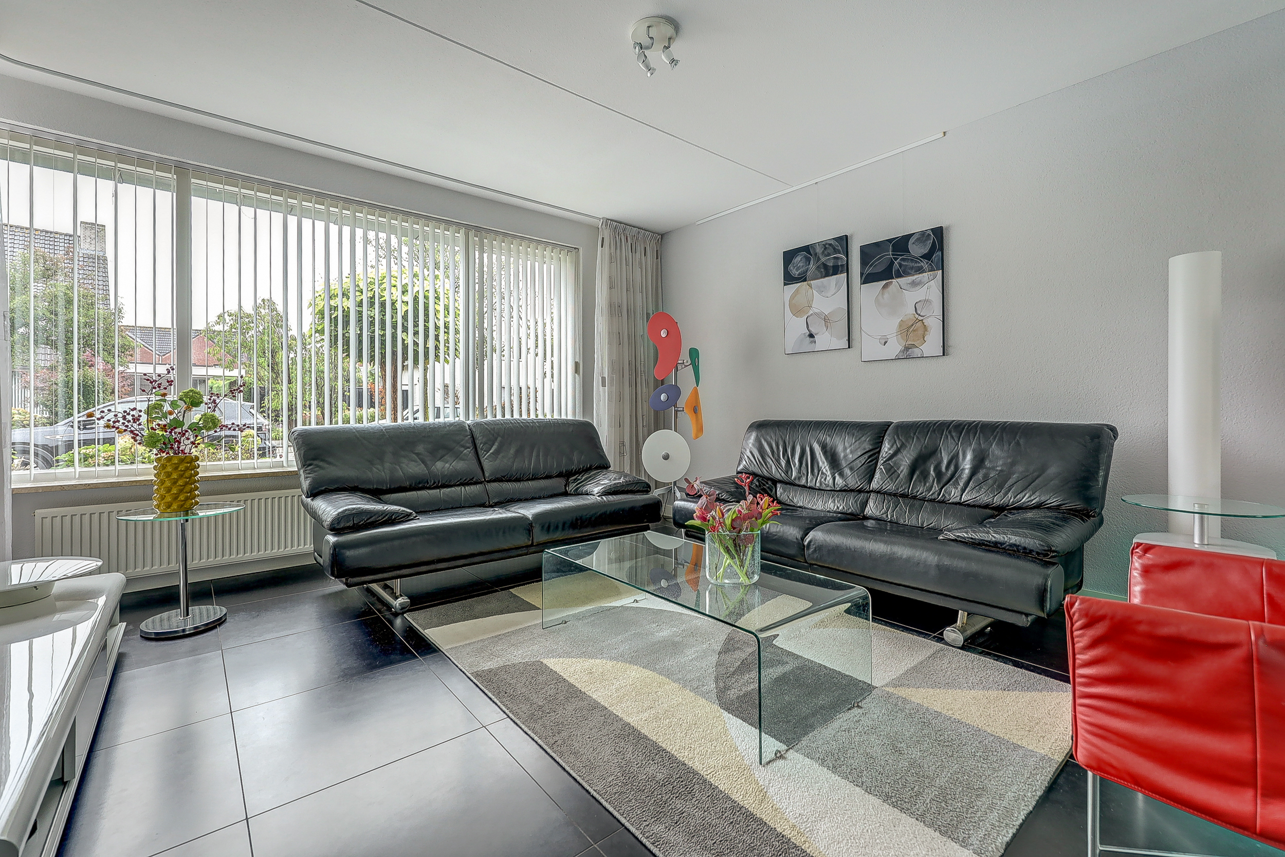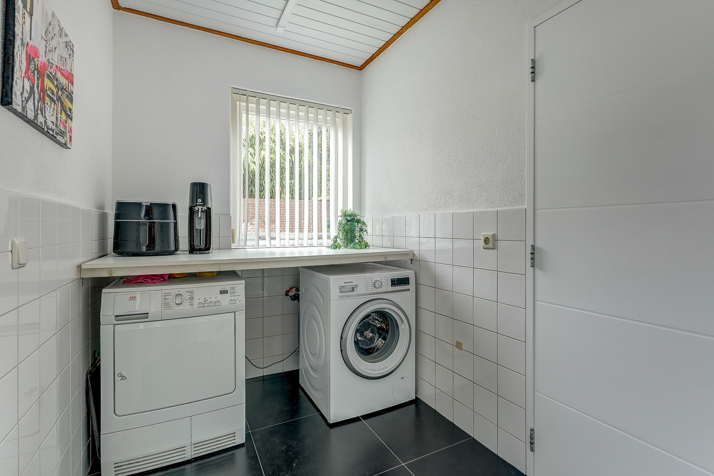 Zodra je de woning binnenstapt via de ruime hal, word je direct verrast door de ruimte en de strakke afwerking. De begane grond is modern ingericht met een stijlvolle zwarte tegelvloer en lichte kleurstellingen, wat zorgt voor een frisse en eigentijdse uitstraling. De woonkamer is ruim opgezet en slim ingedeeld. Aan de voorzijde bevindt zich de gezellige zitkamer, waar met gemak een royale bank, salontafel, extra zitplekken én een tv-meubel geplaatst kunnen worden. Dankzij de grote raampartijen aan zowel de voor- als achterzijde baadt de hele ruimte in natuurlijk daglicht. Aan de achterzijde vind je de eetkamer, waar voldoende plek is voor een grote eettafel om uitgebreid te tafelen met familie of vrienden. De keuken, die voorheen afgesloten was, is inmiddels volledig geïntegreerd in de leefruimte. Hierdoor is een open sfeer ontstaan waarin koken en leven samenkomen. De moderne keuken is uitgevoerd in lichte kleuren en voorzien van hoogwaardige inbouwapparatuur, waaronder een inductiekookplaat, combi-oven, afzuigkap, vaatwasser, koelkast en een spoelbak. Extra opbergruimte vind je in de kastruimte langs het aanrechtblad – ideaal voor voorraad en keukengerei. Direct grenzend aan de keuken bevindt zich de praktische bijkeuken, met aansluitingen voor de wasmachine en droger. Hier is bovendien ruimte voor een extra koelkast en/of vriezer – een fijne aanvulling voor het dagelijks gemak. In de hal tref je verder nog een keurig afgewerkt, apart toilet met fonteintje én de meterkast.