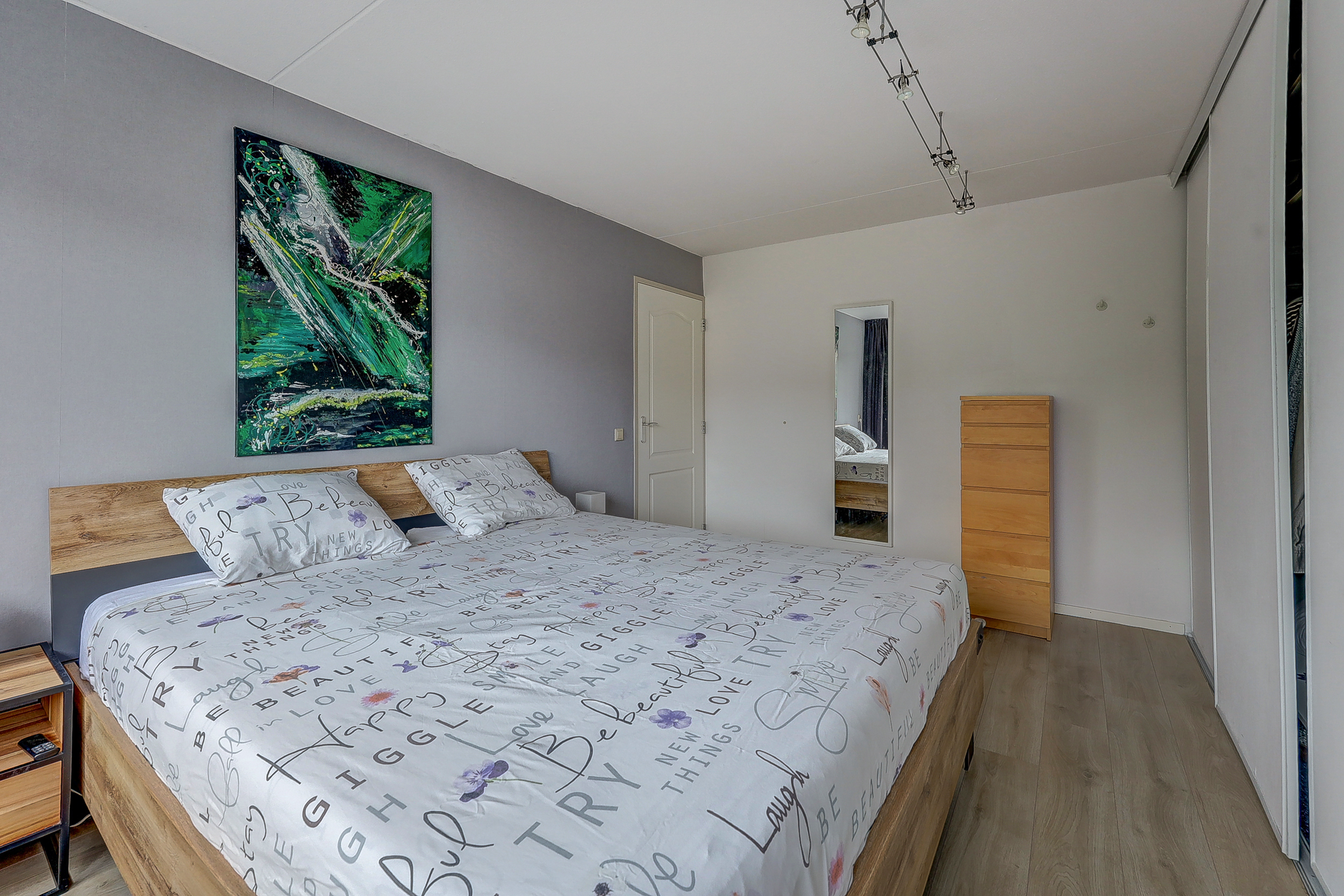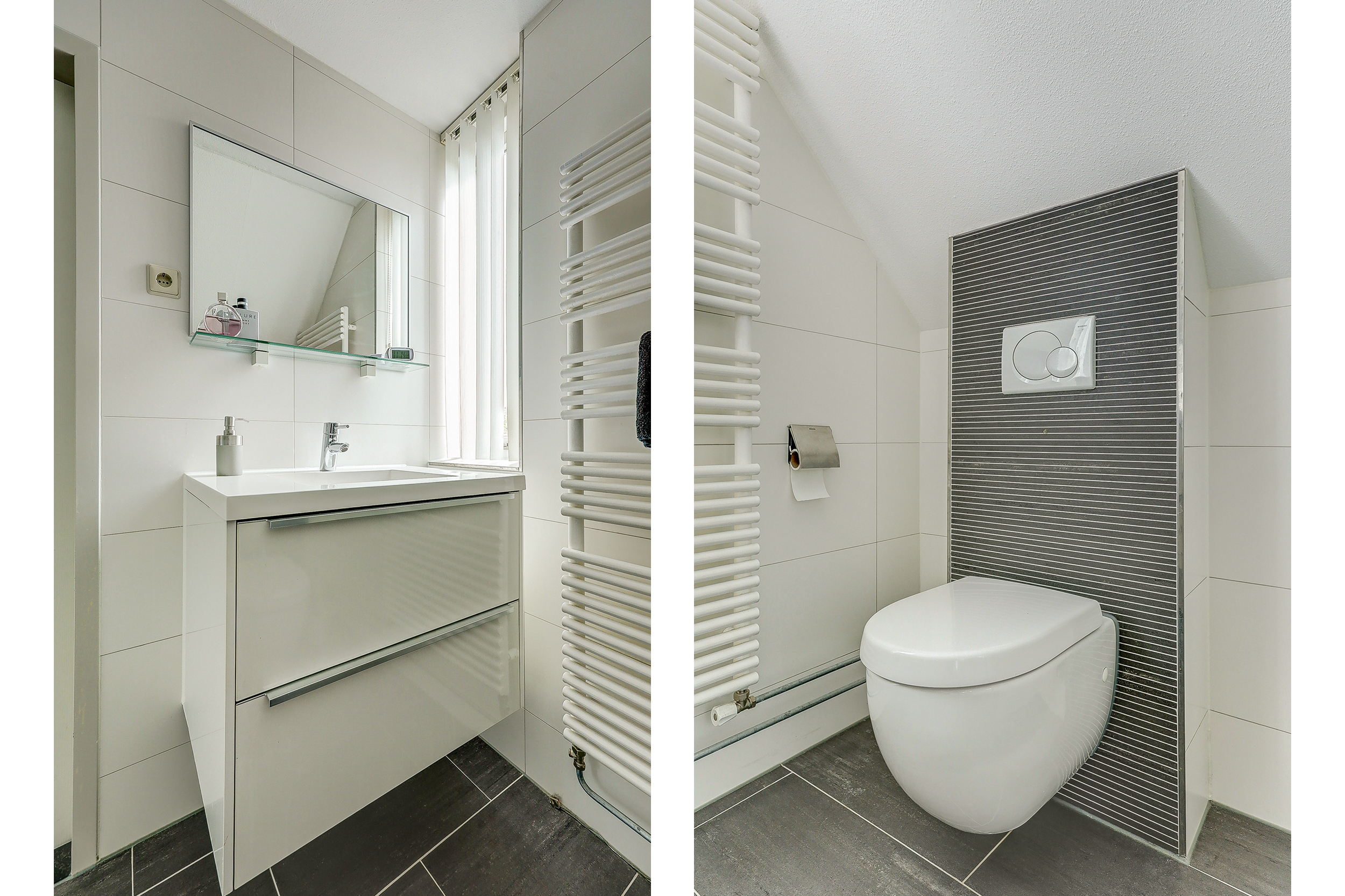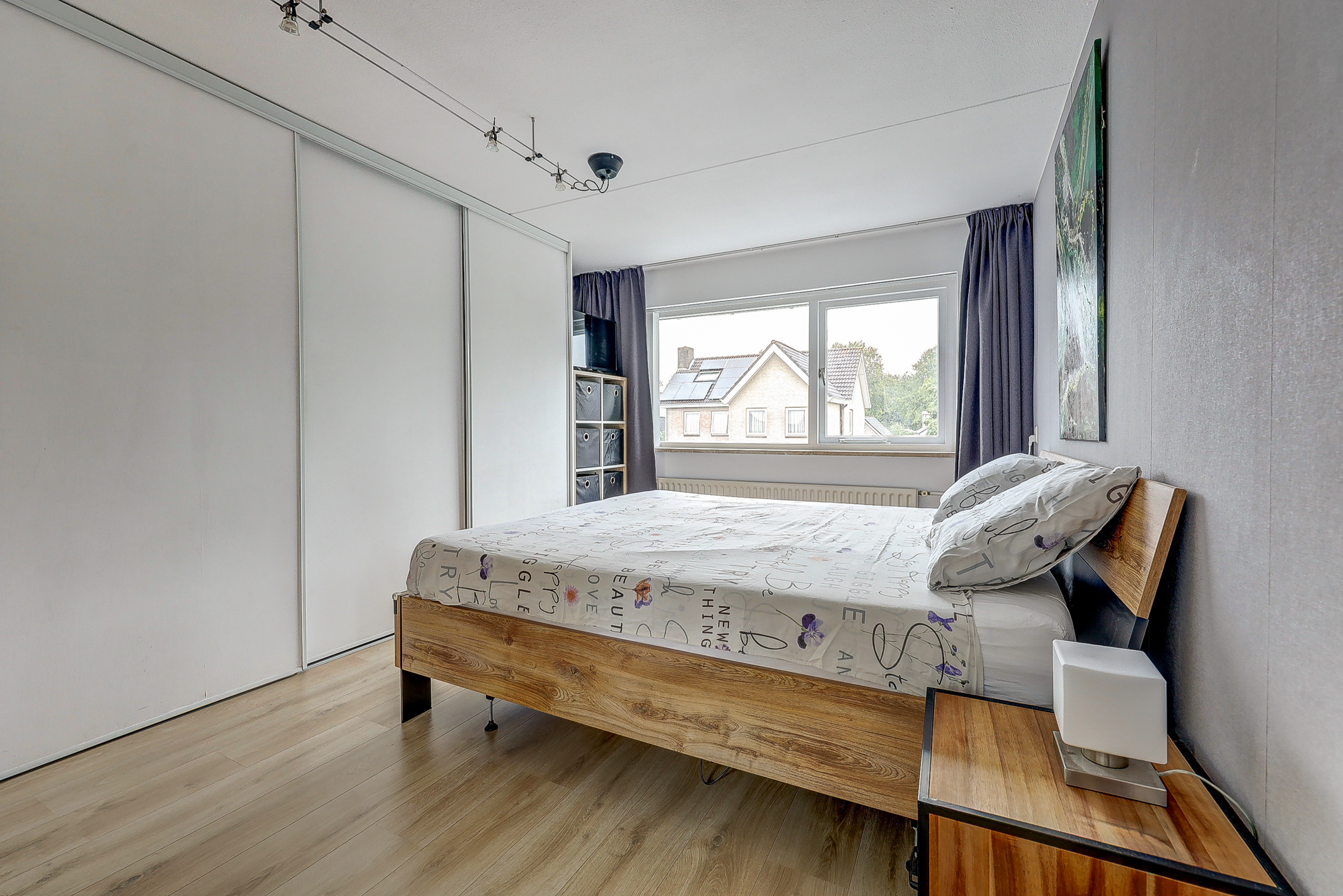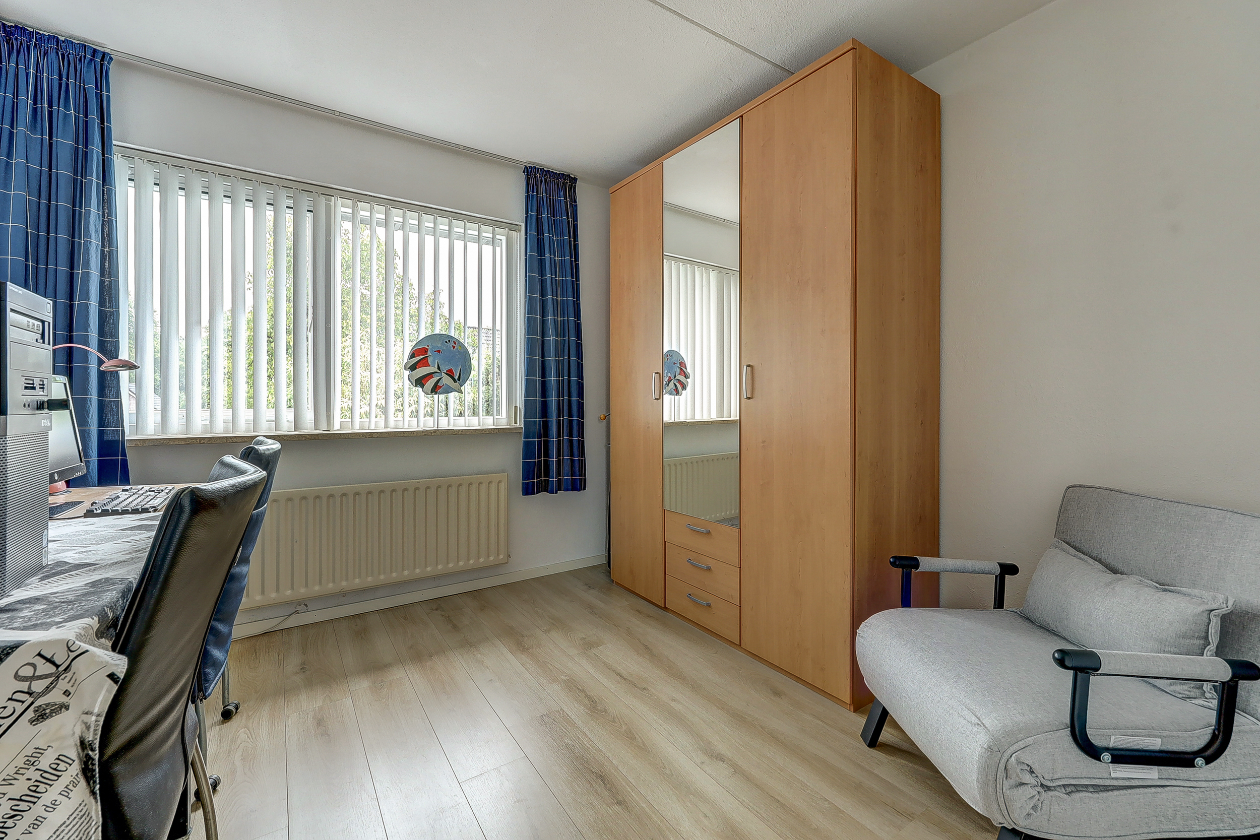 De tweede slaapkamer, direct naastgelegen, beschikt eveneens over een ingebouwde kast en is zeer geschikt als kinderkamer, logeerkamer of thuiskantoor. De derde slaapkamer is extra licht en ruim dankzij een dakkapel, wat deze kamer multifunctioneel inzetbaar maakt.