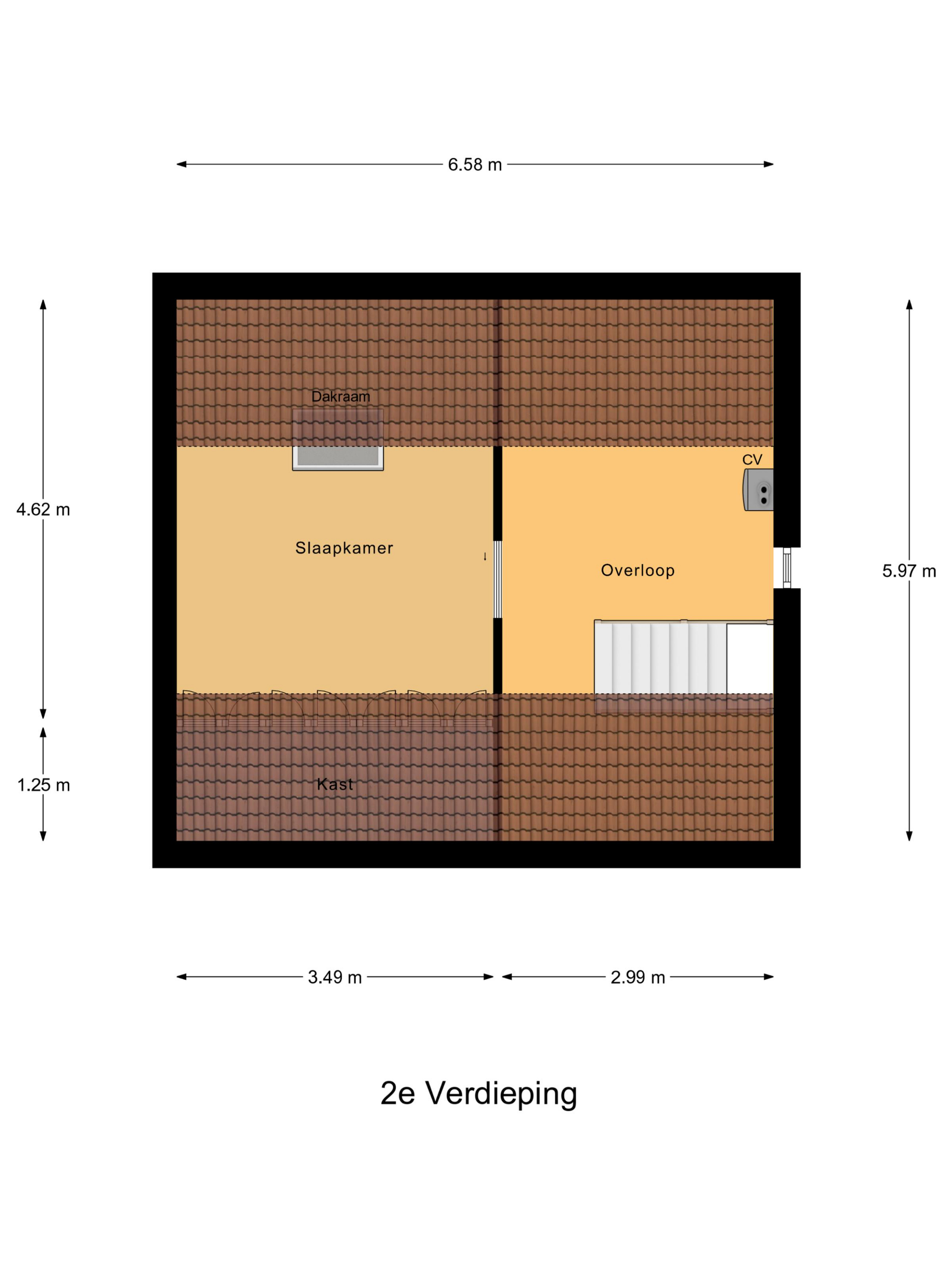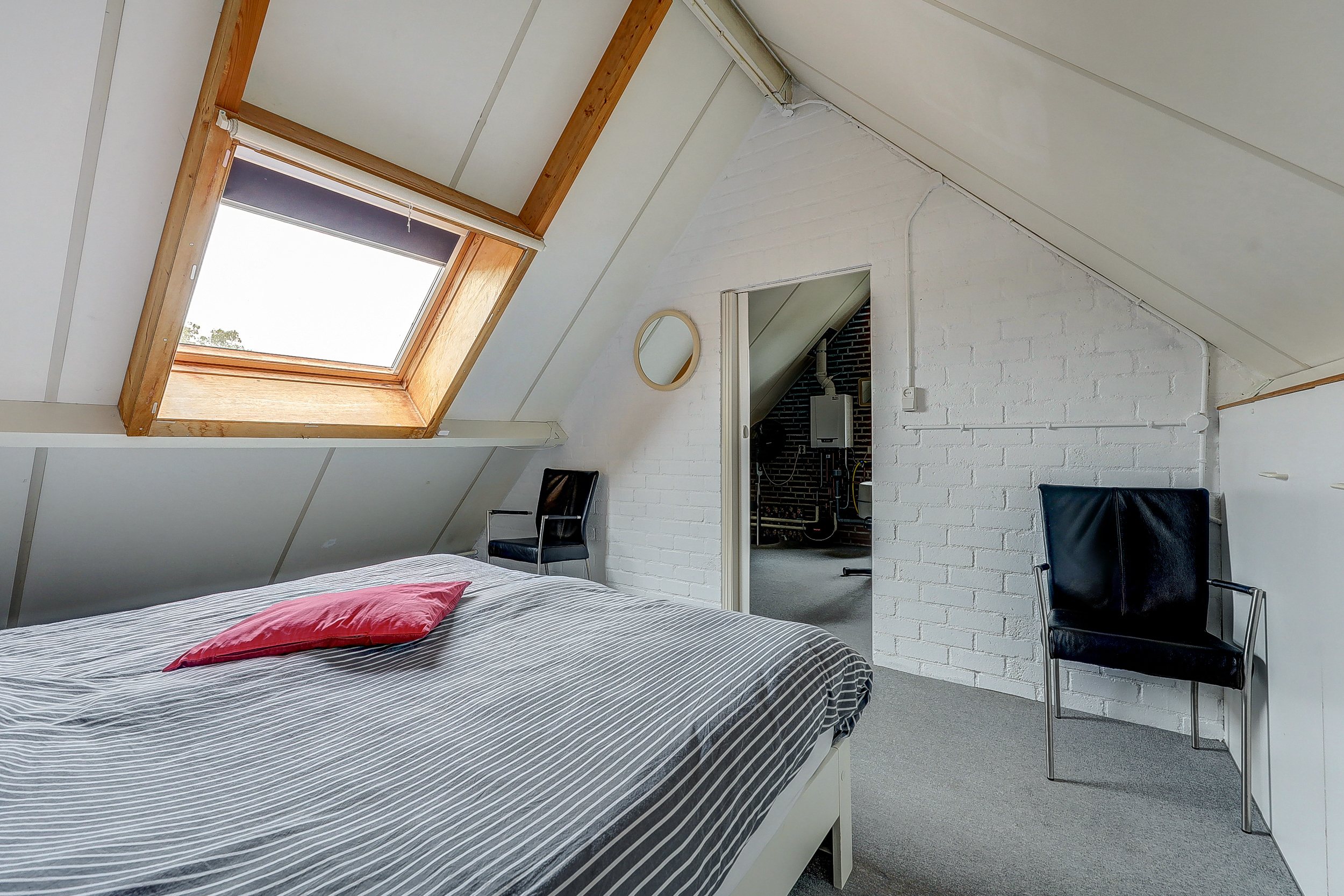 De tweede verdieping is via een vaste trap bereikbaar en biedt verrassend veel ruimte. Hier vinden we de vierde slaapkamer en een ruime overloop. De vierde slaapkamer leent zich uitstekend als hoofdslaapkamer, tienerkamer of rustige werkplek. Er is voldoende ruimte voor een tweepersoonsbed met nachtkastjes, en de kastruimte onder de knieschotten biedt praktische opbergmogelijkheden. Dankzij het dakraam is de kamer bovendien aangenaam licht en kan er extra worden geventileerd. De ruime overloop biedt plaats aan de CV-installatie en vormt tevens een handige plek voor het opbergen van extra spullen, koffers of seizoensgebonden items.