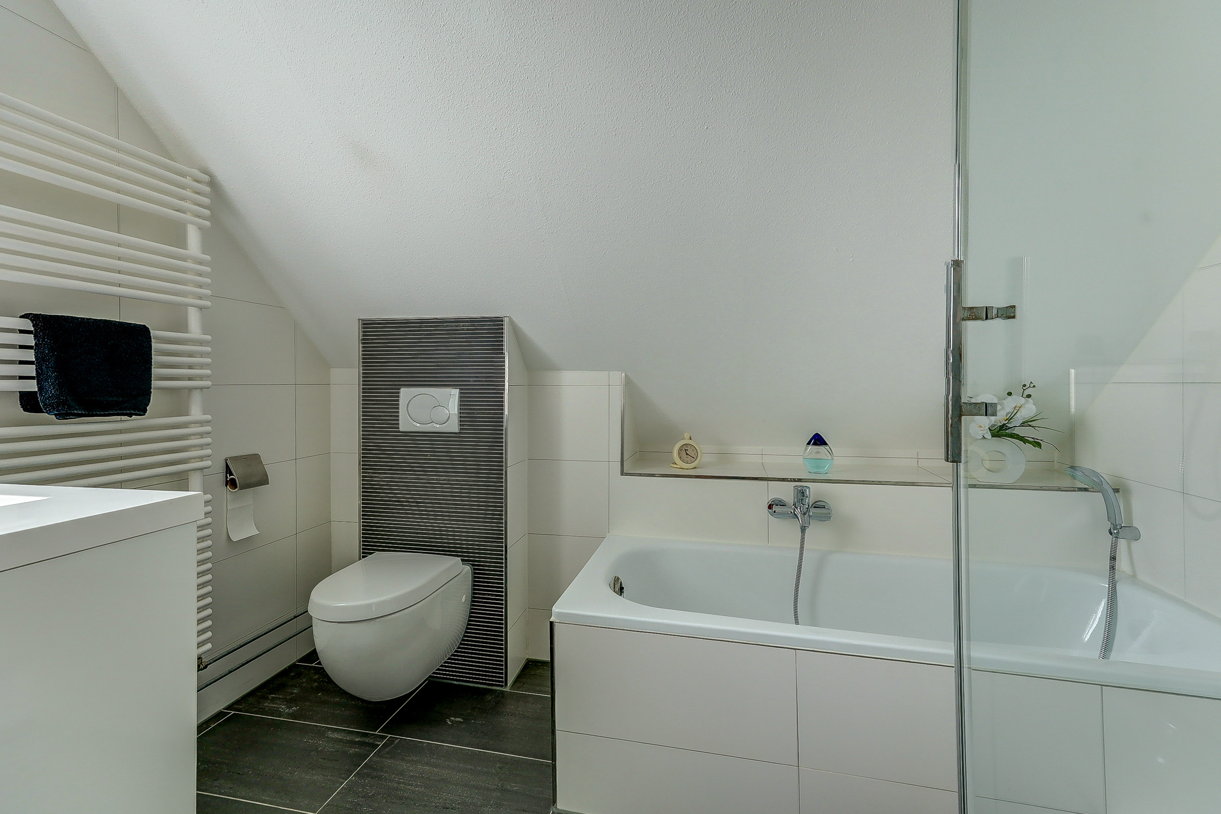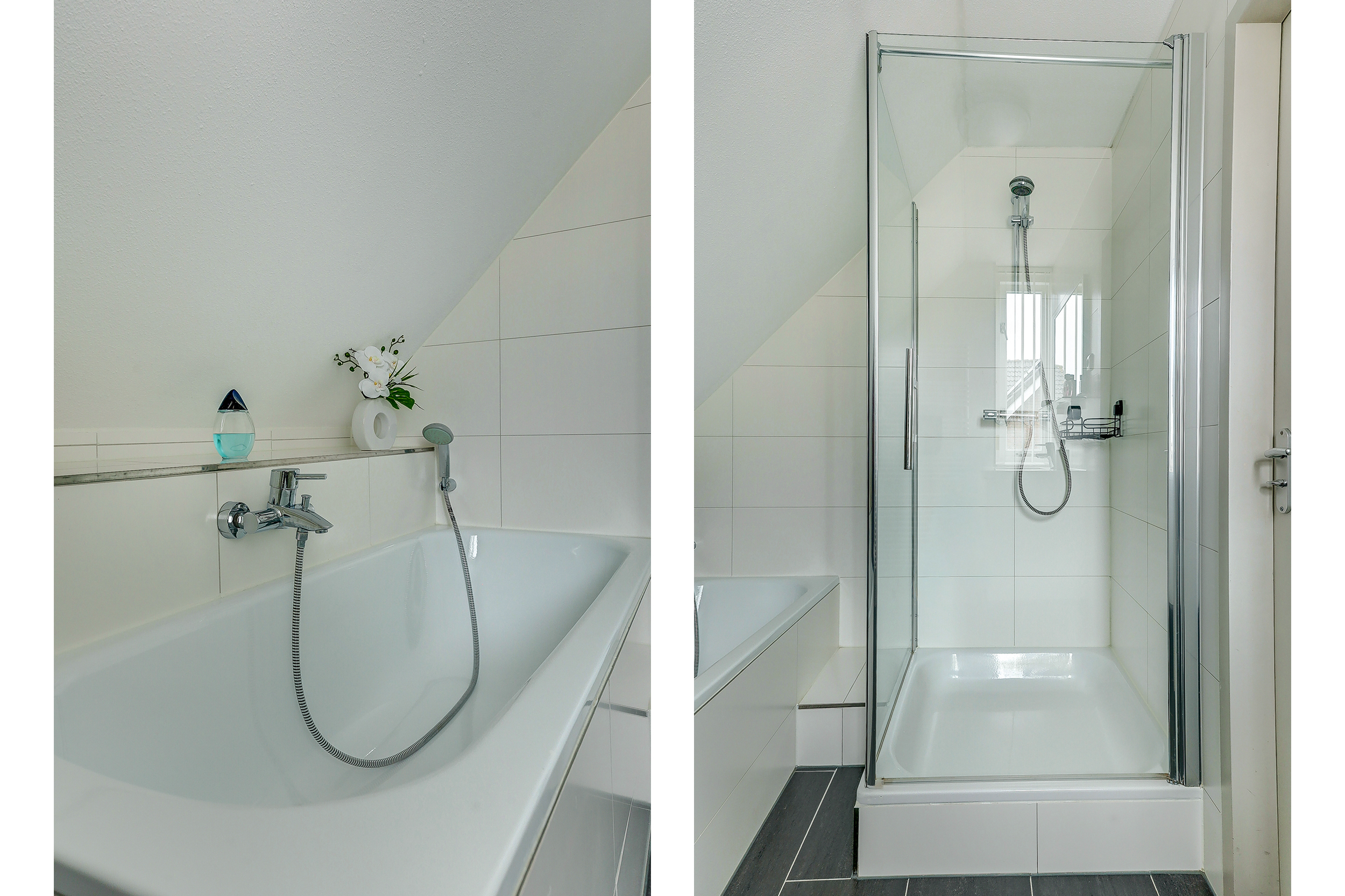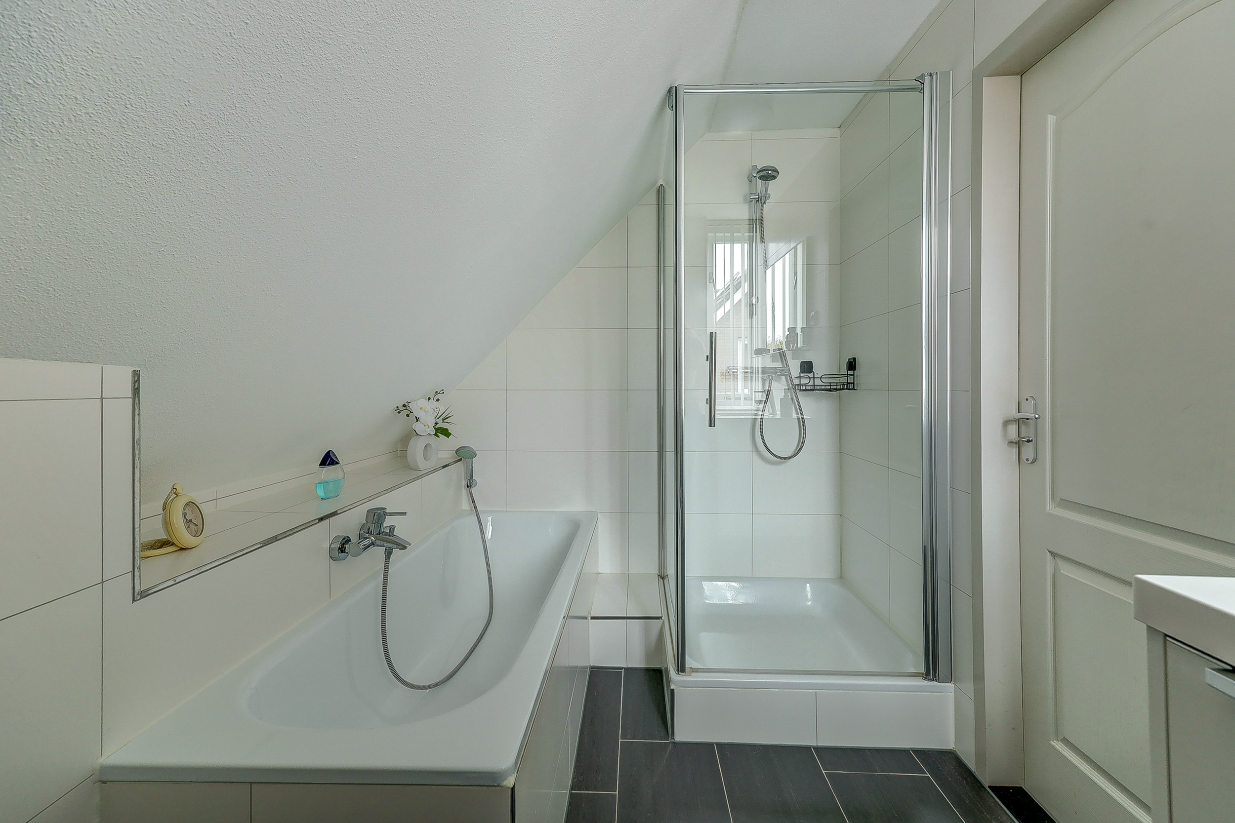 De badkamer is netjes afgewerkt en voorzien van alle gemakken: een ligbad, aparte douche, wastafel met modern meubel en een toilet. Een fijne, complete ruimte waar je de dag ontspannen kunt beginnen of eindigen.