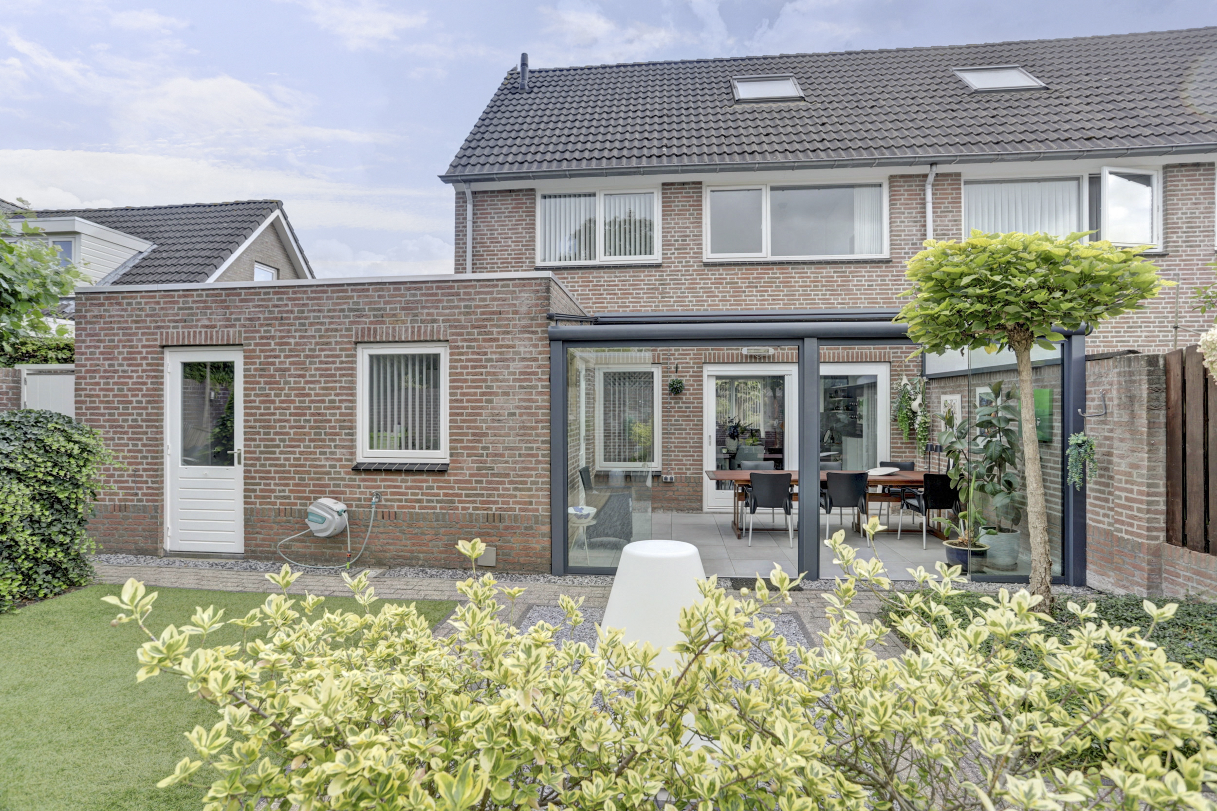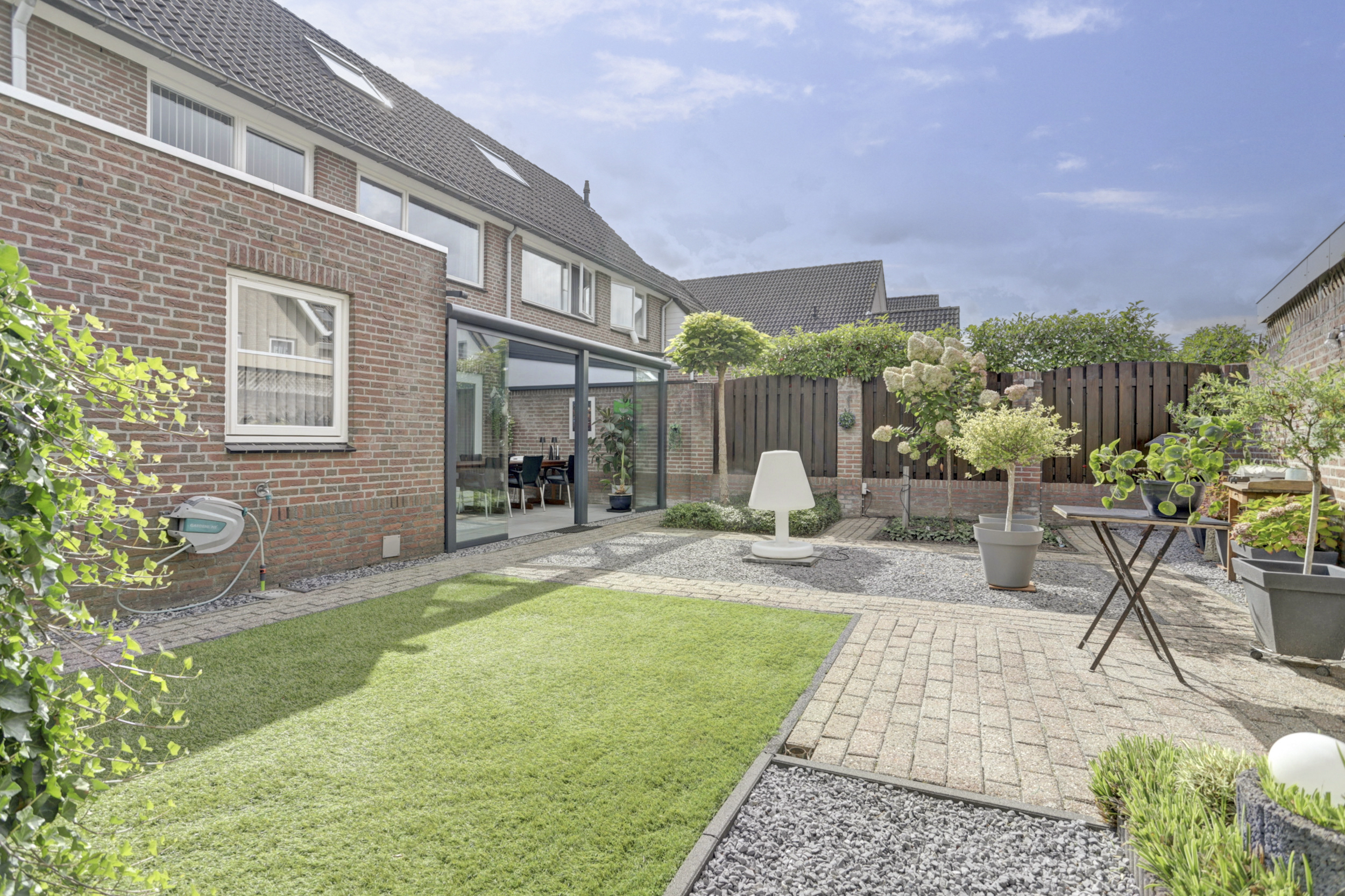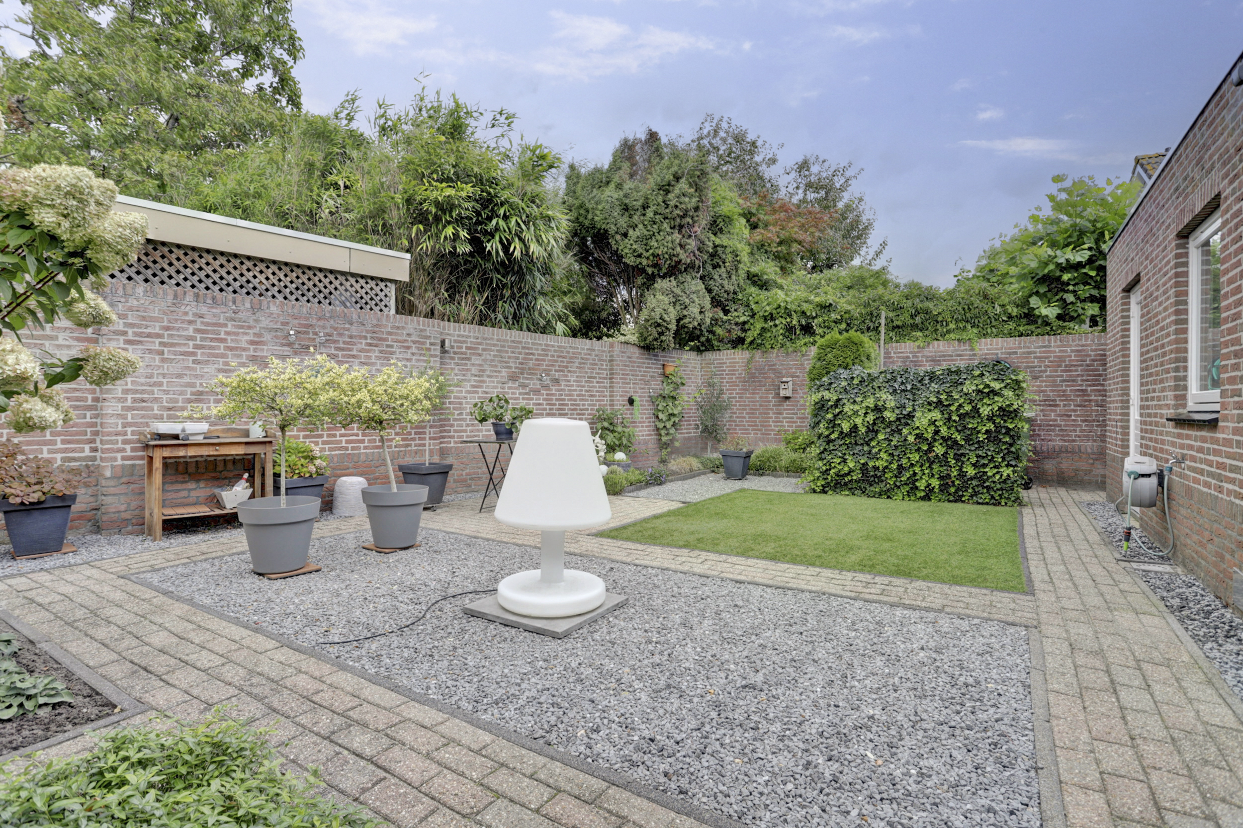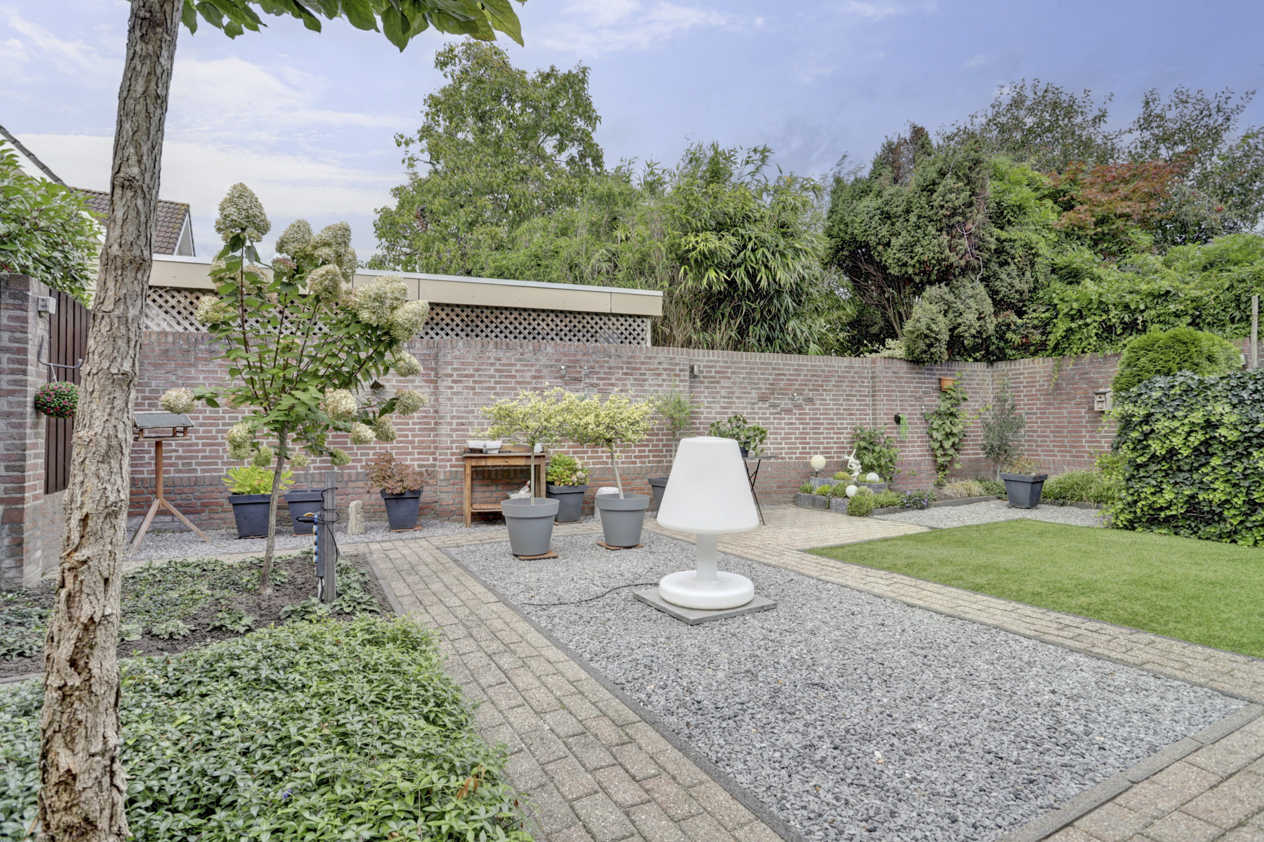 De modern aangelegde achtertuin is een fijne plek om te ontspannen. Dankzij de combinatie van groenperkjes, sierbestrating en kiezelzones heeft de tuin een verzorgde uitstraling. De tuin is breed bemeten en biedt meerdere mogelijkheden voor het plaatsen van een eettafel of loungeset – ideaal voor wie op elk moment van de dag een zonnige zitplek wil vinden. Door de groene omgeving geniet je hier van veel privacy. Bovendien is er een praktische achterom naast de woning, wat het gemakkelijk maakt om met fietsen, tuinspullen of afvalcontainers de tuin te bereiken.