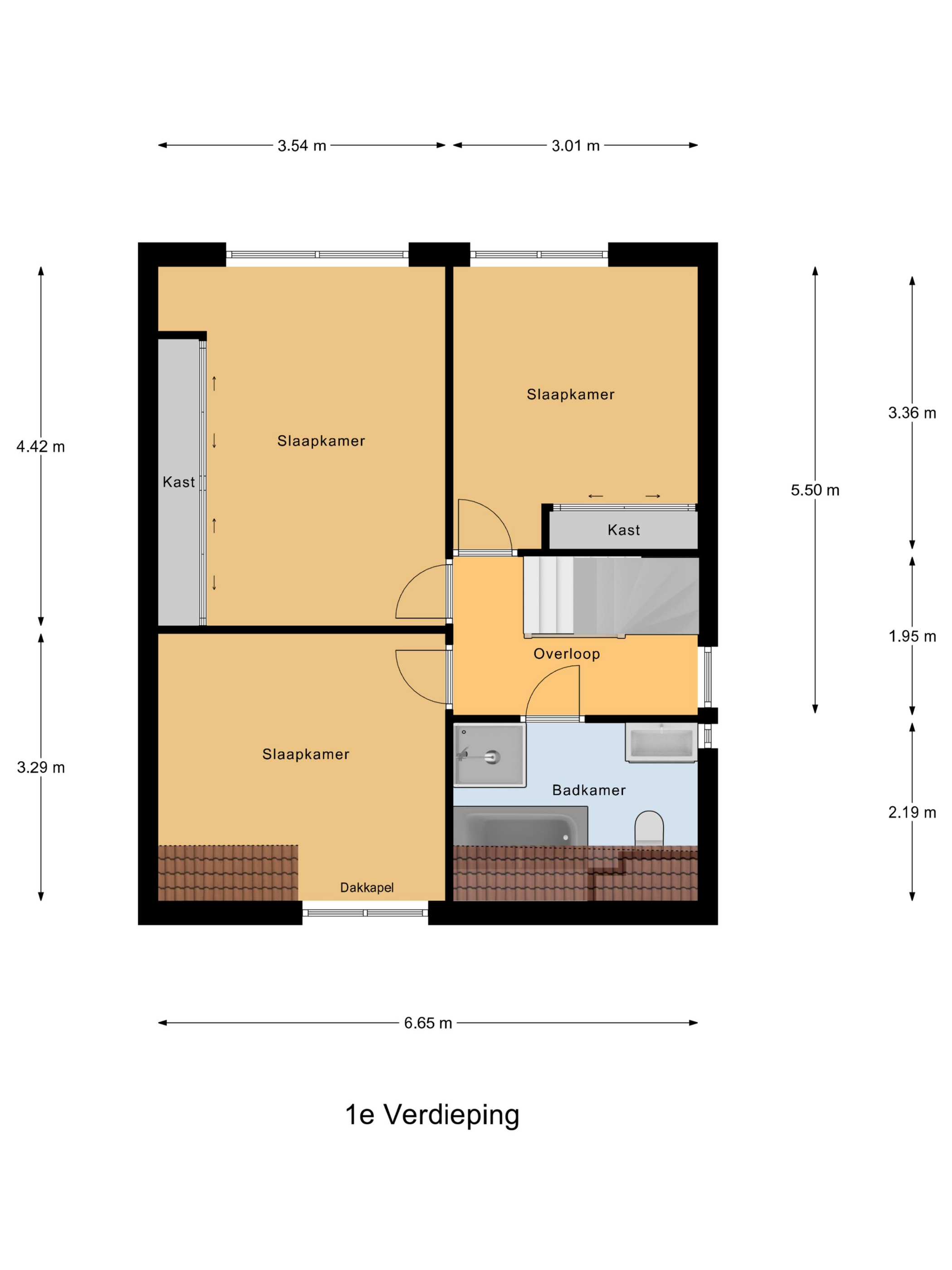 Via de vaste trap bereiken we de eerste verdieping, waar een praktische en comfortabele indeling wacht. Hier bevinden zich drie volwaardige slaapkamers en een complete badkamer. De hoofdslaapkamer is ruim van formaat en biedt meer dan voldoende plek voor een groot tweepersoonsbed met nachtkastjes. Een ingebouwde kledingkast zorgt voor extra gemak en biedt royale opbergruimte voor kleding, schoenen en andere spullen.