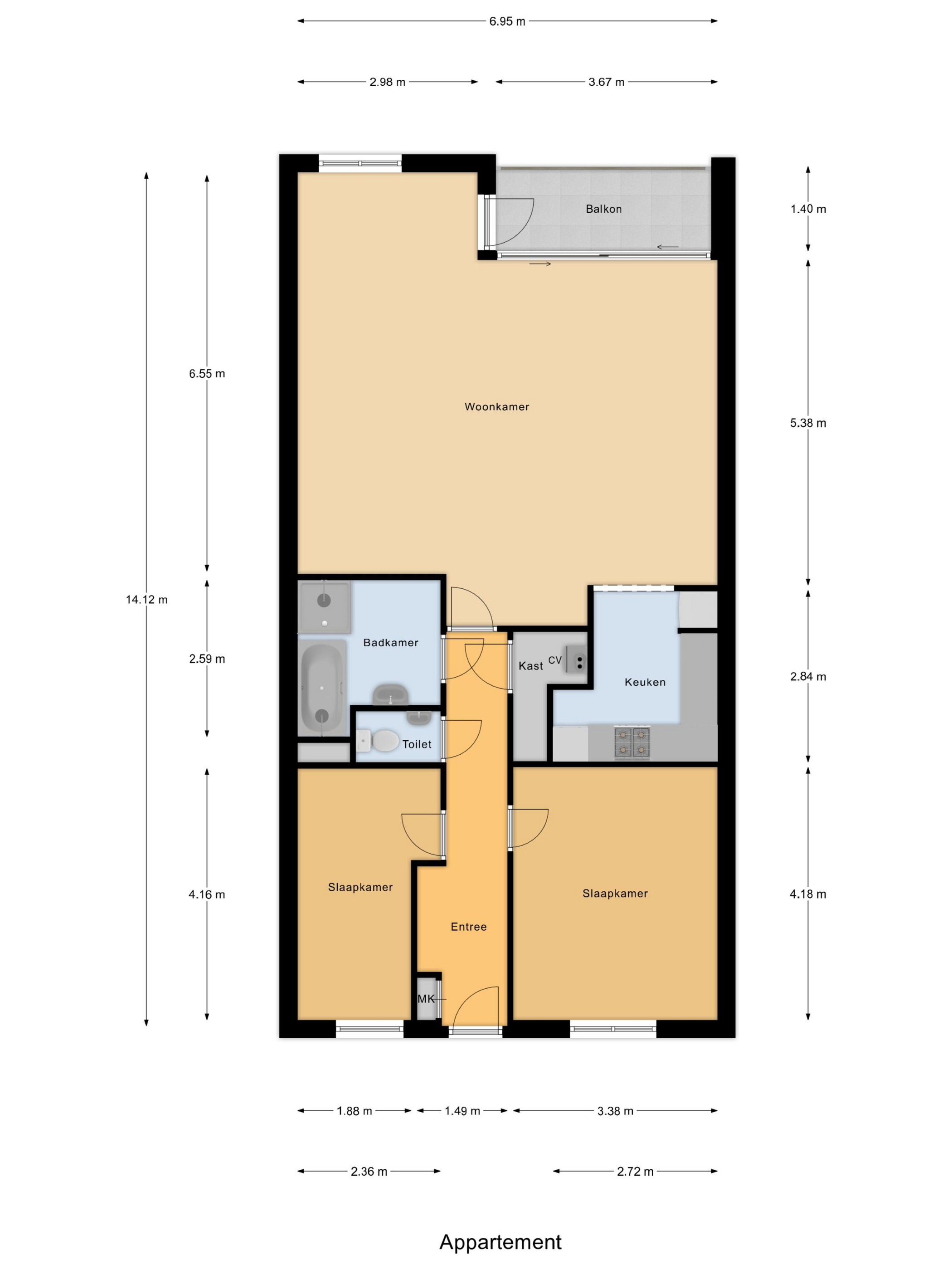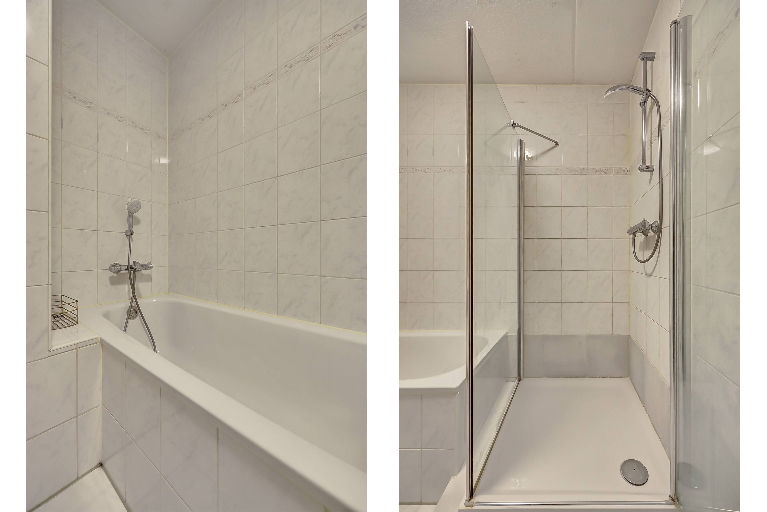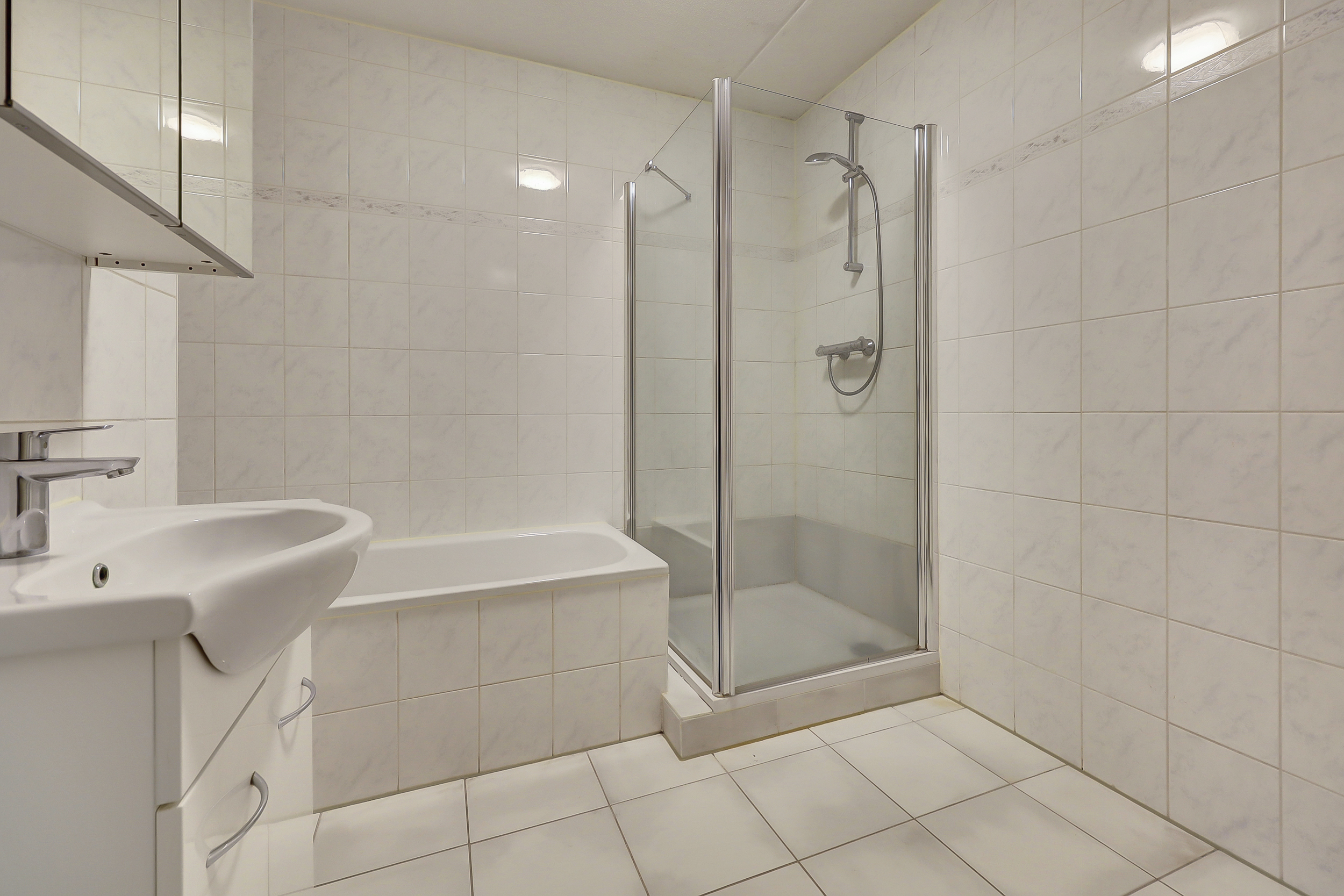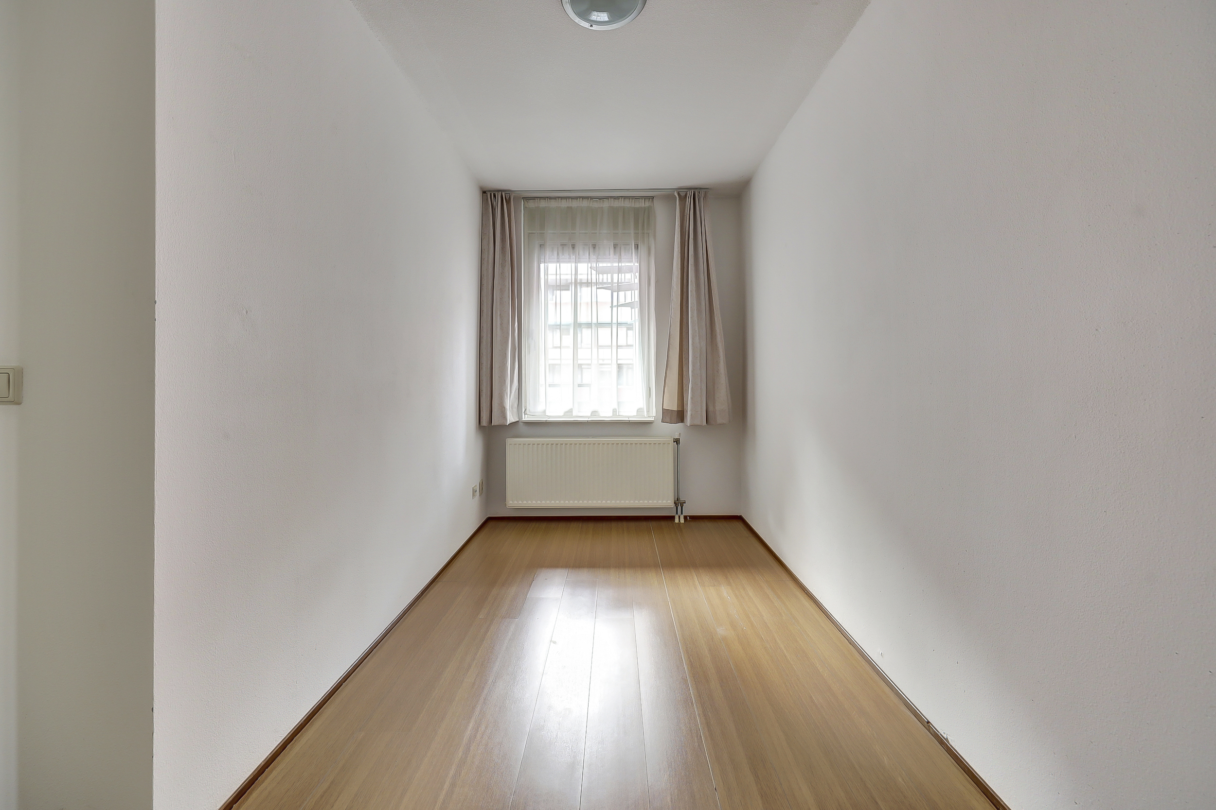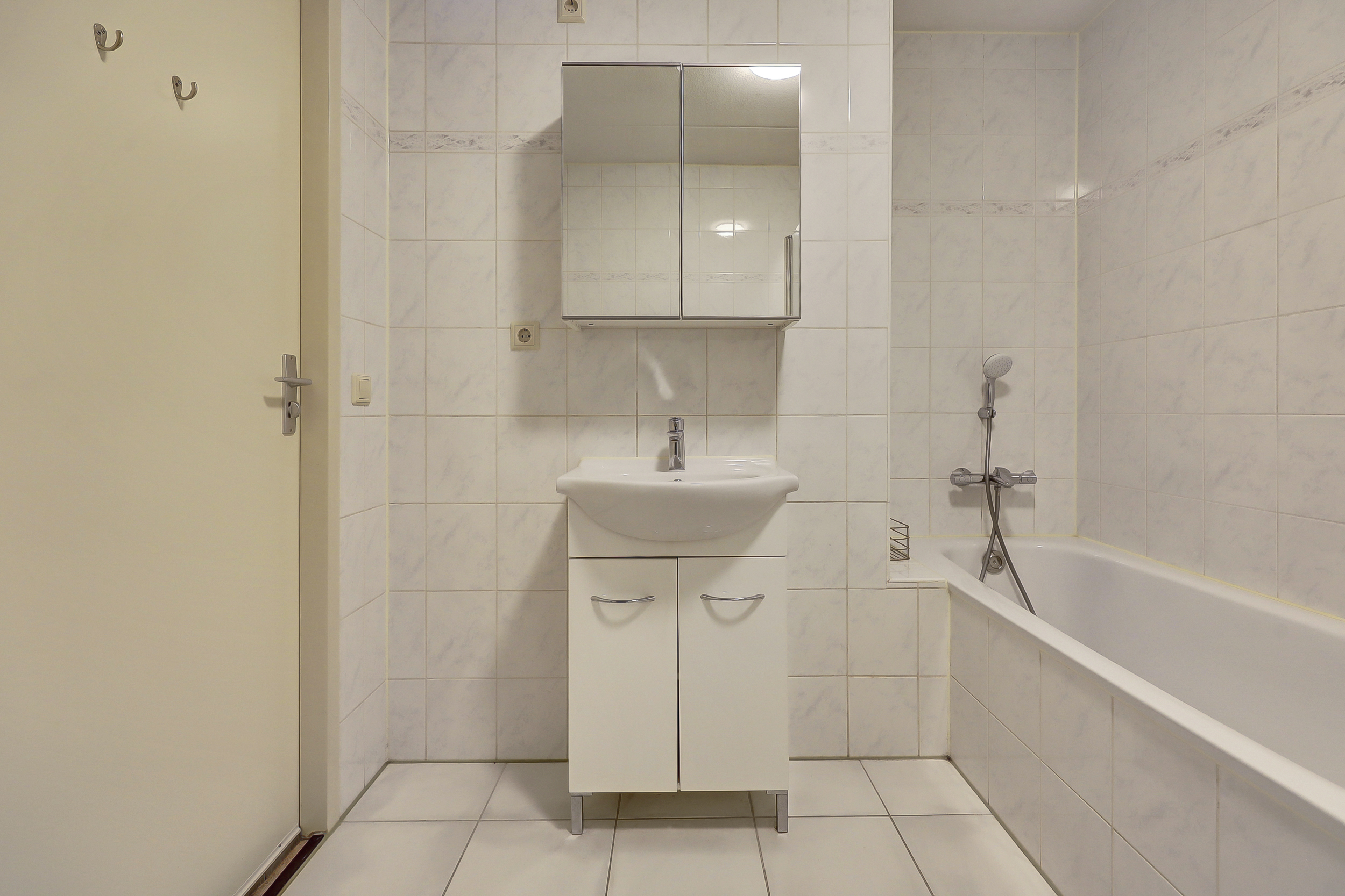 Aan de achterzijde bevinden zich de twee slaapkamers, beide van goed formaat. De badkamer, bereikbaar vanuit de hal, is compleet uitgerust met een ligbad, douche en wastafel. Daarnaast beschikt het appartement over een praktische berging met ruimte voor de wasmachine, droger en de cv-installatie.