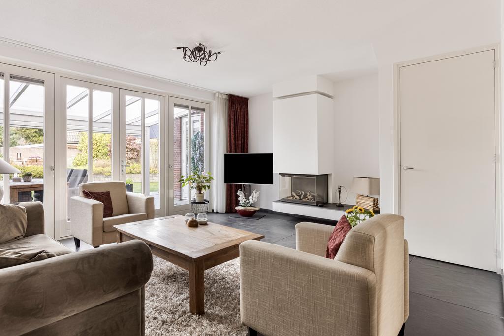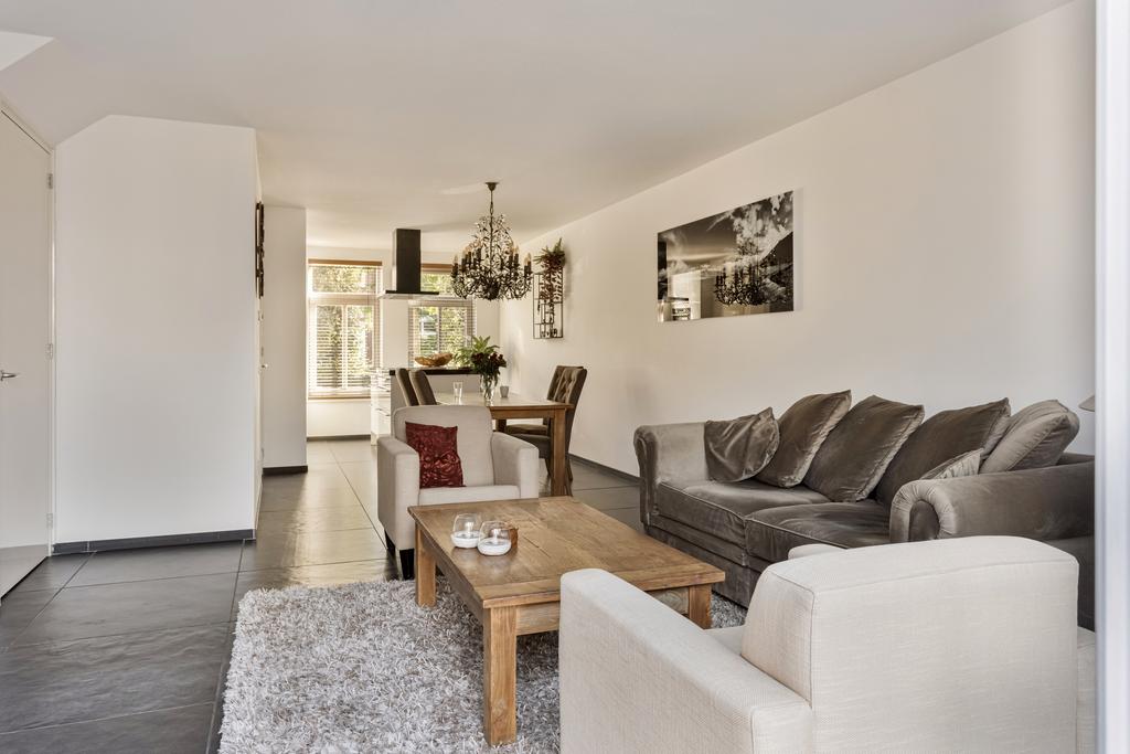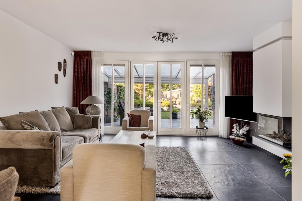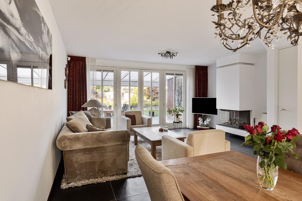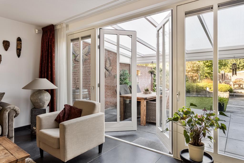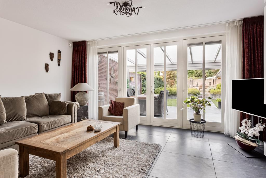 - Sfeervolle woonkamer met toegang tot de overkapping en tuin;