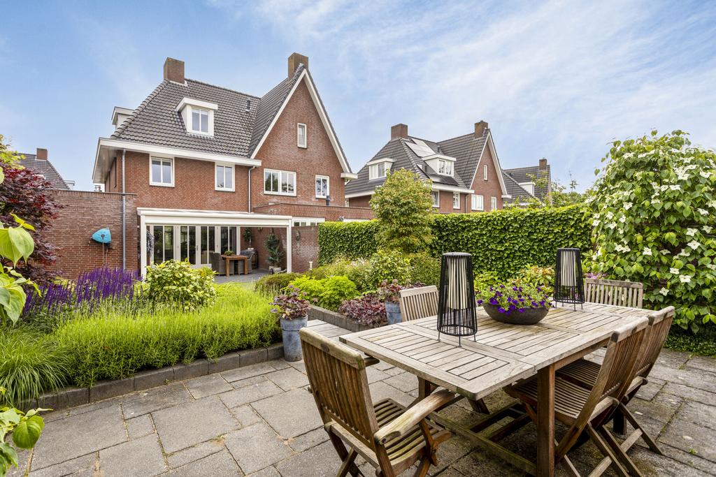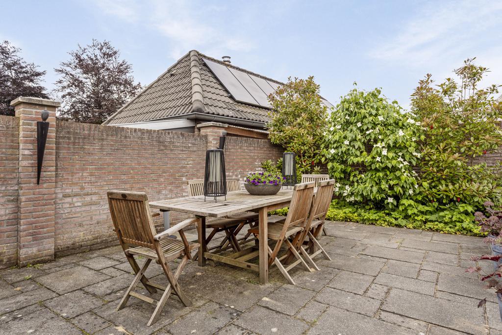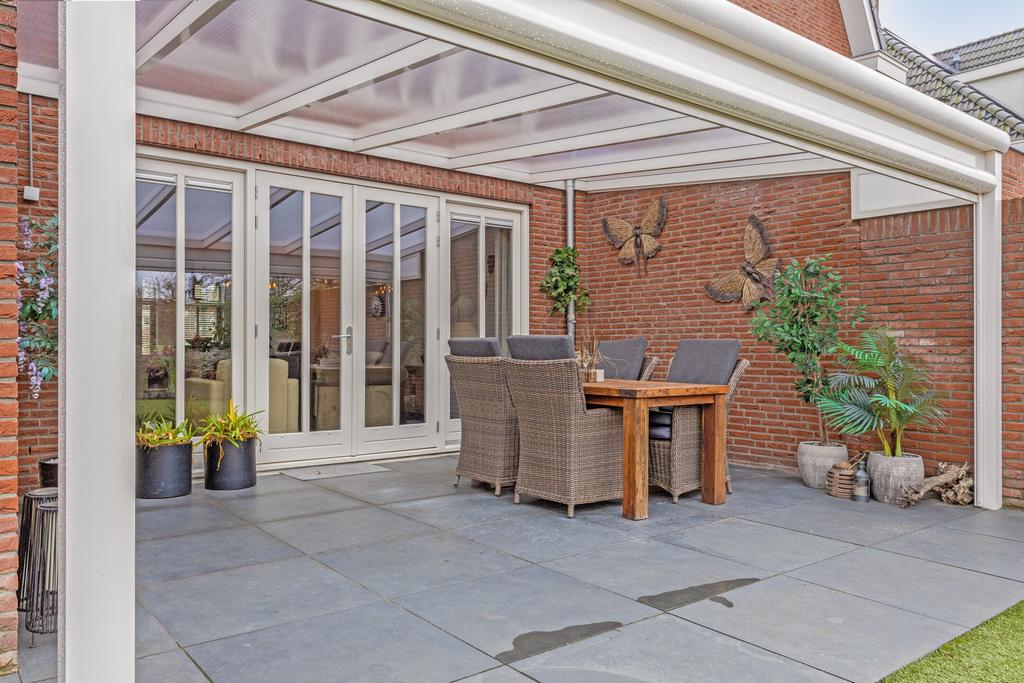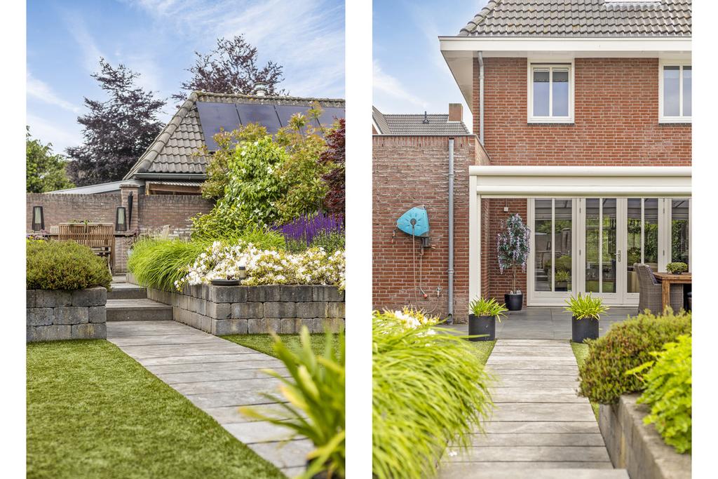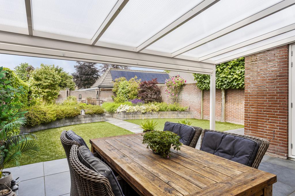 Via de dubbele deuren in de woonkamer komt u in de diepe achtertuin. Hier vindt u een overkapping welke ook te gebruiken is als luxe tuinkamer. De tuin is in westelijke richting gelegen, waardoor u gedurende de dag veel van zonlicht kunt genieten in de tuin. Ook is de woning voorzien van een aangebouwde garage waar plaats is voor één auto. Ook voor een tweede auto is plaats op de oprit voor het huis.