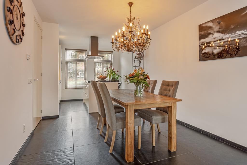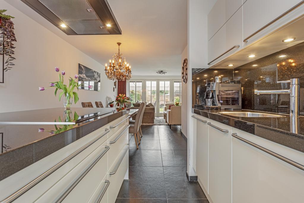 Bij binnenkomst treft u een lichte entreehal met bergkast voor bijvoorbeeld een garderobe, meterkast, toiletruimte, trapopgang naar de eerste verdieping en de deur naar de woonkamer. De ruime woonkamer is erg sfeervol dankzij de gashaard. Ook zorgen de grote raampartijen voor erg veel lichtinval in deze ruimte en ook de tuin is via de woonkamer te bereiken dankzij de openslaande deuren naar buiten. Grenzend aan de woonkamer is de open keuken te vinden voorzien van allerhande apparatuur en een kookeiland.