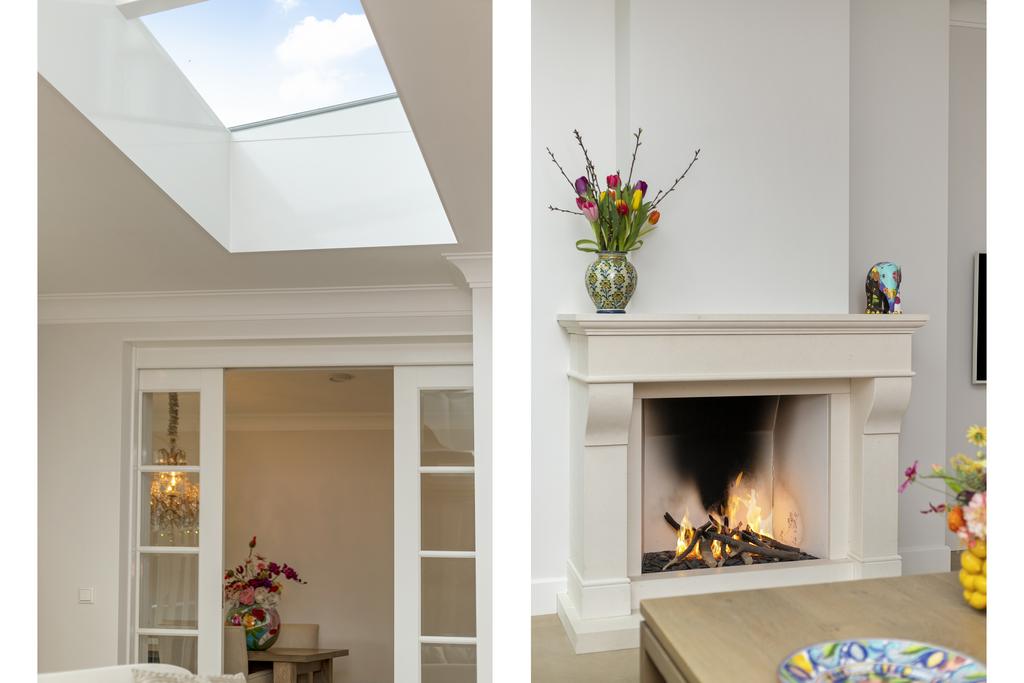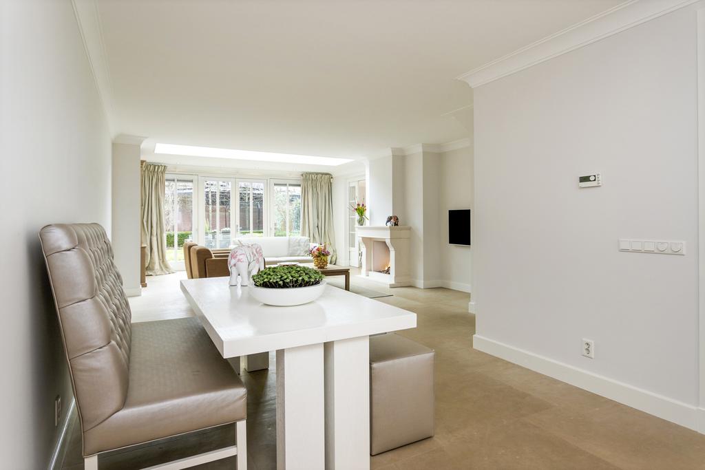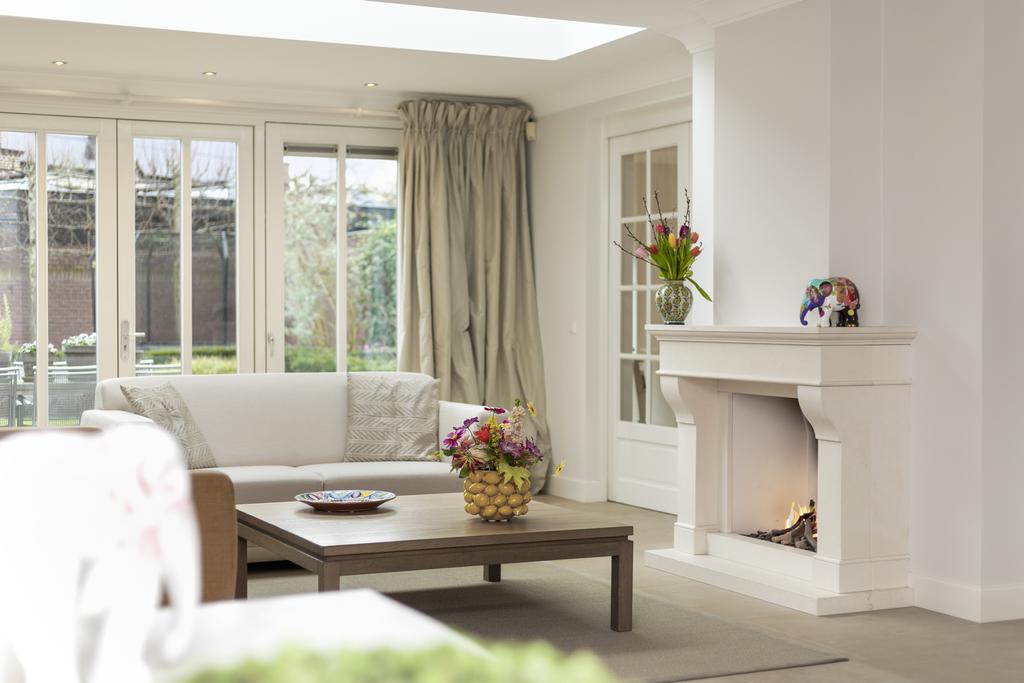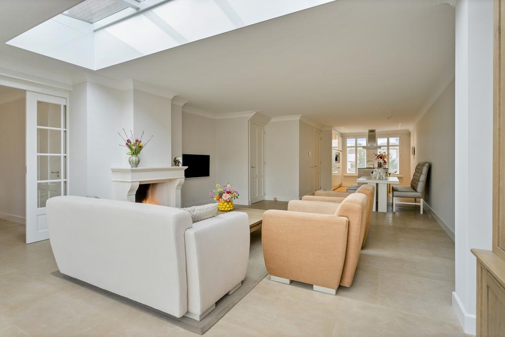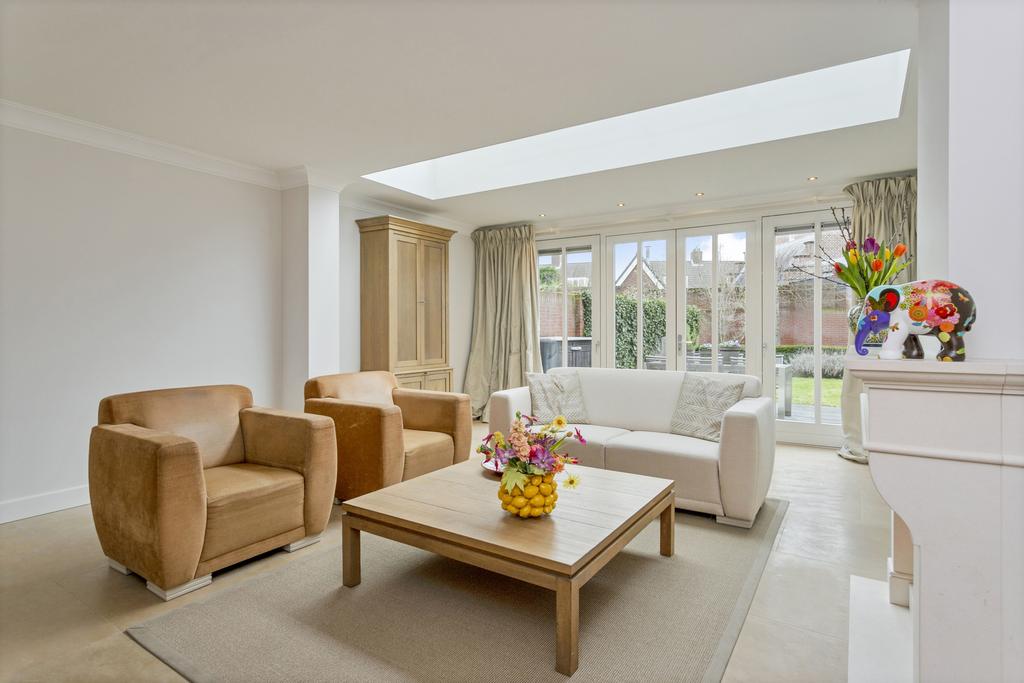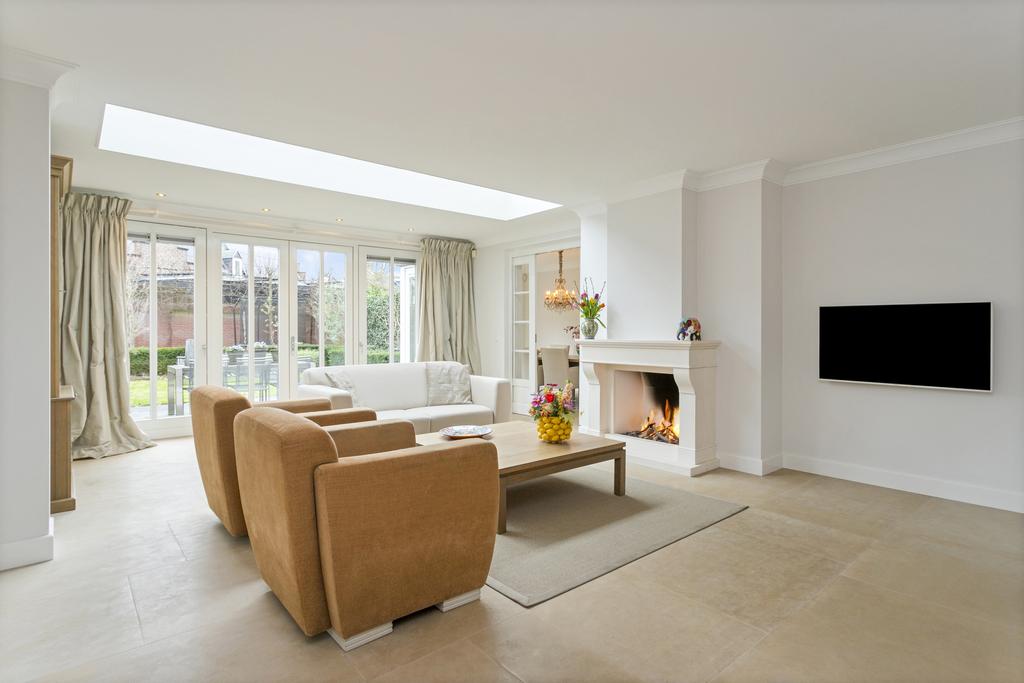 De woonkamer is bereikbaar vanuit de hal en geeft op zijn beurt toegang tot de aangrenzende eetkamer. Deze is middels schuifdeuren afsluitbaar, waardoor deze ruimte, met buitendeur en deur naar garage / berging, tevens een prettige werkruimte of speelkamer zou kunnen zijn. De beide kamers kennen een fijne lichtinval door de grote raampartijen aan de achter-/tuinzijde van de woning. Ter plaatse van het zitgedeelte zorgt een gashaard met fraaie natuurstenen schouw voor extra sfeer en warmte. Via de openslaande tuindeuren bereikt u de gezellige achtertuin. De lichtstraat bij het zitgedeelte brent extra lichtinval en zorgt voor een ruimtelijk effect. Erg praktisch is de trap-/provisiekast welke vanuit de woonkamer toegankelijk is. De vloer is doorlopend en betreft een fraaie Portugeese natuurstenen vloer in combinatie met vloerverwarming.
