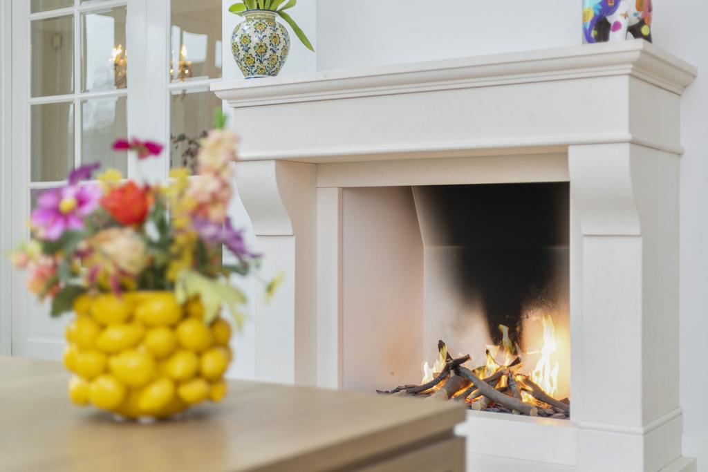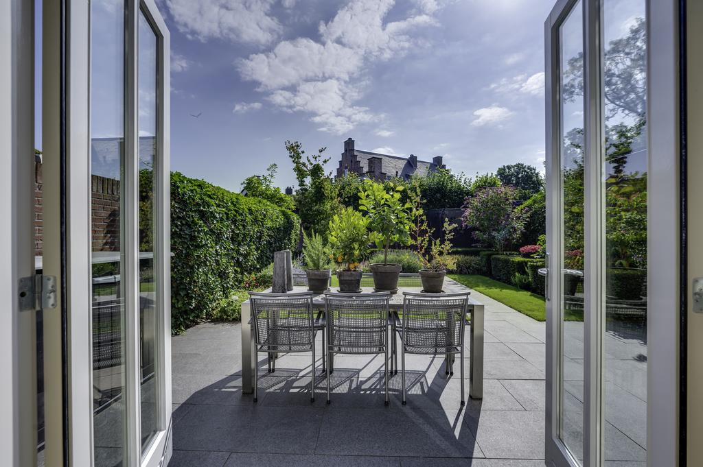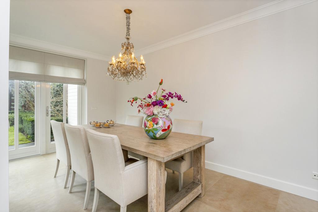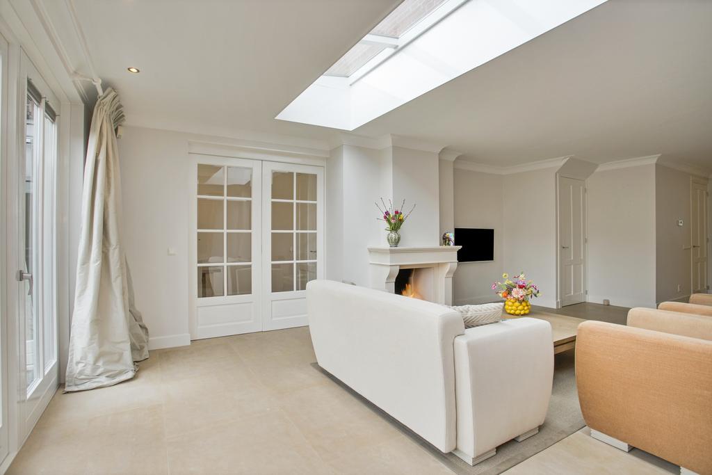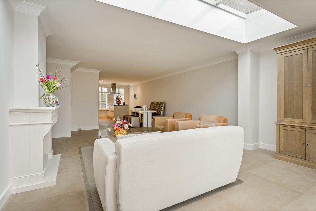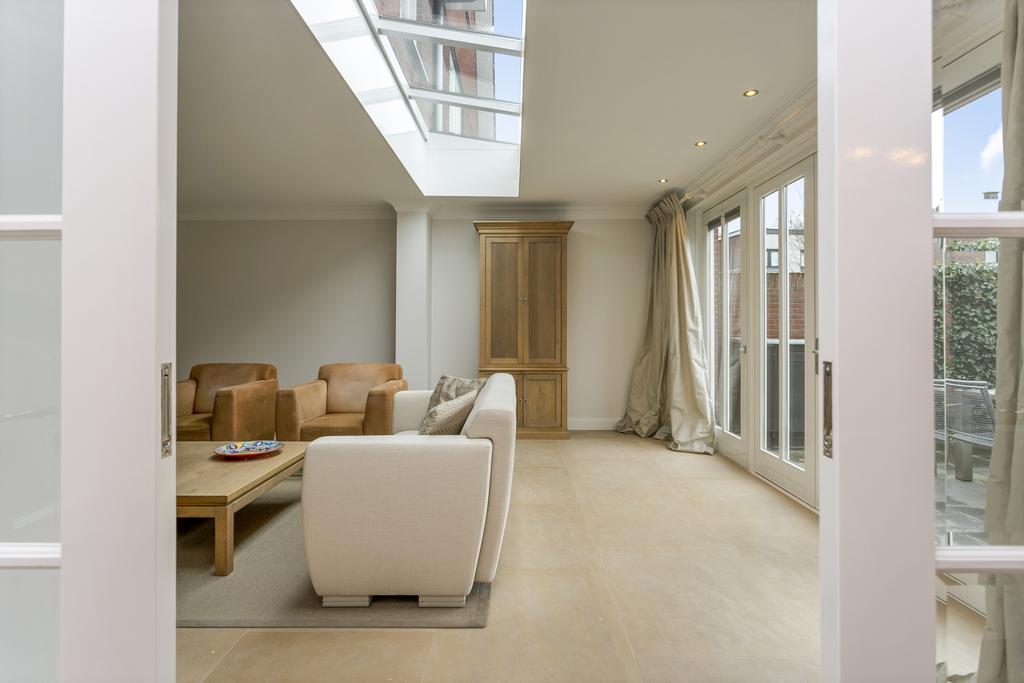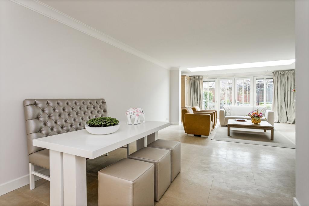 De woonkamer is bereikbaar vanuit de hal en geeft op zijn beurt toegang tot de aangrenzende eetkamer. Deze is middels schuifdeuren afsluitbaar, waardoor deze ruimte, met buitendeur en deur naar garage / berging, tevens een prettige werkruimte of speelkamer zou kunnen zijn. De beide kamers kennen een fijne lichtinval door de grote raampartijen aan de achter-/tuinzijde van de woning. Ter plaatse van het zitgedeelte zorgt een gashaard met fraaie natuurstenen schouw voor extra sfeer en warmte. Via de openslaande tuindeuren bereikt u de gezellige achtertuin. De lichtstraat bij het zitgedeelte brent extra lichtinval en zorgt voor een ruimtelijk effect. Erg praktisch is de trap-/provisiekast welke vanuit de woonkamer toegankelijk is. De vloer is doorlopend en betreft een fraaie Portugeese natuurstenen vloer in combinatie met vloerverwarming.
