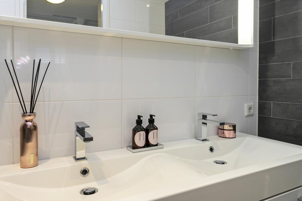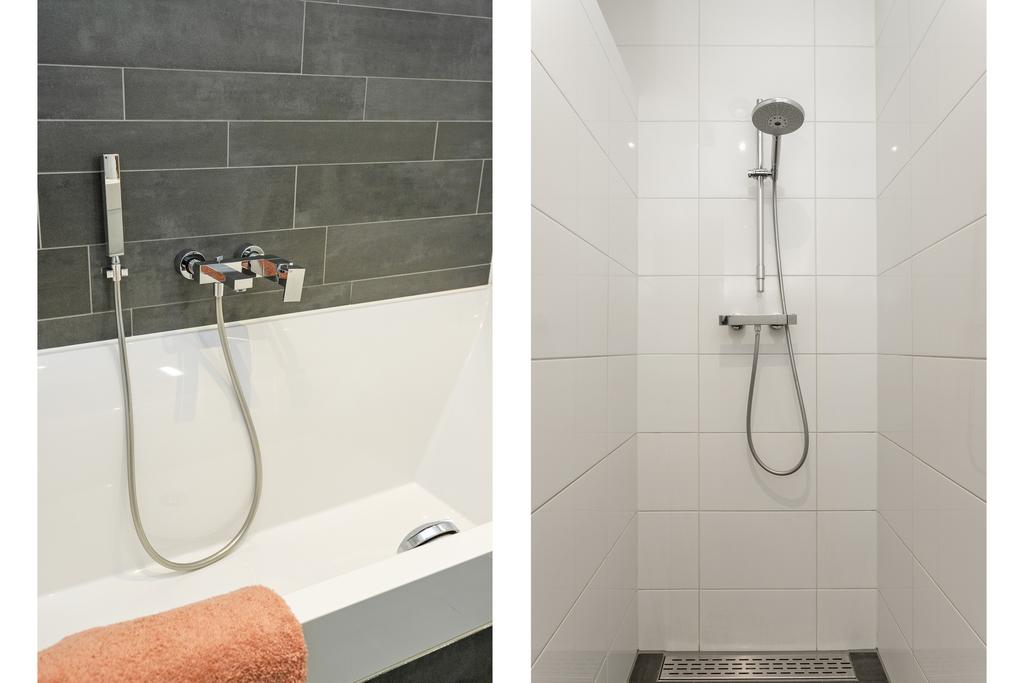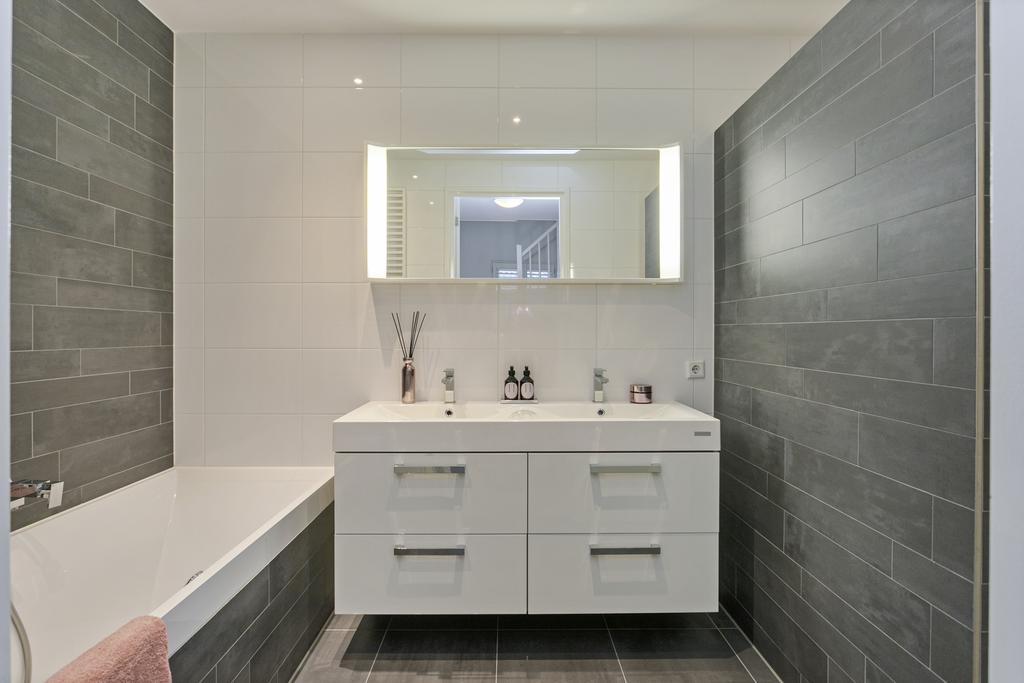De volledig betegelde badkamer is zeer praktisch ingericht en beschikt over een ligbad, een dubbel wastafelmeubel waarboven een spiegel en een inloopdouche met thermosstaatkraan. Verder is er een designradiator aanwezig en is het stucwerk plafond voorzien van inbouwspots. De naastgelegen separate toiletruimte is in dezelfde stijl afgewerkt als de badkamer en is ingericht met een wandcloset en fonteintje. Zowel de badkamer als de toiletruimte zijn voorzien van